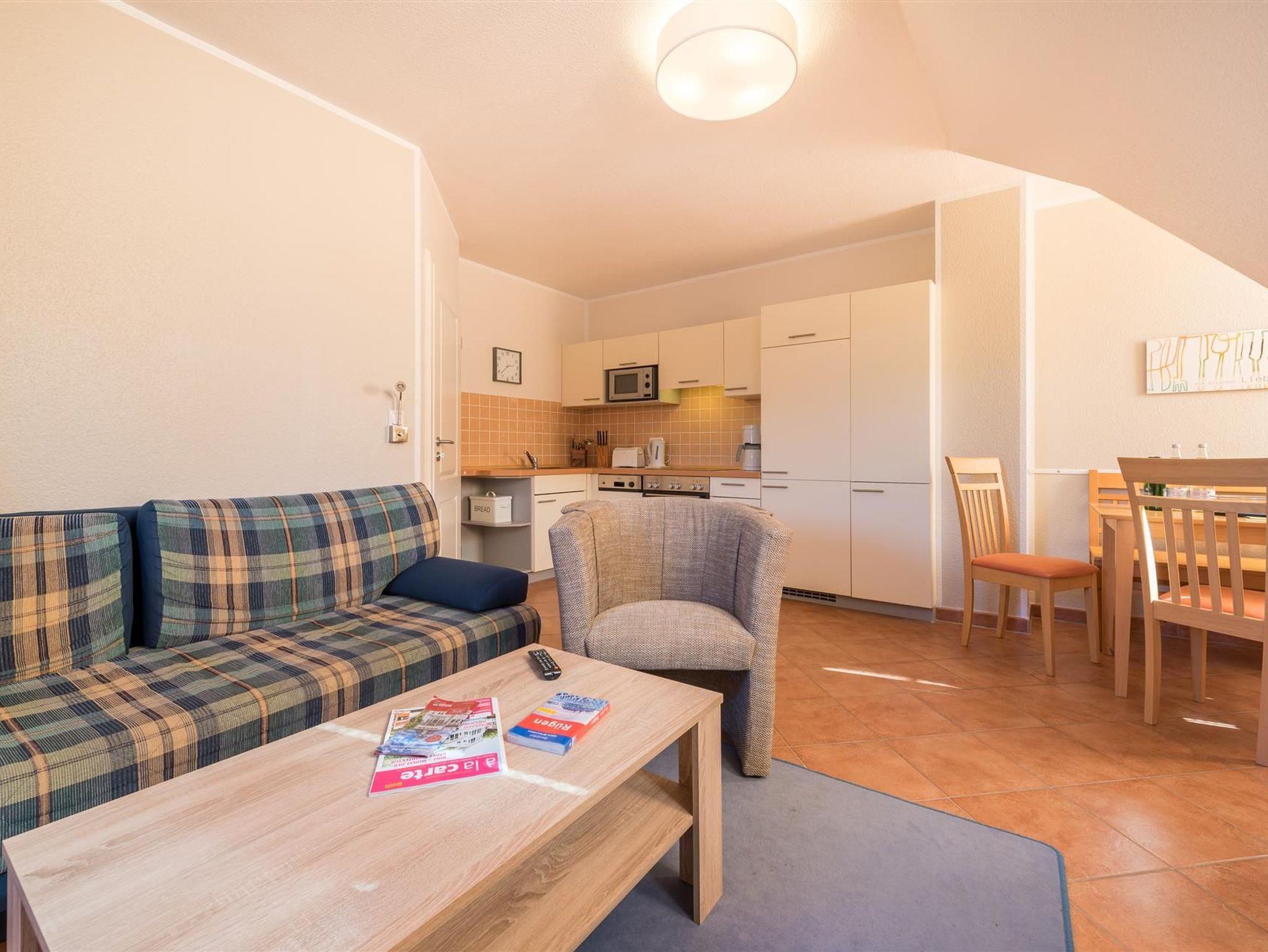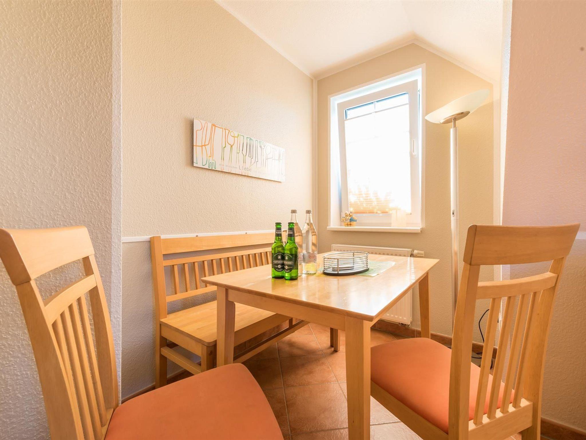 Wohn-/Esszimmer mit hochwertiger Einbauküche (4 Ceranfelder, Kühlschrank mit Eisfach, Herd, Geschirrspüler, Mikrowelle, Wasserkocher, Kaffeemaschine und Toaster) und Essplatz für 4 Personen