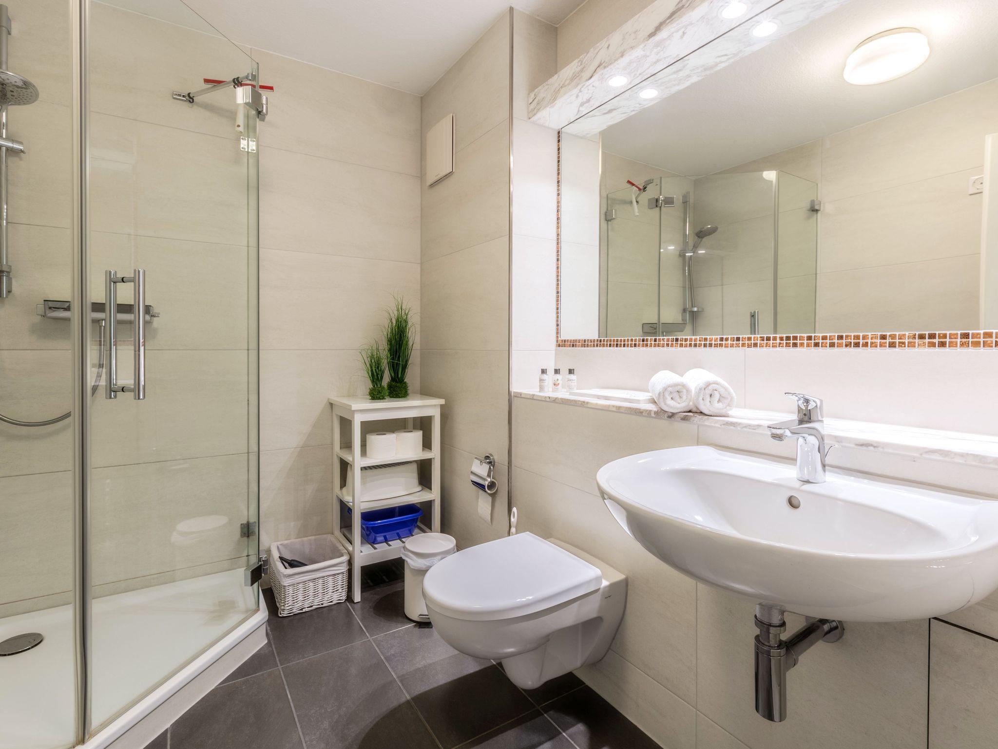 Das helle Badezimmer verfügt über eine Dusche und ein Fön ist ebenfalls vorhanden.