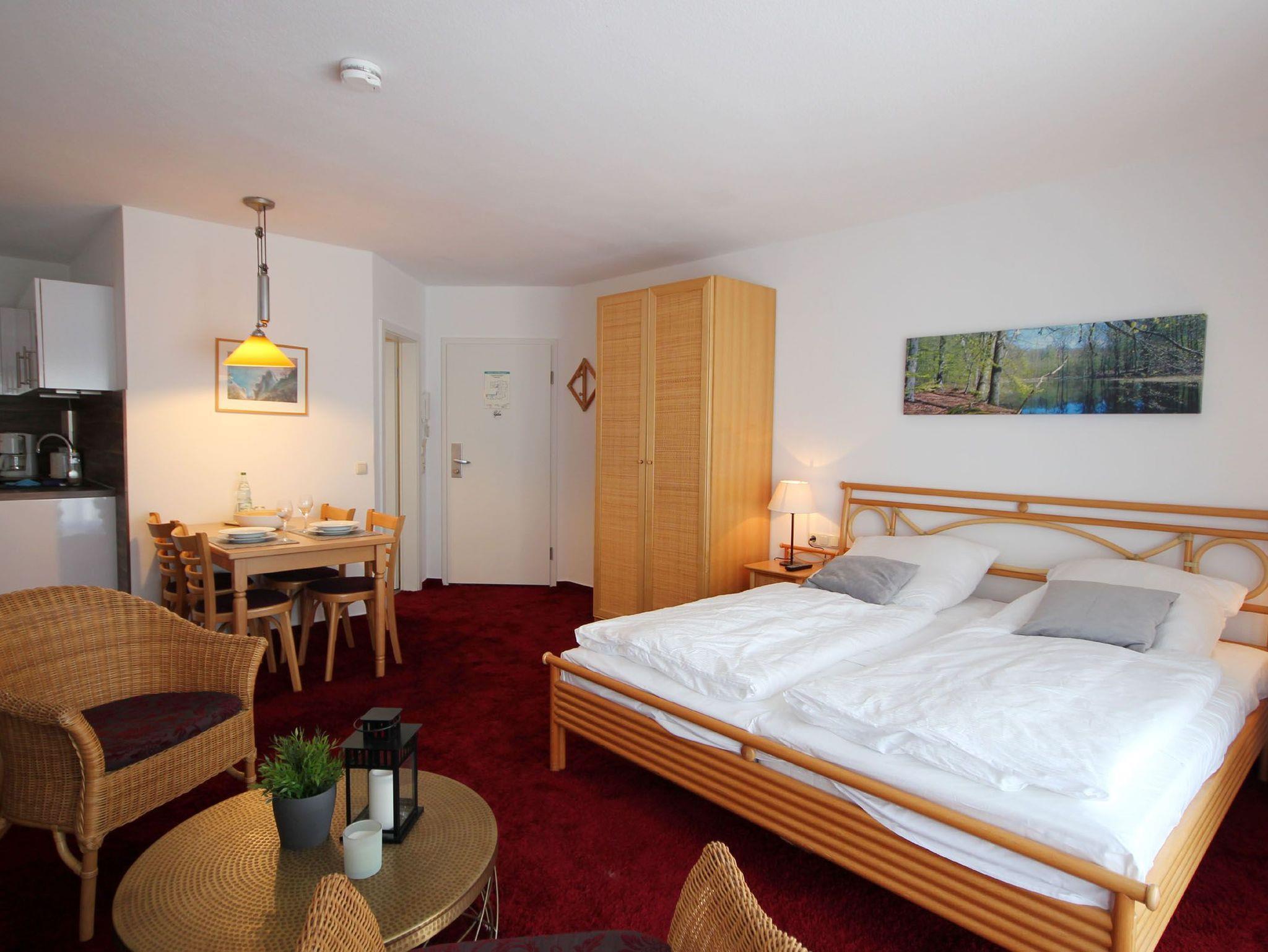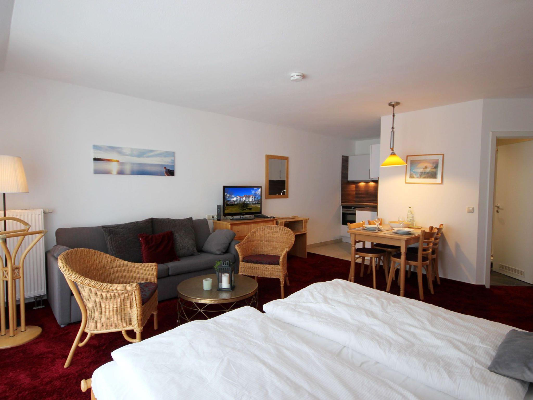 Moderne 1-Zimmer-Ferienwohnung in Binz mit Balkon und seitlichem Meerblick, WLAN, Sauna und Parkplatz.