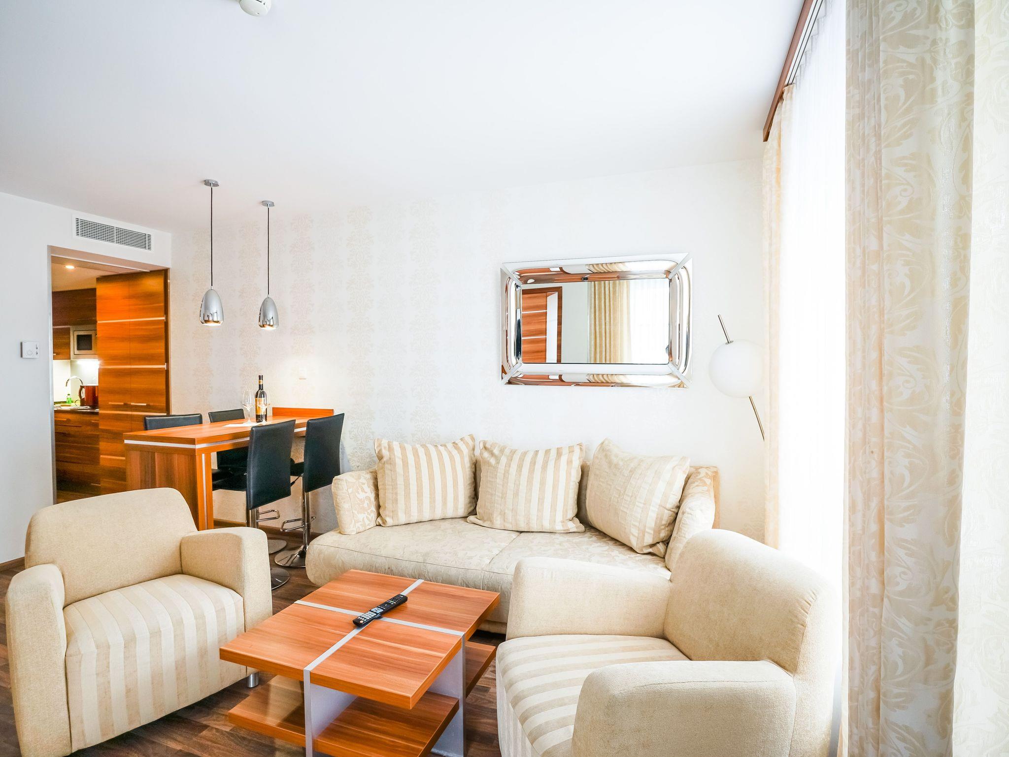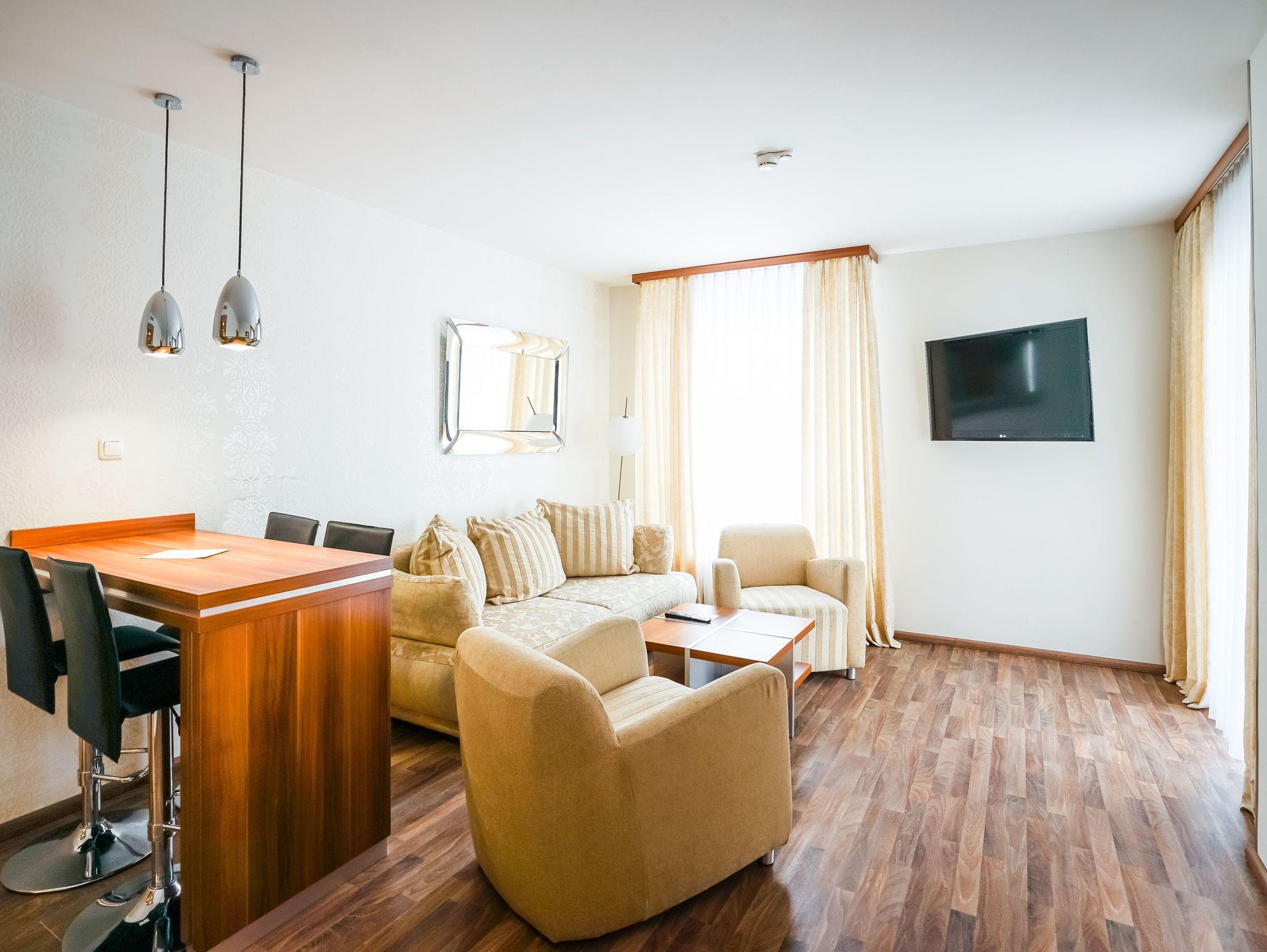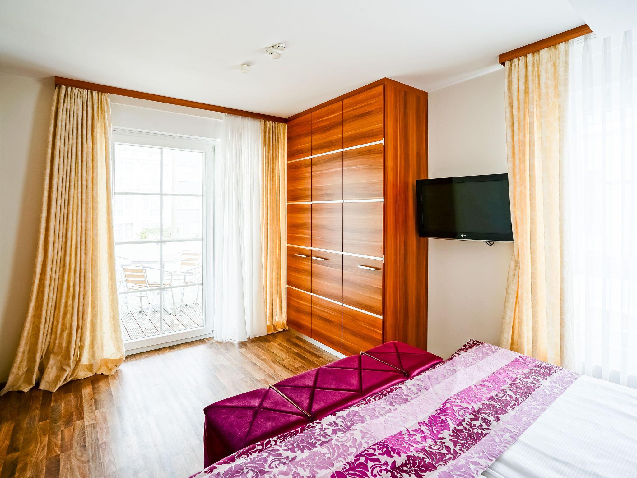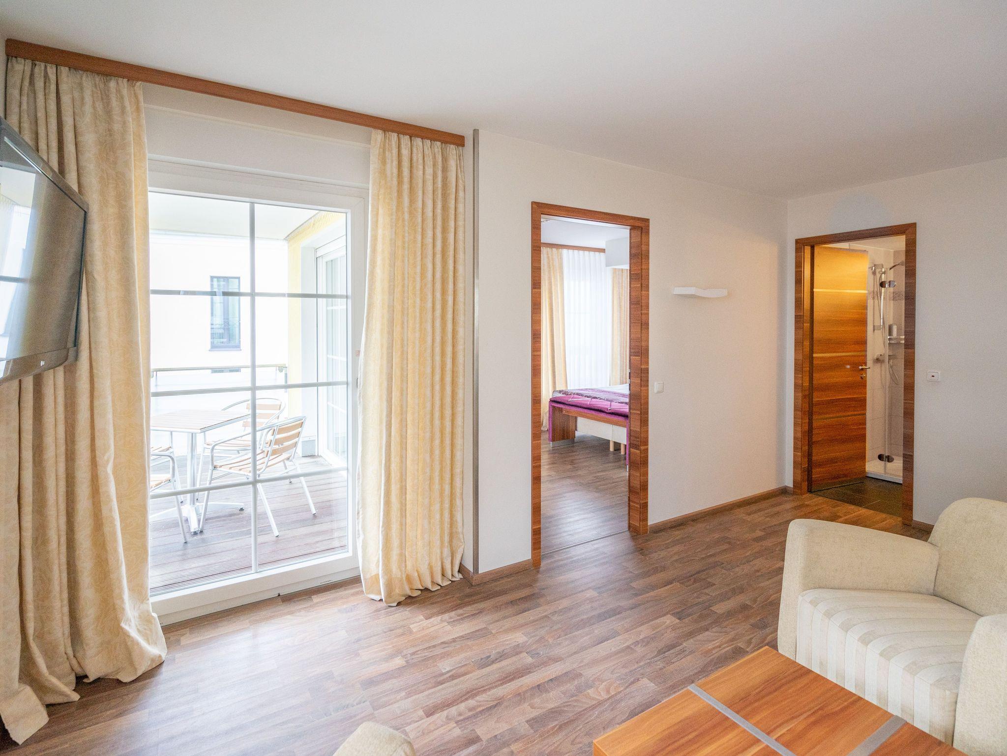 Unsere modernen Suite Apartments sind zwischen 40 und 43 qm groß und können von maximal zwei Erwachsenen und zwei Kindern bewohnt werden. Der Schlaf- und Wohnraum sind separat. Zu den Suite Apartments gehören standardmäßig entweder ein Balkon oder eine Terrasse.