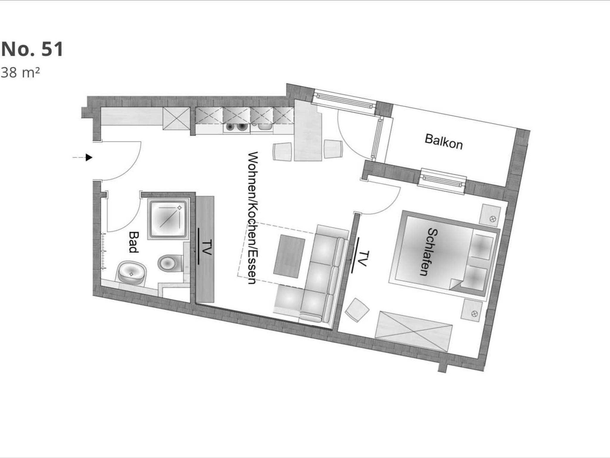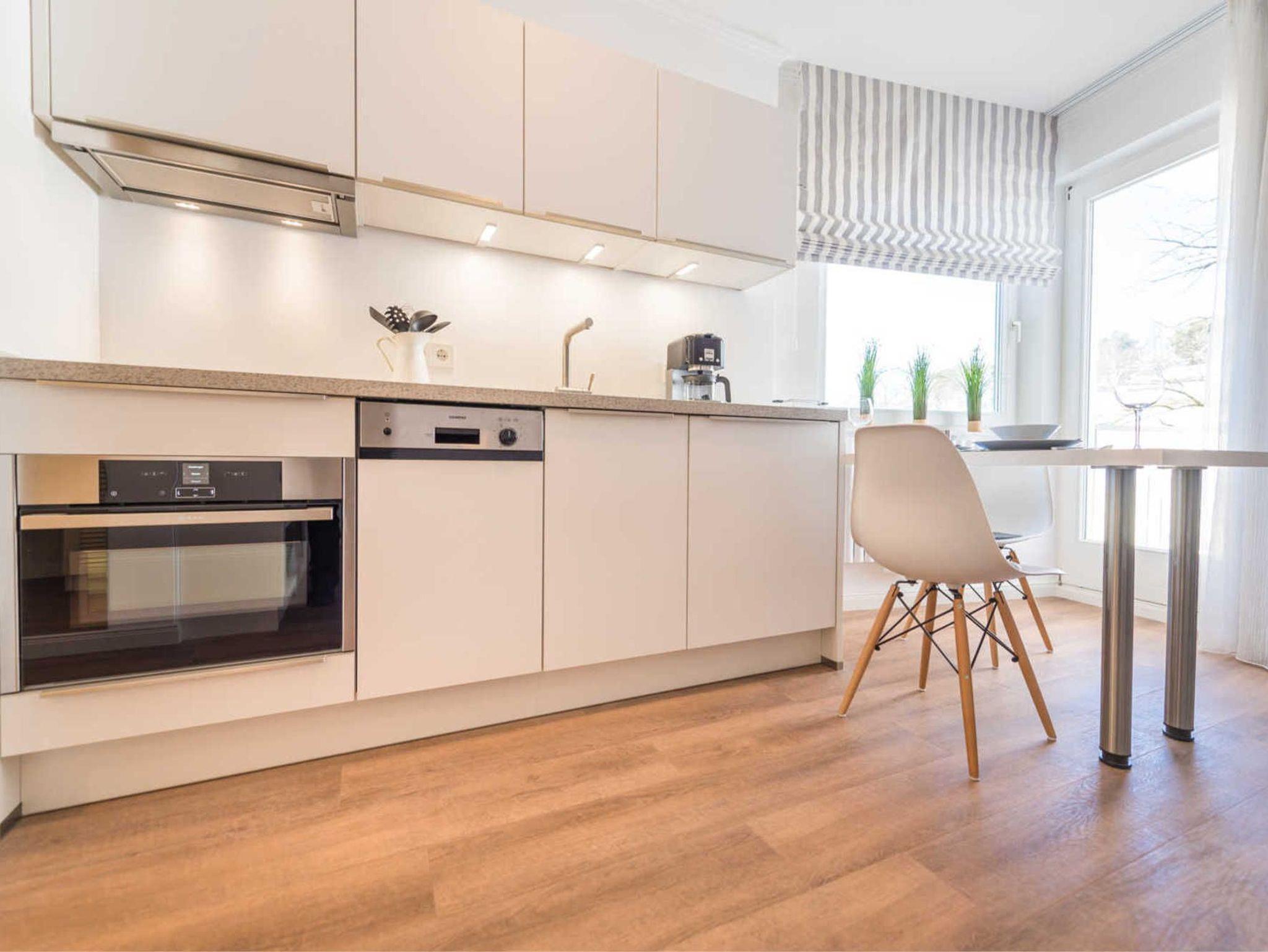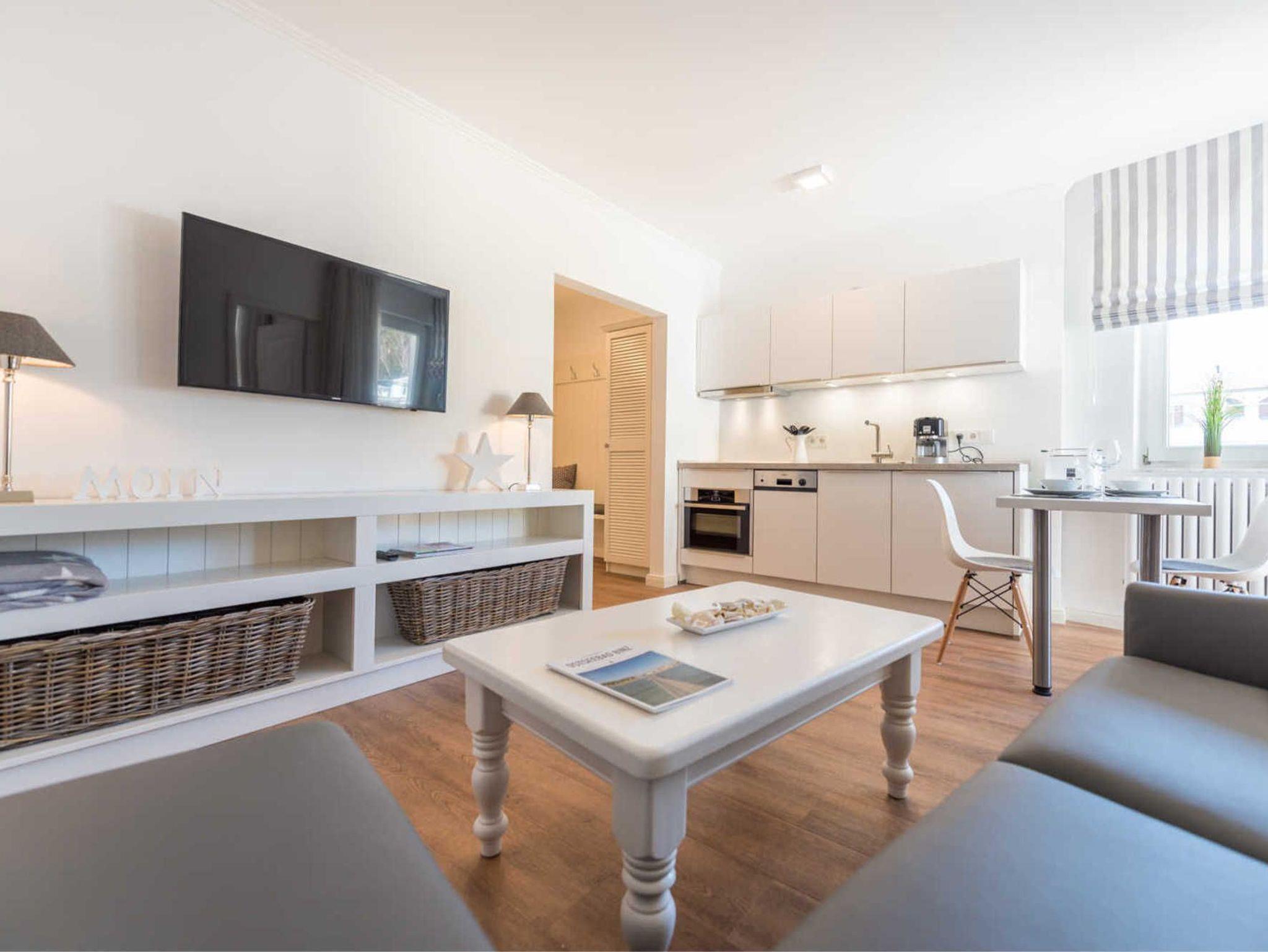 Neben dem Wohnraum mit offener Küche gibt es einen Schlafraum, sowie ein Badezimmer mit Waschtisch, Dusche und WC. Der Schlafraum ist mit einem Doppelbett, TV und einem großen Kleiderschrank ausgestattet. Außerdem finden Sie im komfortablen Wohnbereich neben der Sitzecke mit Schlafsofa für eine dritte Person einen separaten Essplatz, Flachbild-TV mit integriertem Radio und kostenlosem Internetzugang. Die moderne Küche ist mit Geschirrspülmaschine, Mikrowelle, Cerankochfeld, Kühlschrank und diversen Kleingeräten ausgestattet.