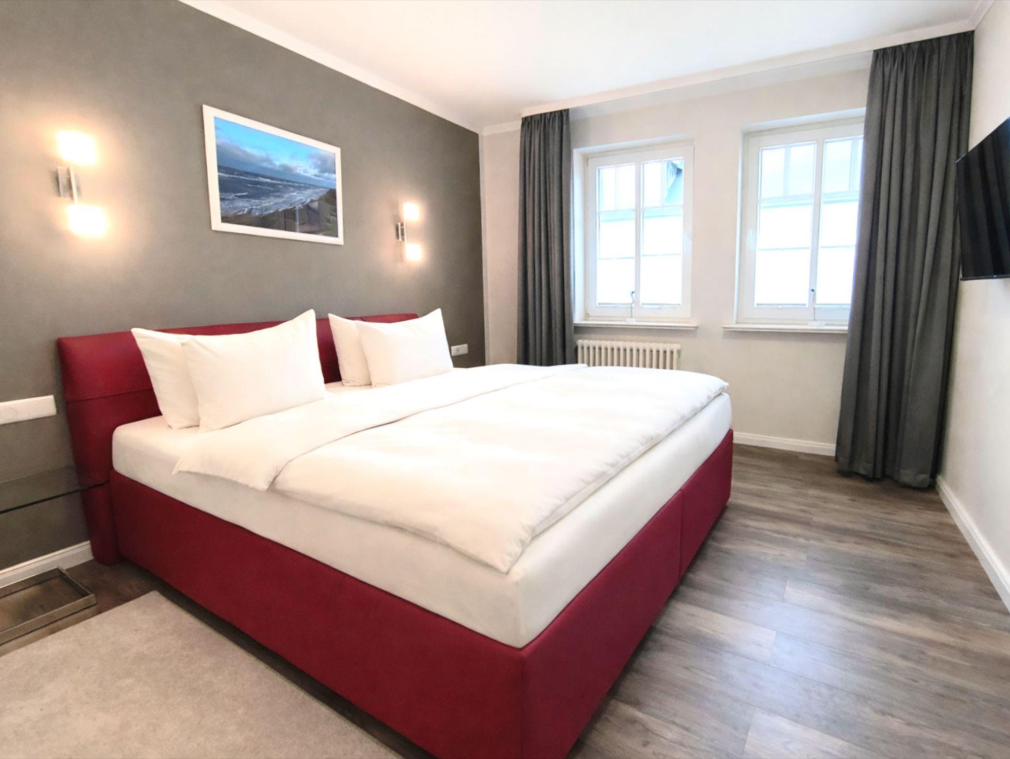 Das separate Schlafzimmer ist mit einem komfortablen Doppelbett sowie einem eigenen Fernseher ausgestattet und bietet einen ruhigen Rückzugsort für erholsame Nächte.
