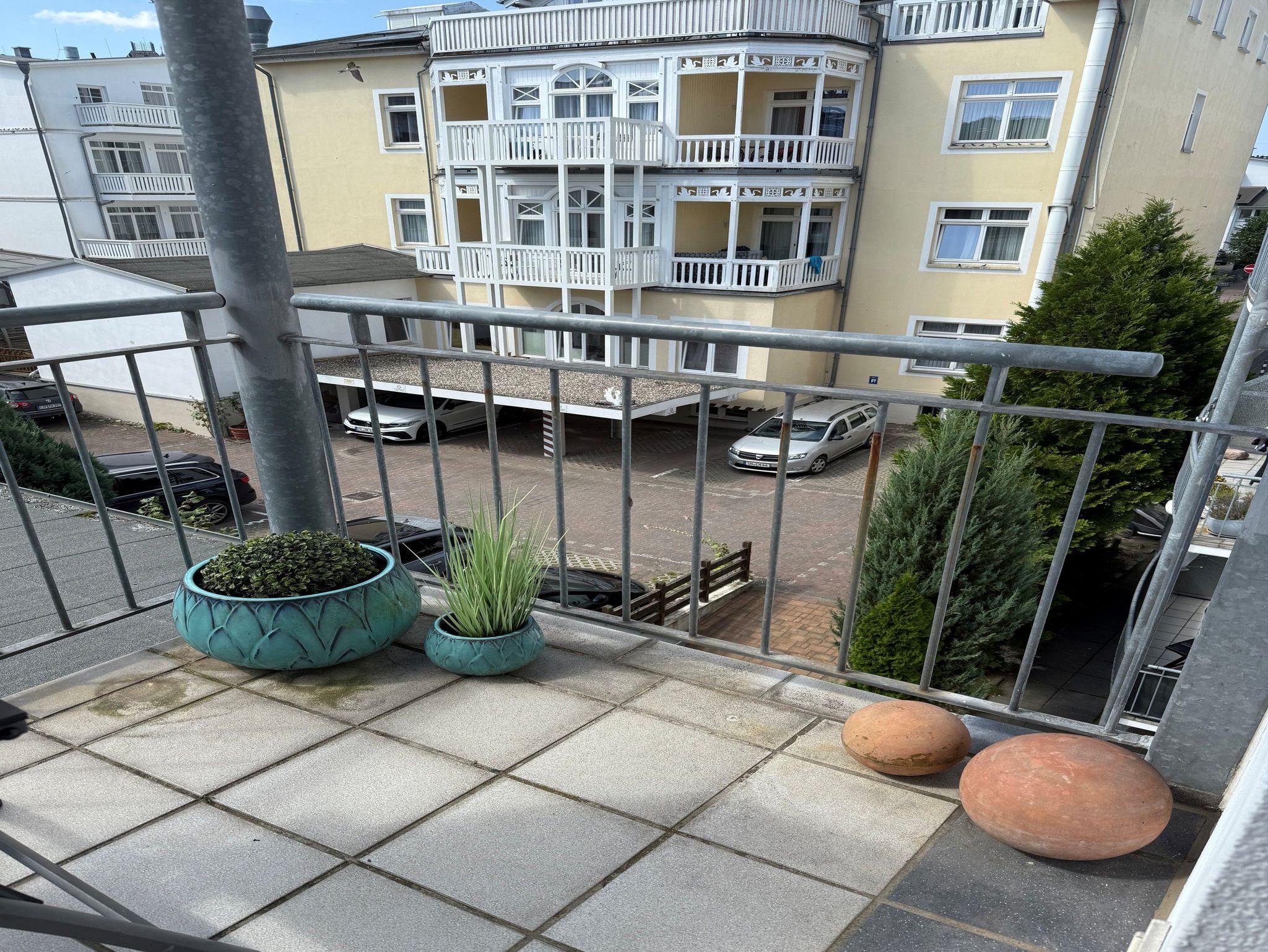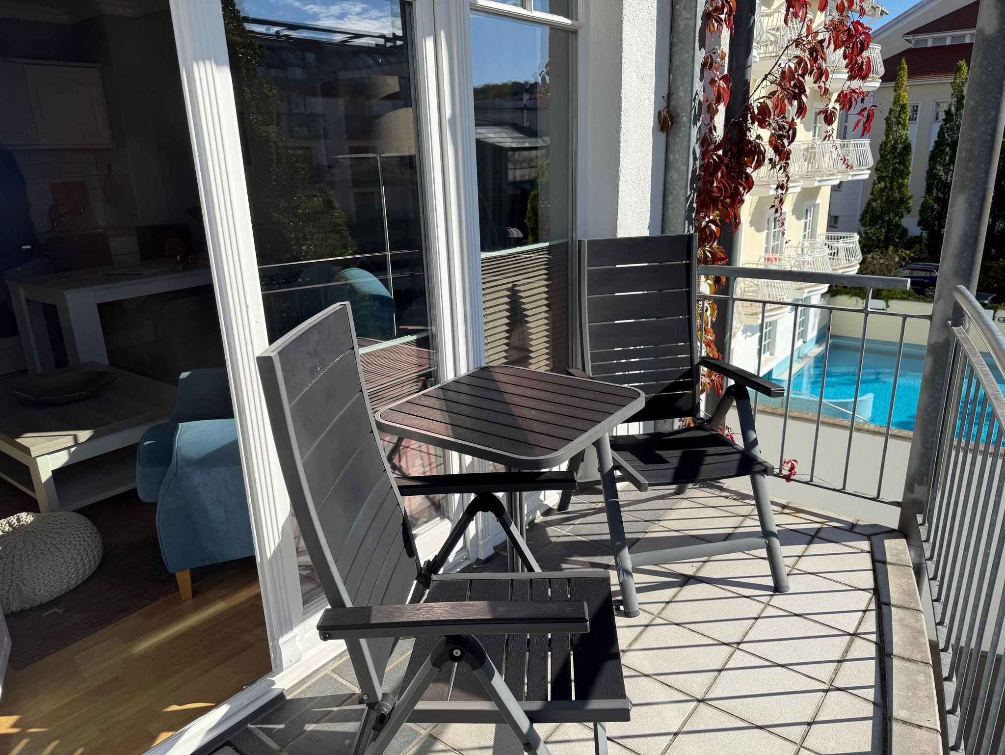 Das sehr geschmackvoll eingerichtete Appartement Meeresrauscher im 2. OG erreichen Sie mit dem Fahrstuhl. Es hat einen hübsch möblierten Balkon in SW-Ausrichtung mit Blick auf die stilvollen Nachbarhäuser und auf den hübschen Pool des benachbarten und mondänen Kurhotels Binz.