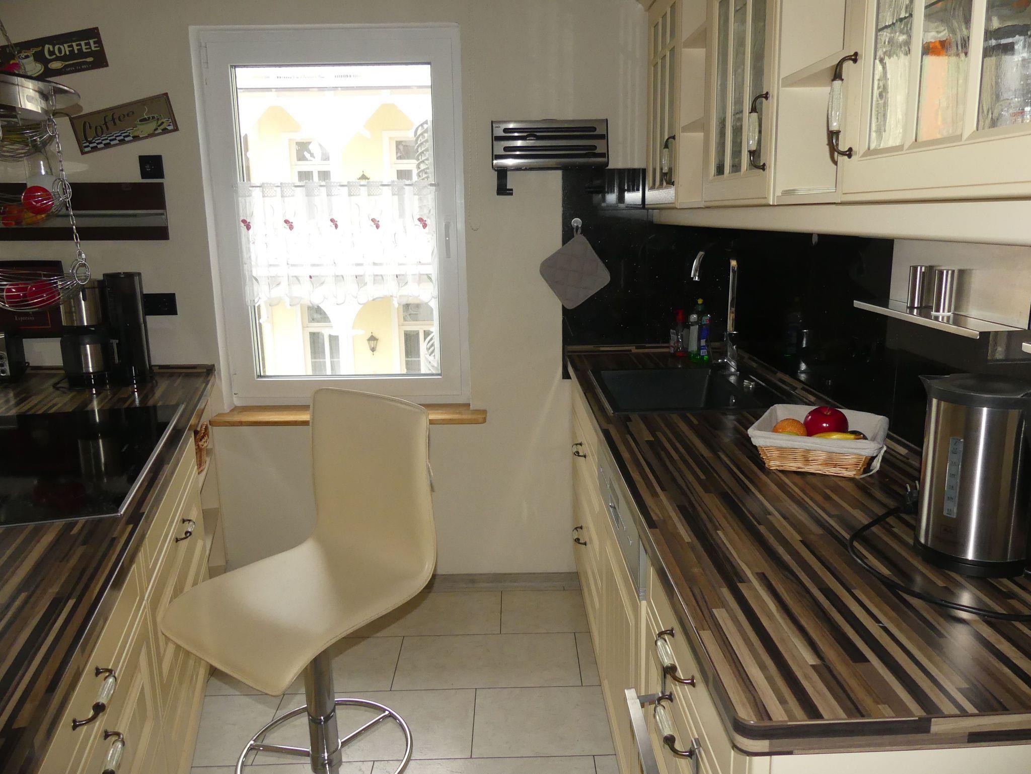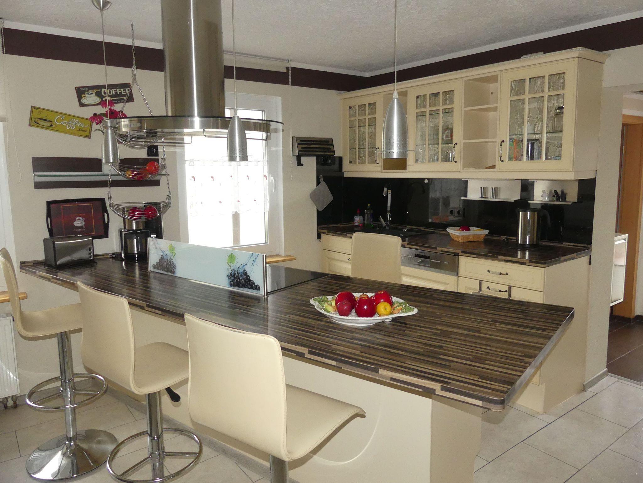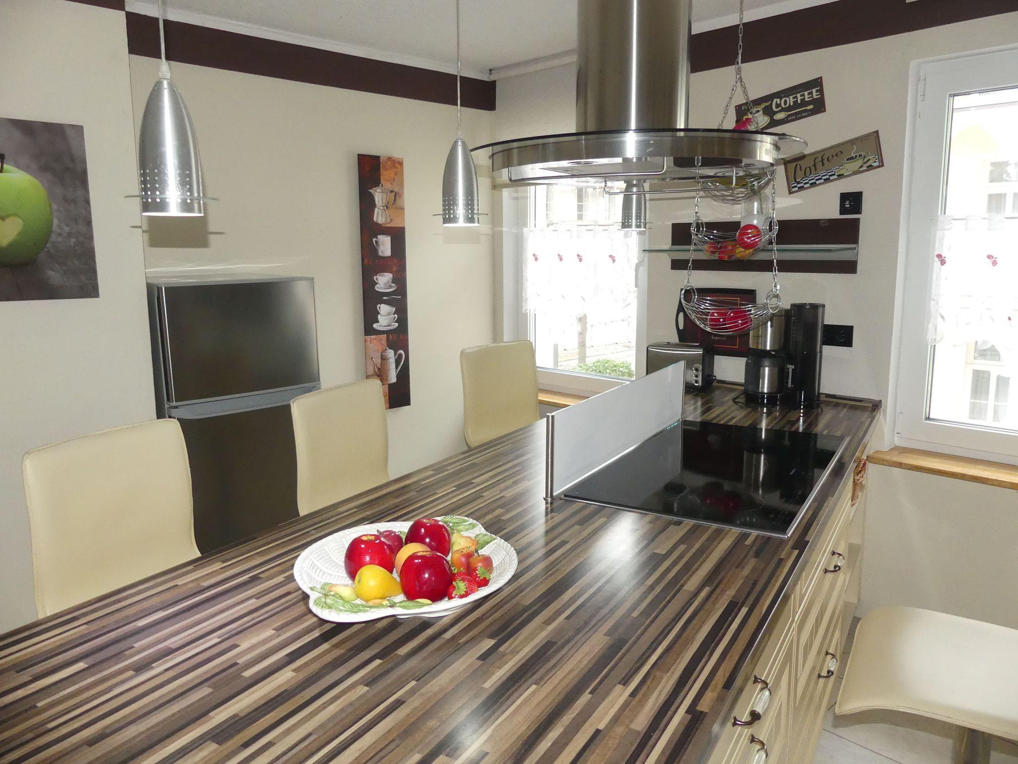 Küche: Moderne Einbauküche mit Ceranherd und Backofen, Spülmaschine, Mikrowelle, Wasserkocher, Toaster, Kaffeemaschine, Essbereich