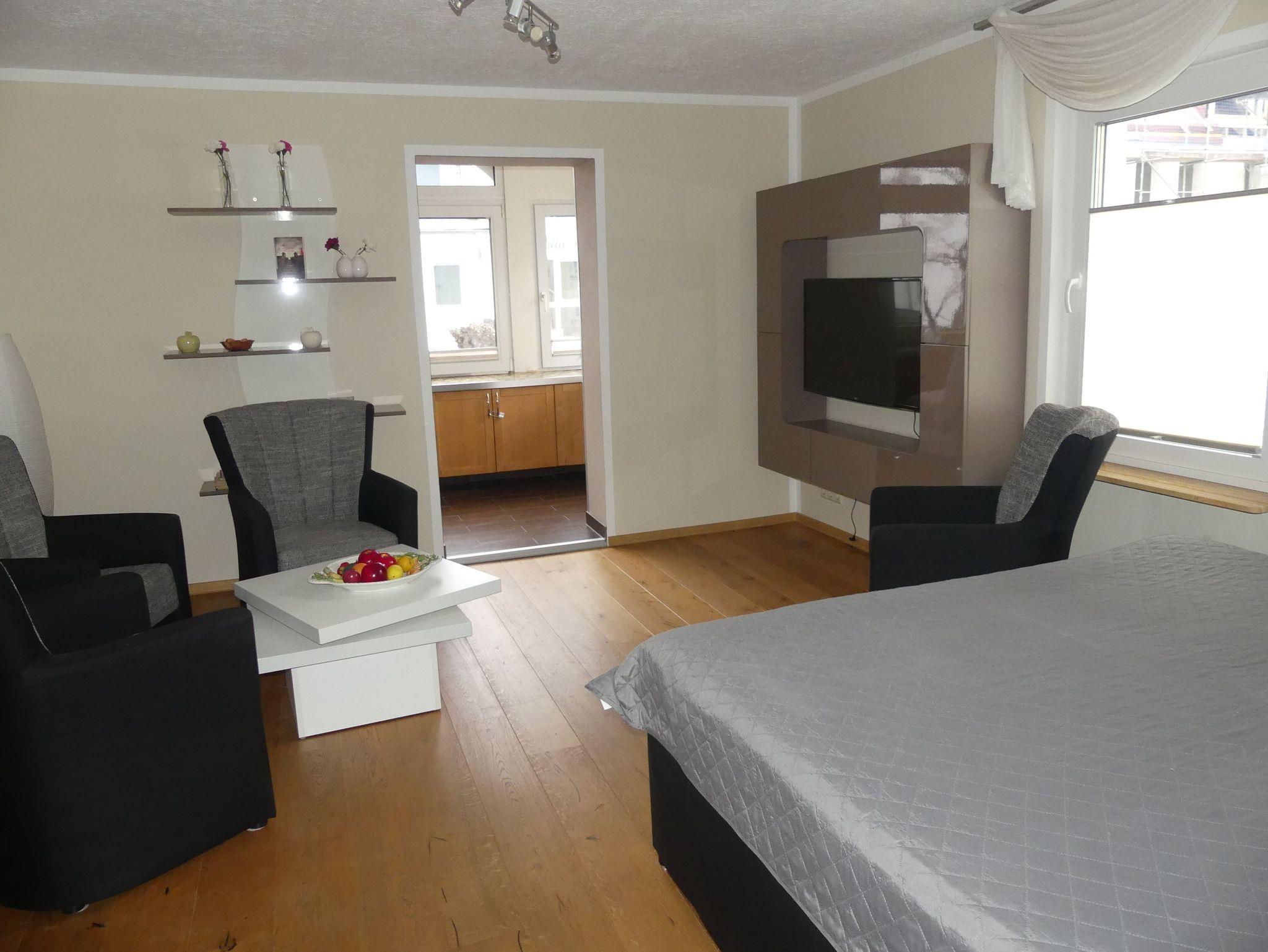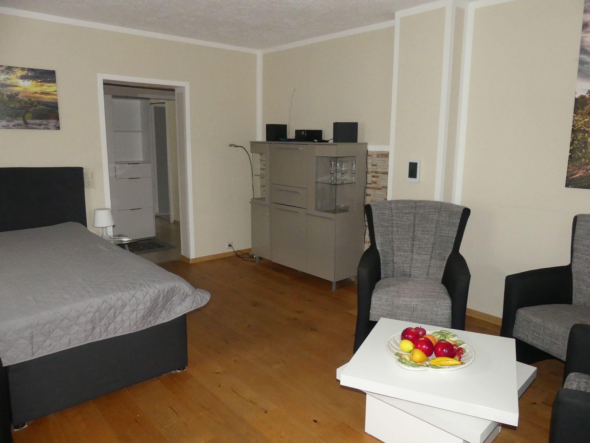 Sehr großes Wohn-/Schlafzimmer mit Echtholzpakett und Bodenheizung, einem Boxspringbett, 4 Sessel, Kabel-TV, WLAN-Internetanschluss und Zugang zur Loggia
