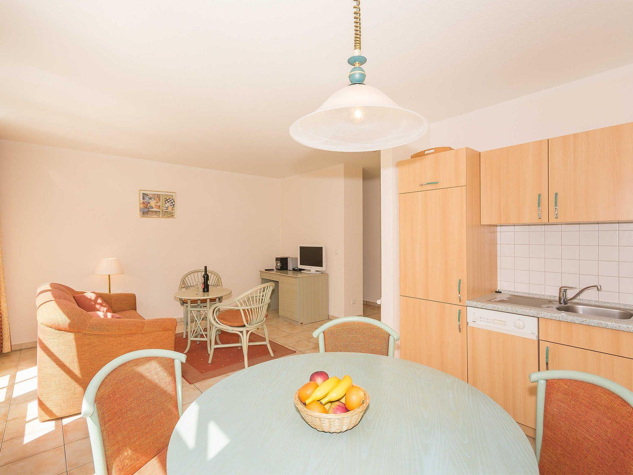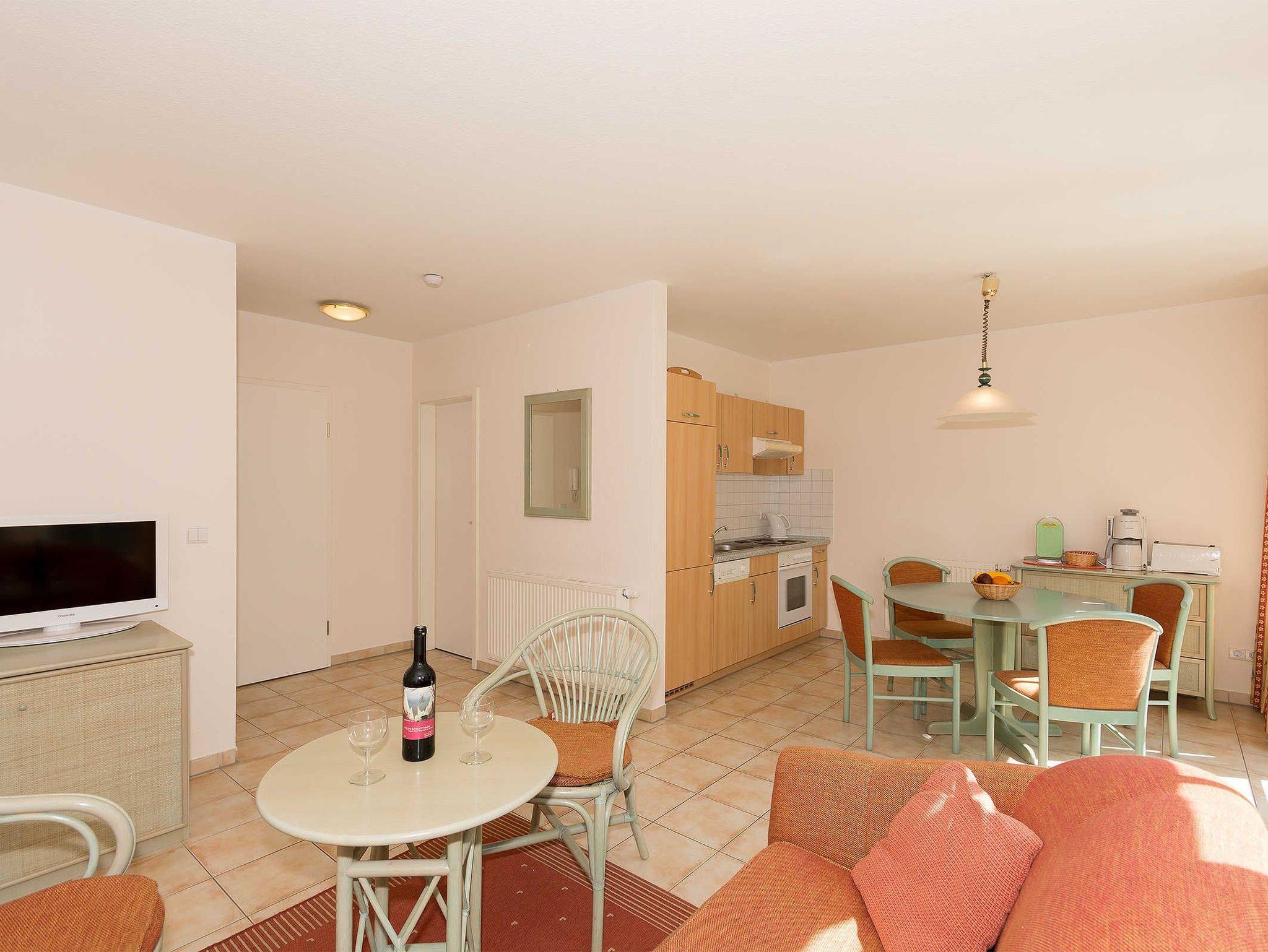 Im Wohnraum erwartet Sie eine Schlafcouch, TV, Stereoanlage mit CD Player, die offene Küche ist mit Geschirrspüler, Backofen uvm. ausgestattet. Am runden Esstisch haben 4 Personen bequem Platz.