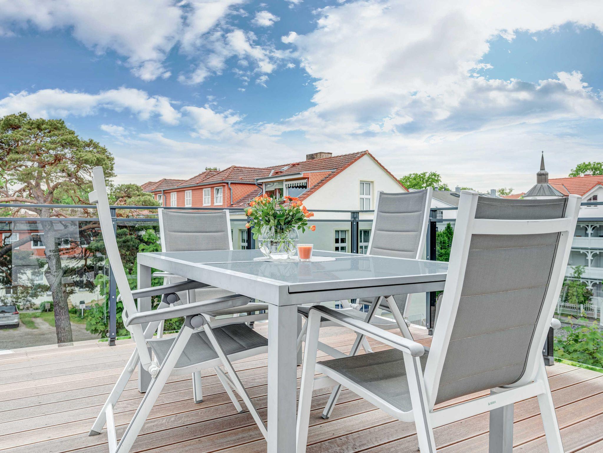 Schöne moderne Penthousewohnung mit großer Sonnenterasse und Rundumblick über die Dächer von Binz, mit 2 Schlafzimmer für max. 2 Erw. + 2 Ki.