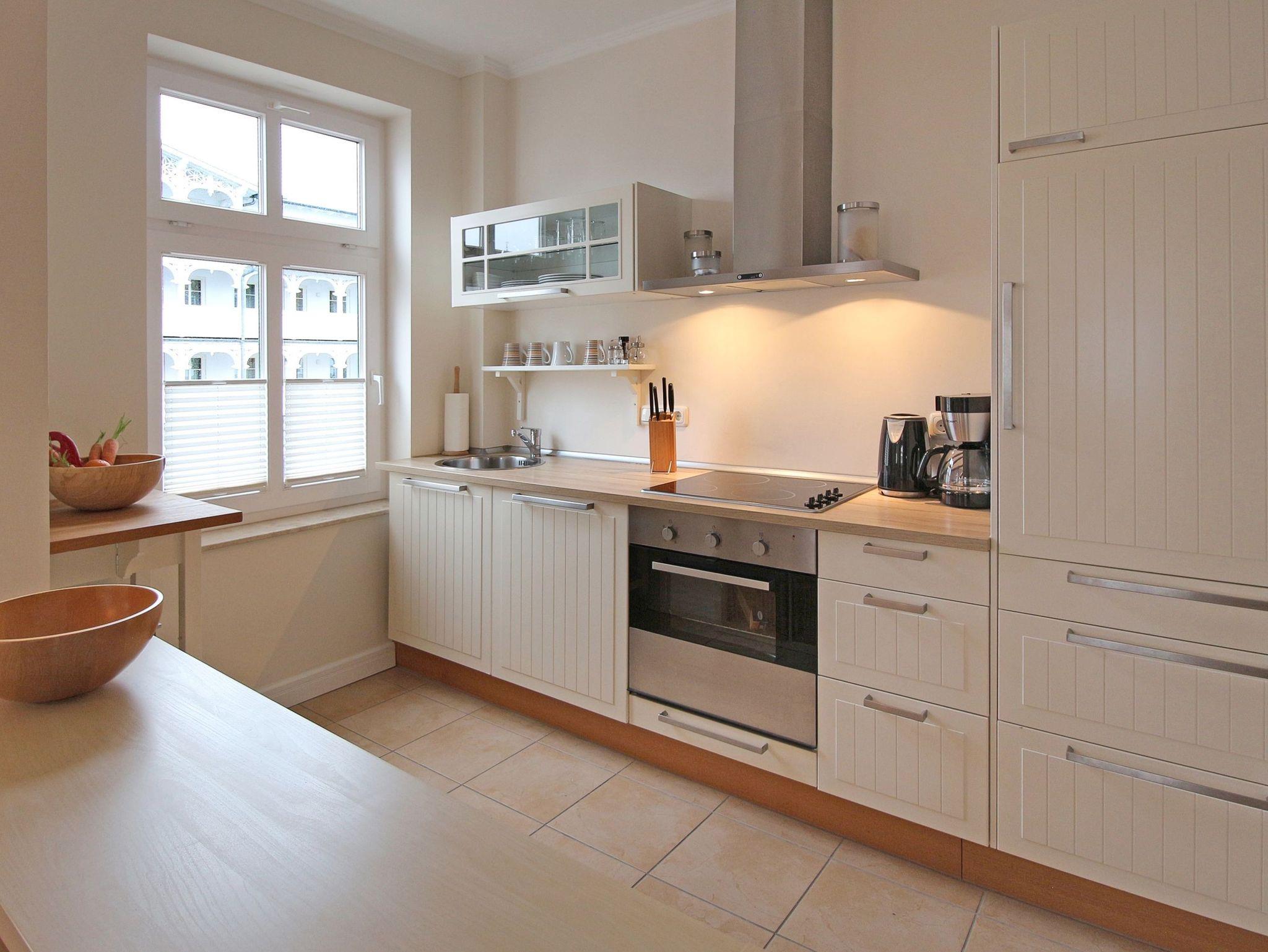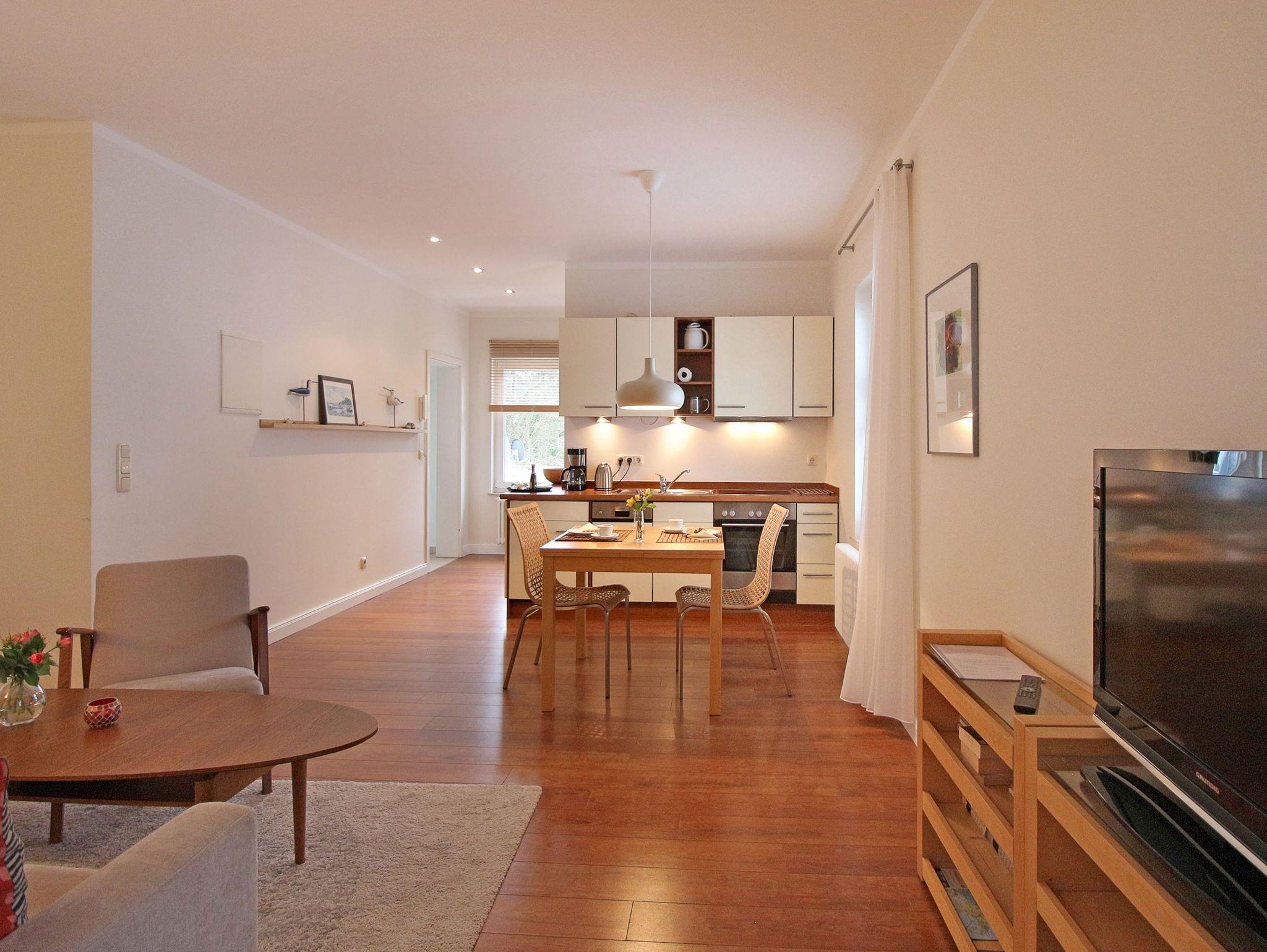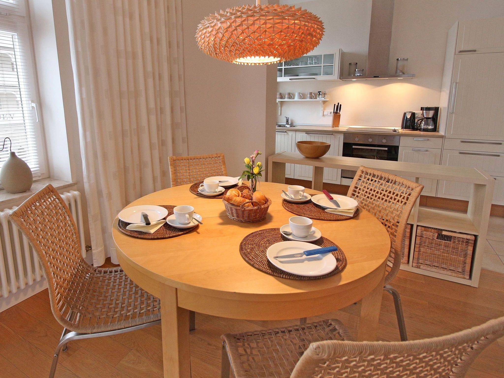 Dieses Appartement besticht durch seine offene Aufteilung und großzügigen Räume. Das helle Wohnzimmer ist ausgestattet mit Sat-TV, gemütlicher großer Couch, kleiner Sitzecke im Erker und einem separaten Essplatz für 4 Personen. Etwas abgetrennt bietet die moderne Einbauküche jeglichen Komfort: ausgestattet mit Ceran-Herd, Backofen, Geschirrspülmaschine und allen möglichen Küchenutensilien.