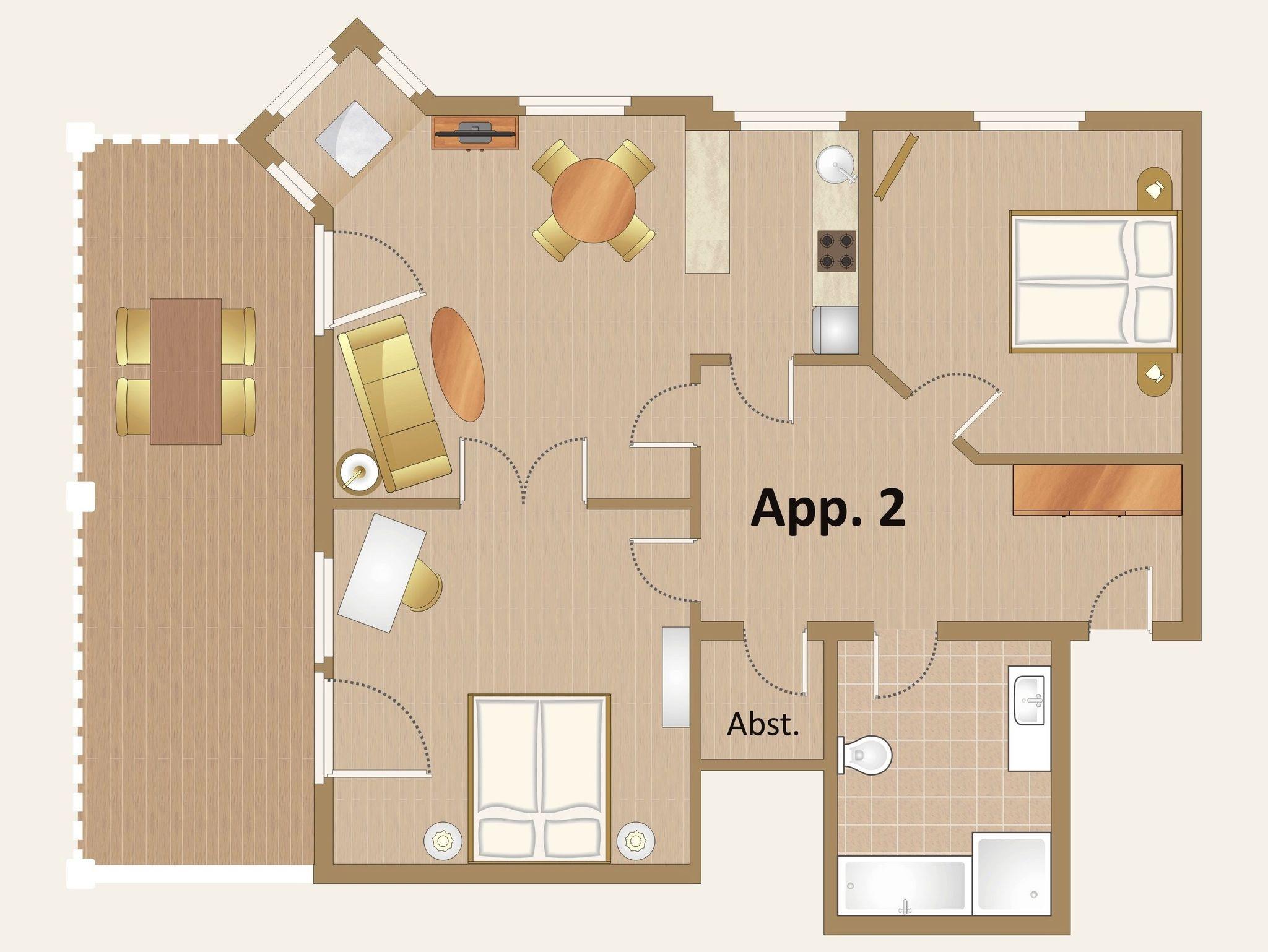 Das Appartement Nr.2 befindet sich im 1. Obergeschoss und bietet bei einer Größe von ca. 105 qm bequem Platz für bis zu 4 Personen und ein Kleinkind (im Kinderreisebett).