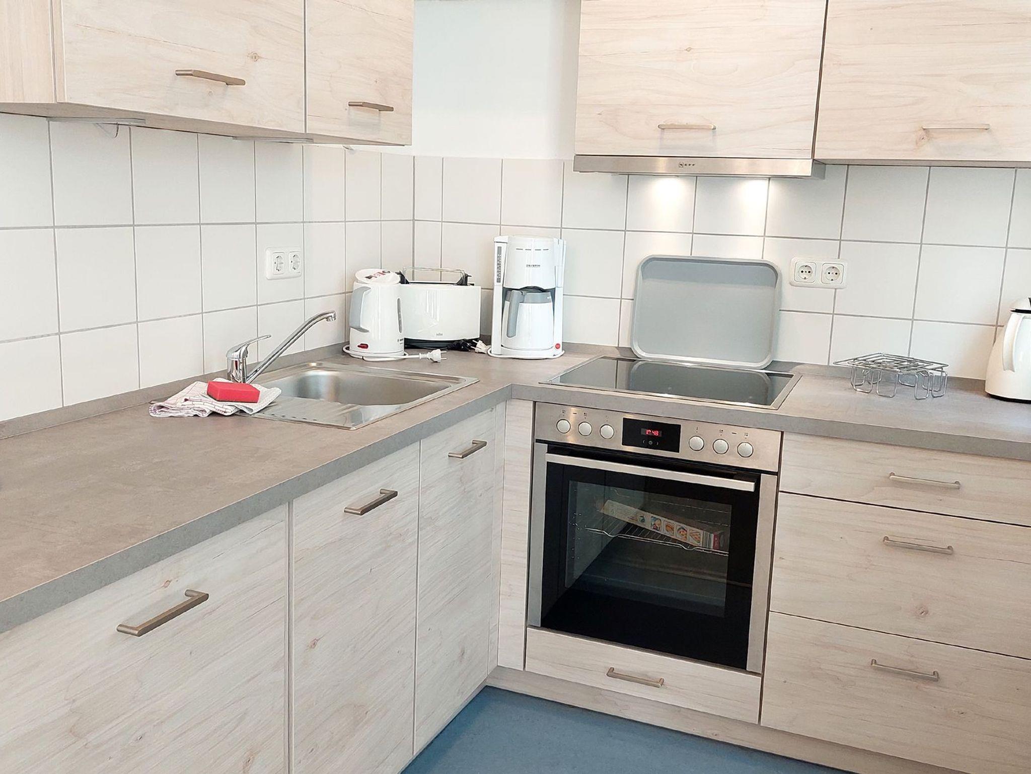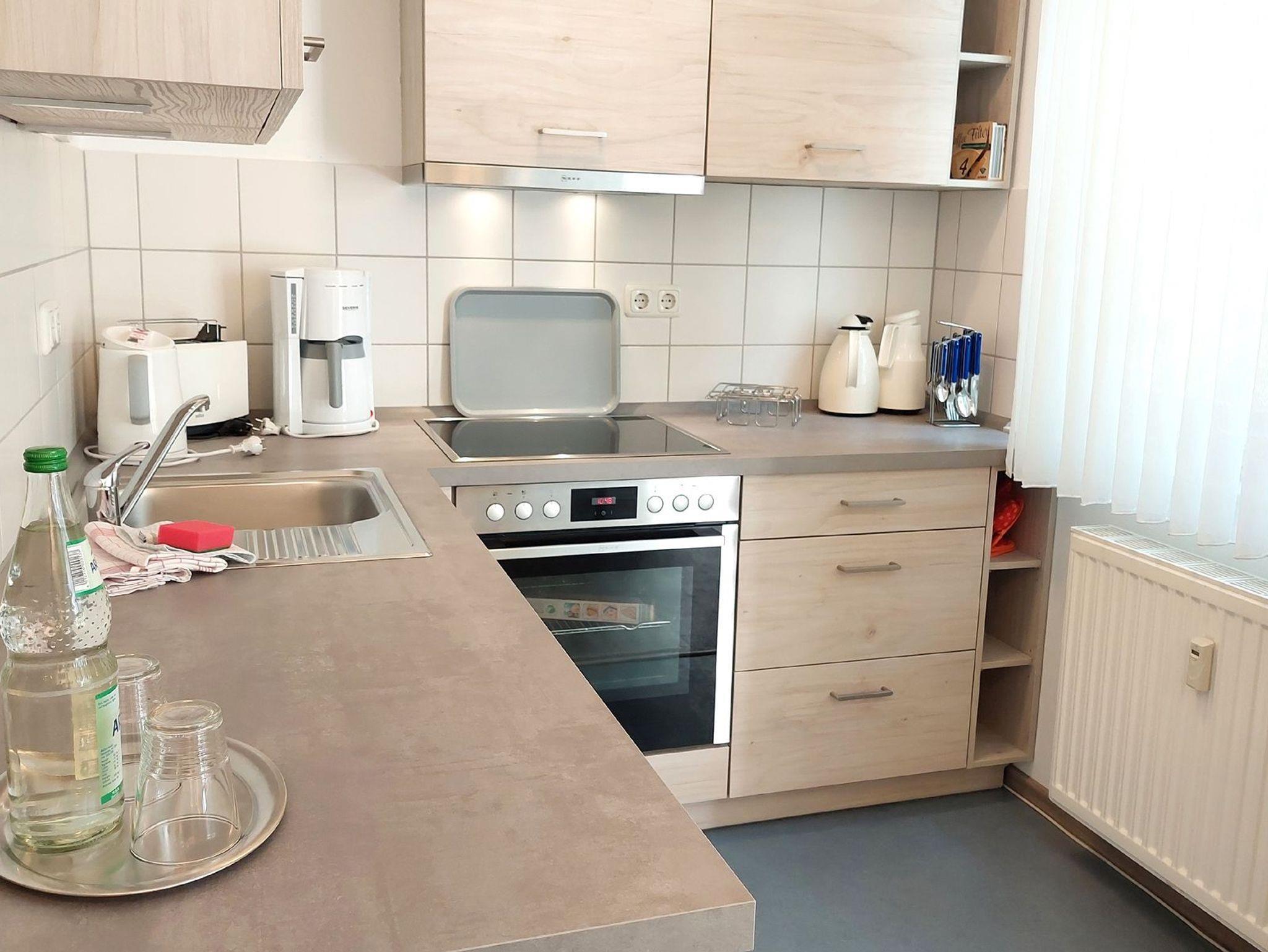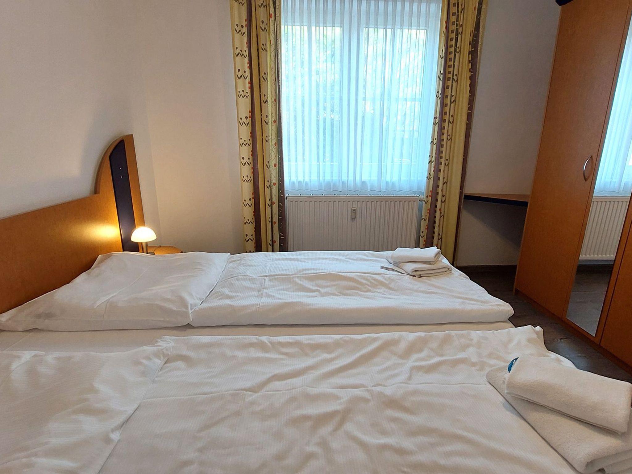 Die Wohnung teilt sich auf in Wohnraum mit kompletter Küche, ein Badezimmer, eine Gästetoilette, zwei Schlafräume, Flur und Abstellkammer. Im Wohnraum finden Sie neben der Sitzgruppe mit Sofa noch einen separaten Essplatz. Ein Fernseher und ein Radio gehören zur Ausstattung. Die beiden Schlafräume sind jeweils mit einem Doppelbett und einem Kleiderschrank ausgestattet. Im Badezimmer finden Sie Waschtisch, Duschbad und WC. Die Küche ist ausgestattet mit 2 Platten-Herd, Geschirrspüler, Kaffeemaschine, Wasserkocher und Toaster. Alle unsere Gäste haben einen kostenfreien Internetzugang in dieser Wohnung. Für Ihren PKW ist ein Einstellplatz im nur 80 m entfernten Parkhaus vorhanden.