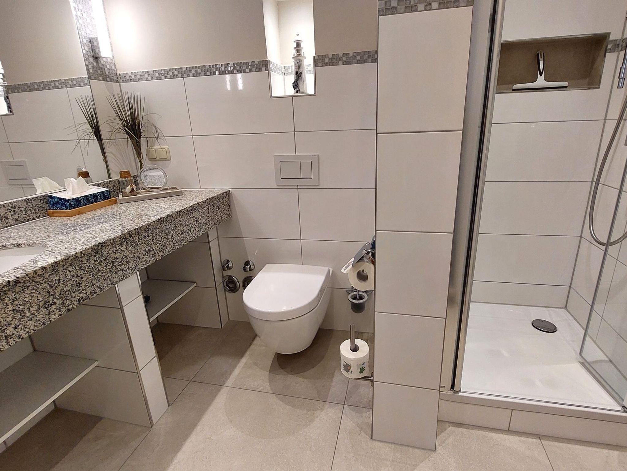 Das Badezimmer verfügt über Waschtisch, WC und Dusche.