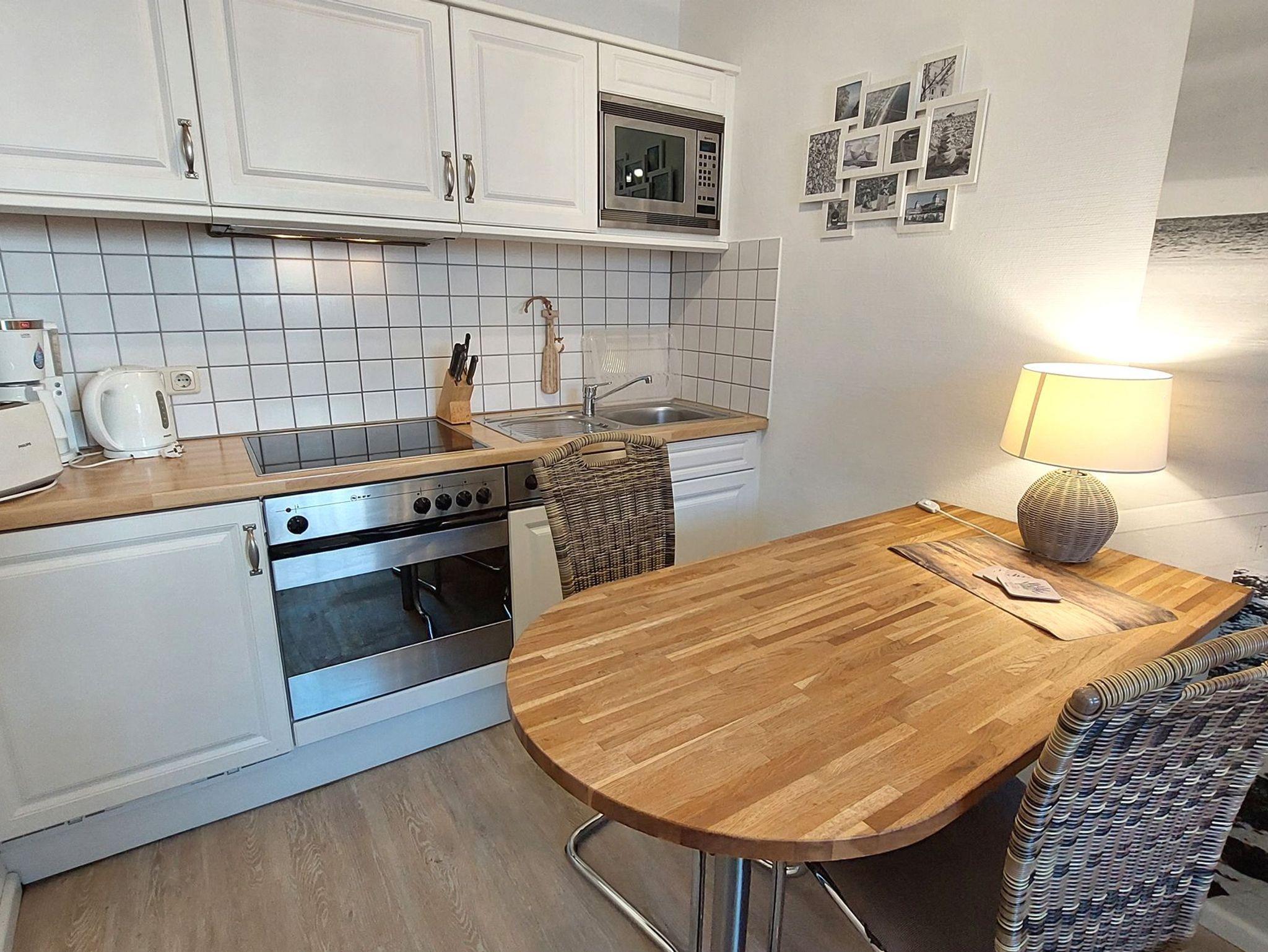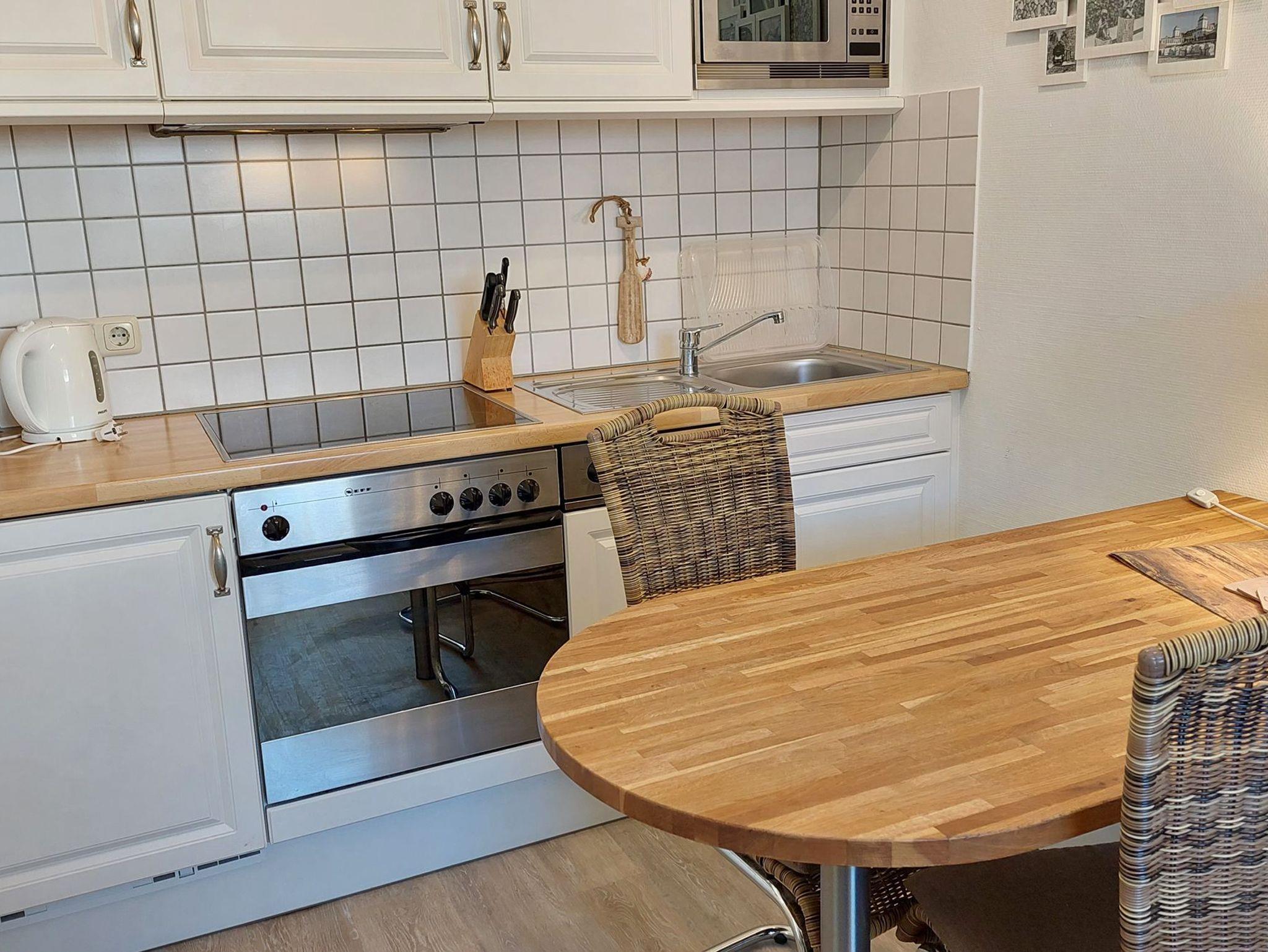 Die Küchenzeile beinhaltet Cerankochfeld, Backofen, Mikrowelle, Geschirrspüler sowie einen kleinen Kühlschrank samt Gefrierfach.