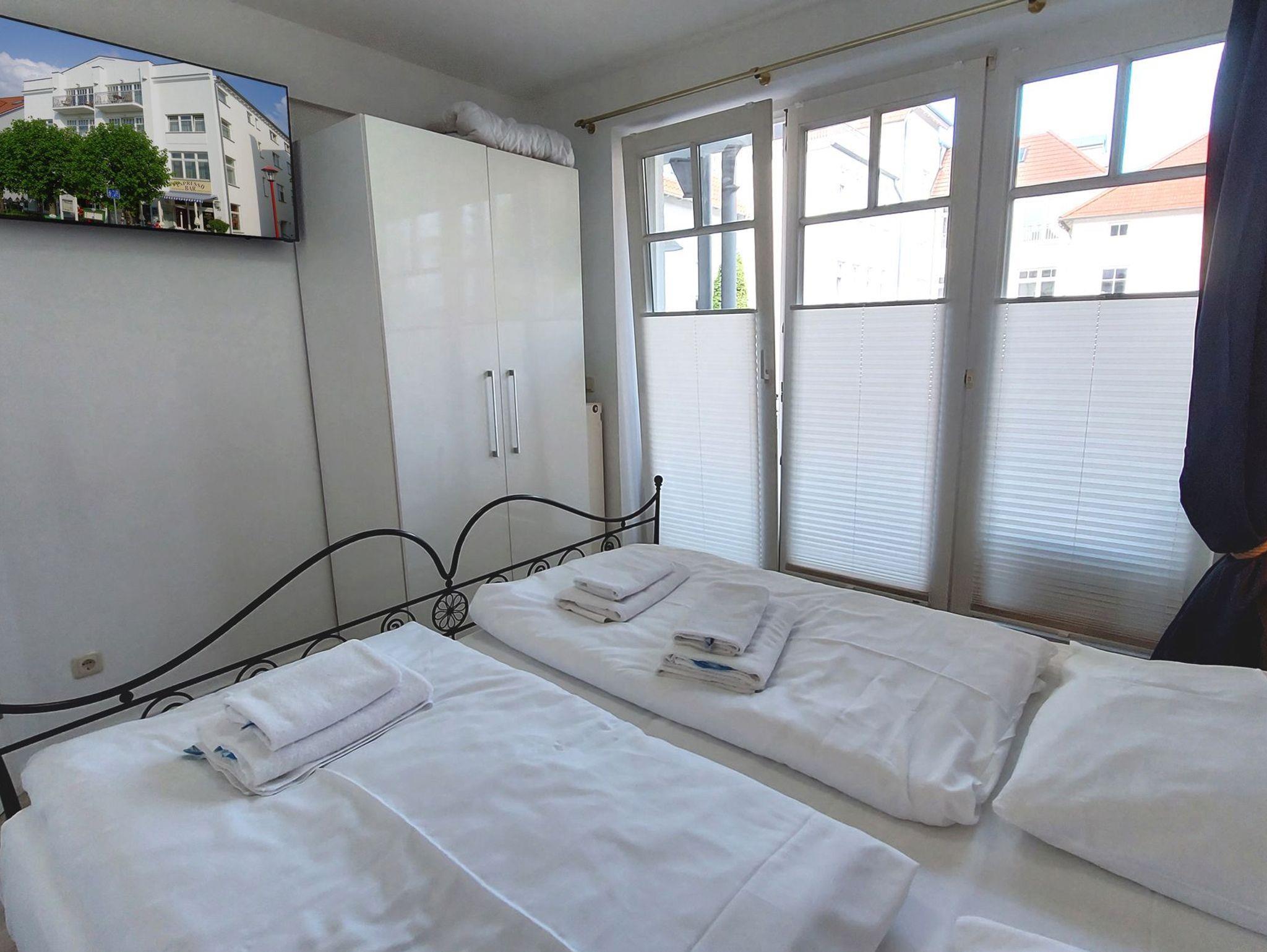 Im Schlafzimmer befindet sich ein Doppelbett, ein Kleiderschrank sowie ein zusätzlicher Flachbild-TV.