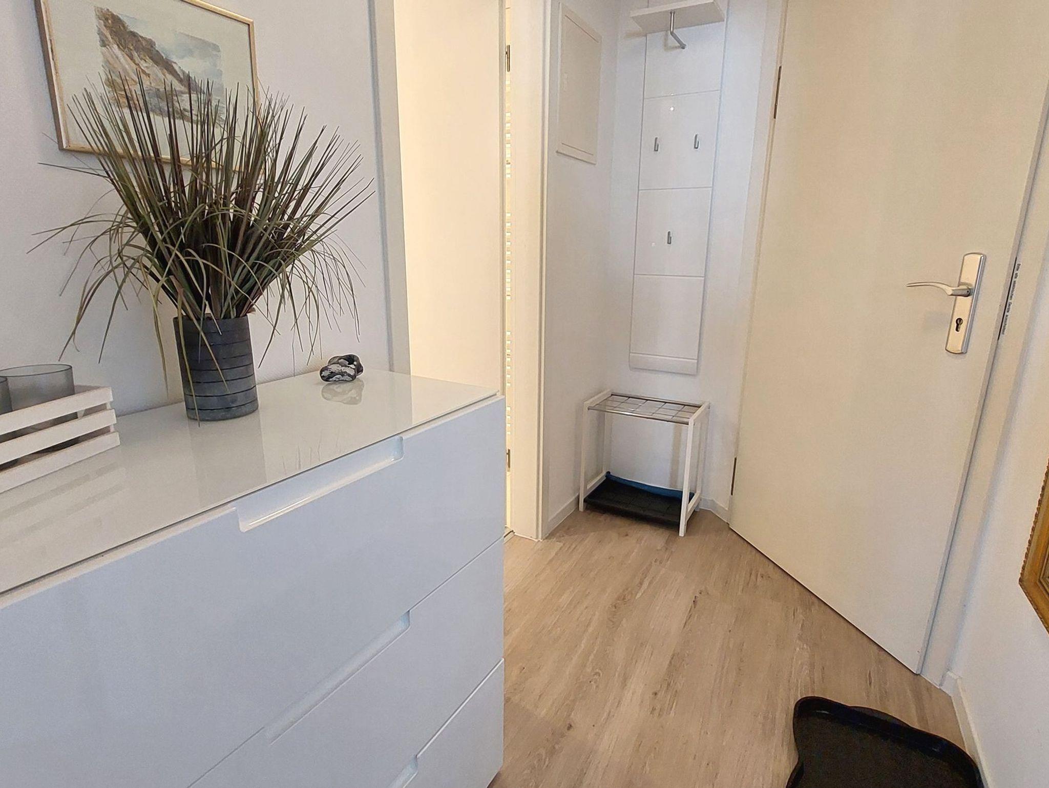Vom Flurbereich samt Garderobe und Spiegel gelangt man ins Bad, ins Schlafzimmer und in den kombinierten Wohn- und Essbereich.
