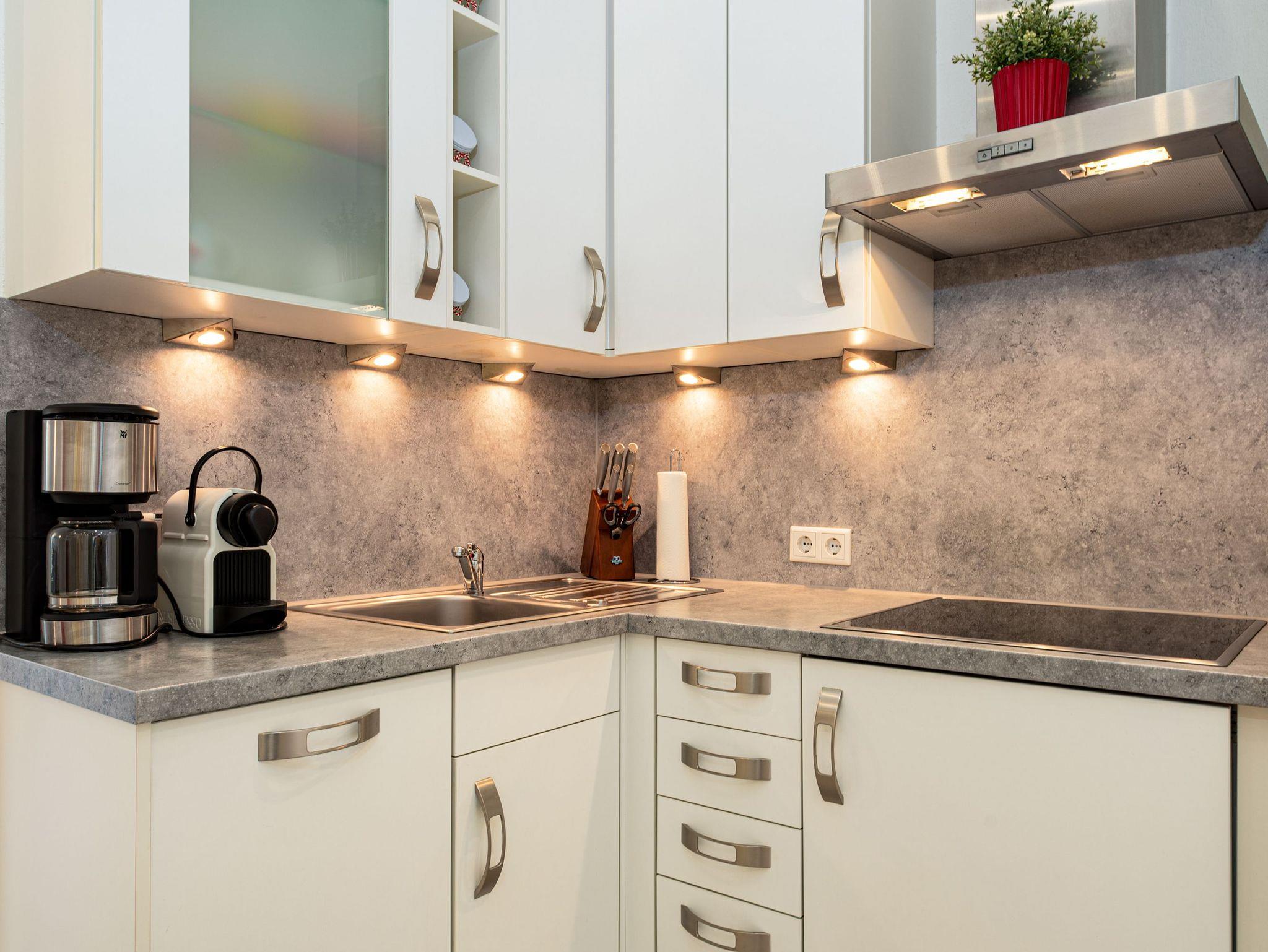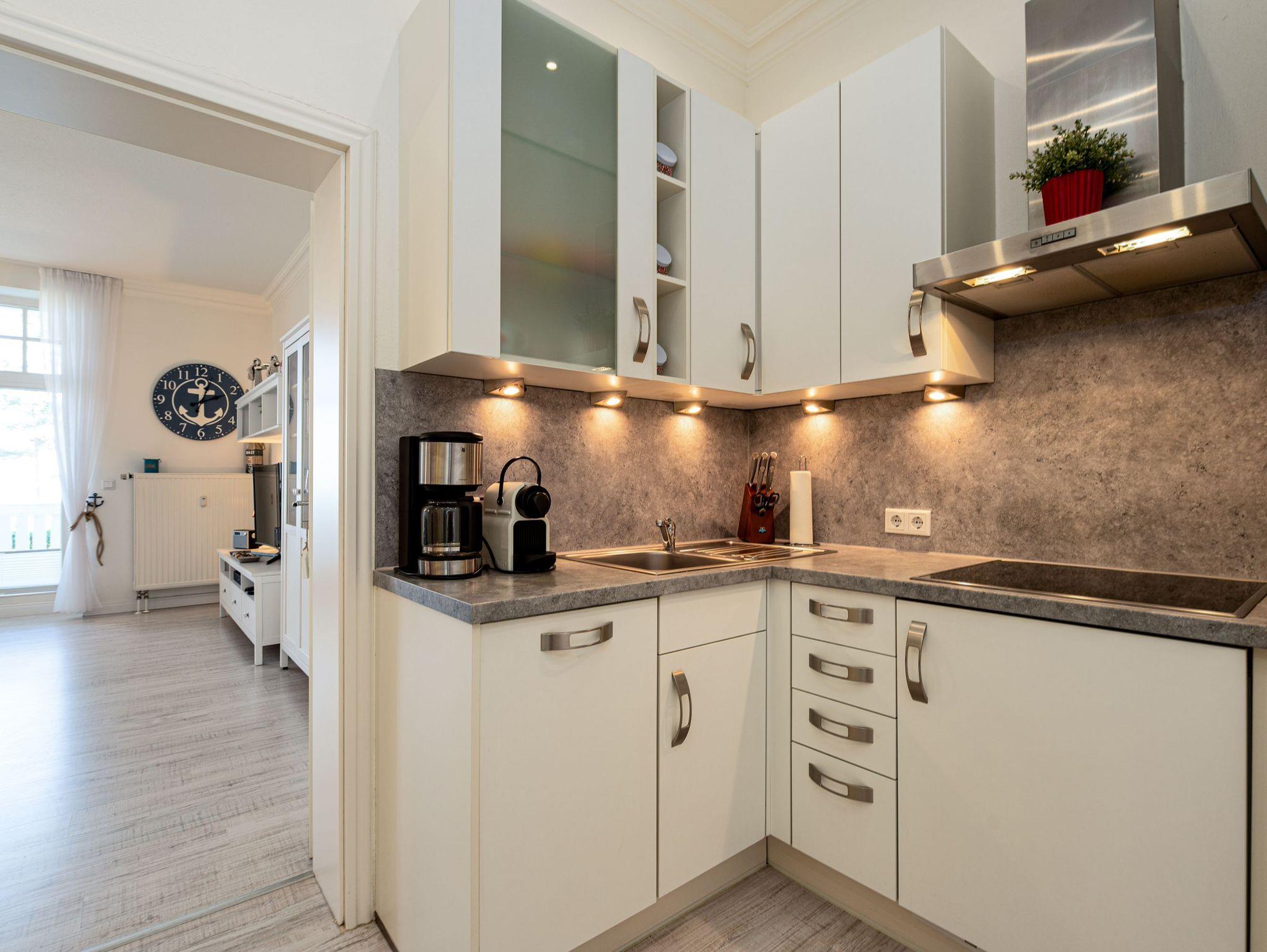 Die separate, hochwertig voll ausgestatte Küche ist mit einem Cerankochfeld, einer Mikrowelle, Dunstabzugshaube, Spülmaschine, einer Filter-Kaffeemaschine und einer Nespresso-Kapselmaschine, einem Kühlschrank mit Tiefkühlfach, Toaster, Wasserkocher, Messerblock und diversem Kleininventar ausgestattet.