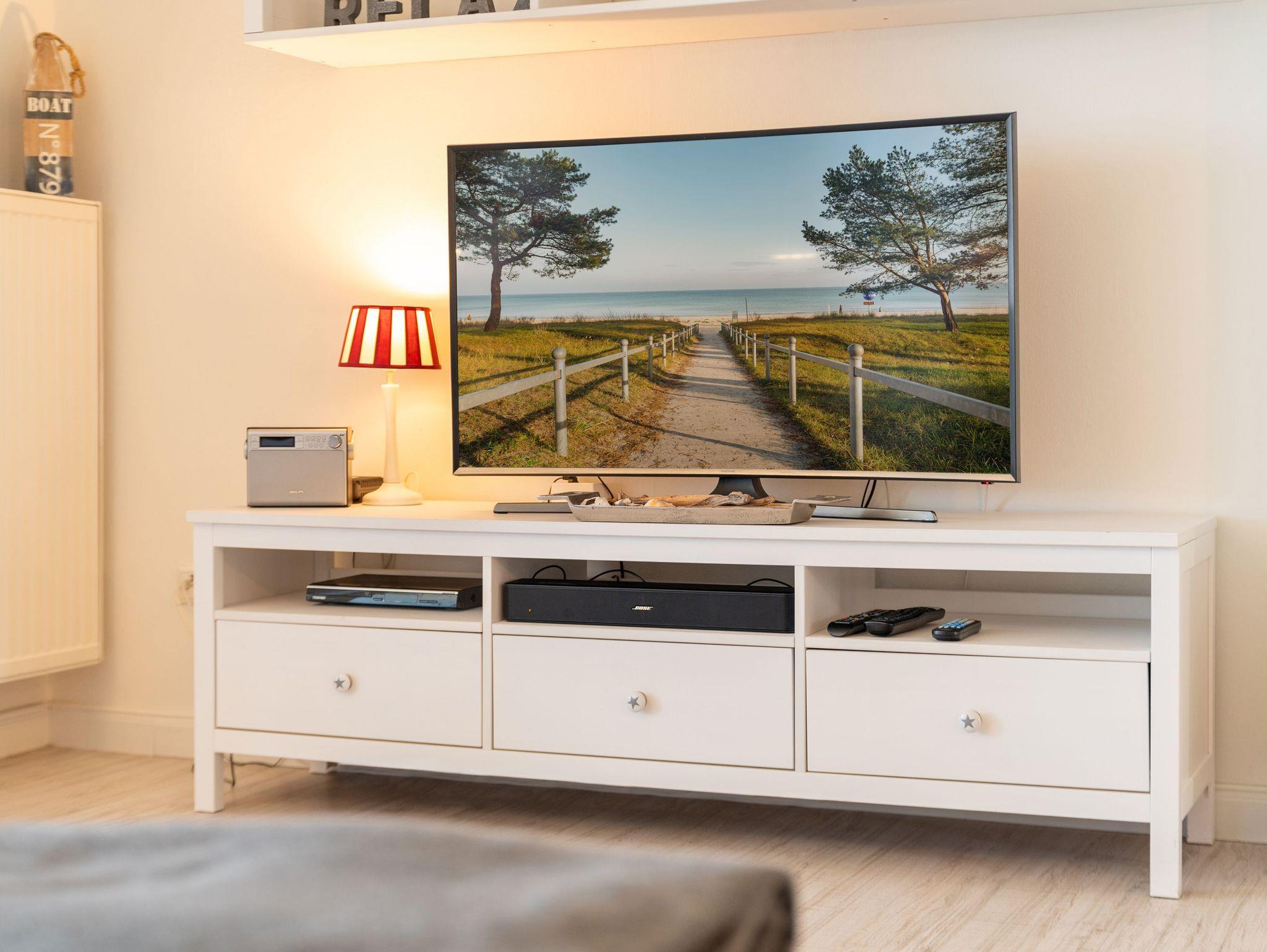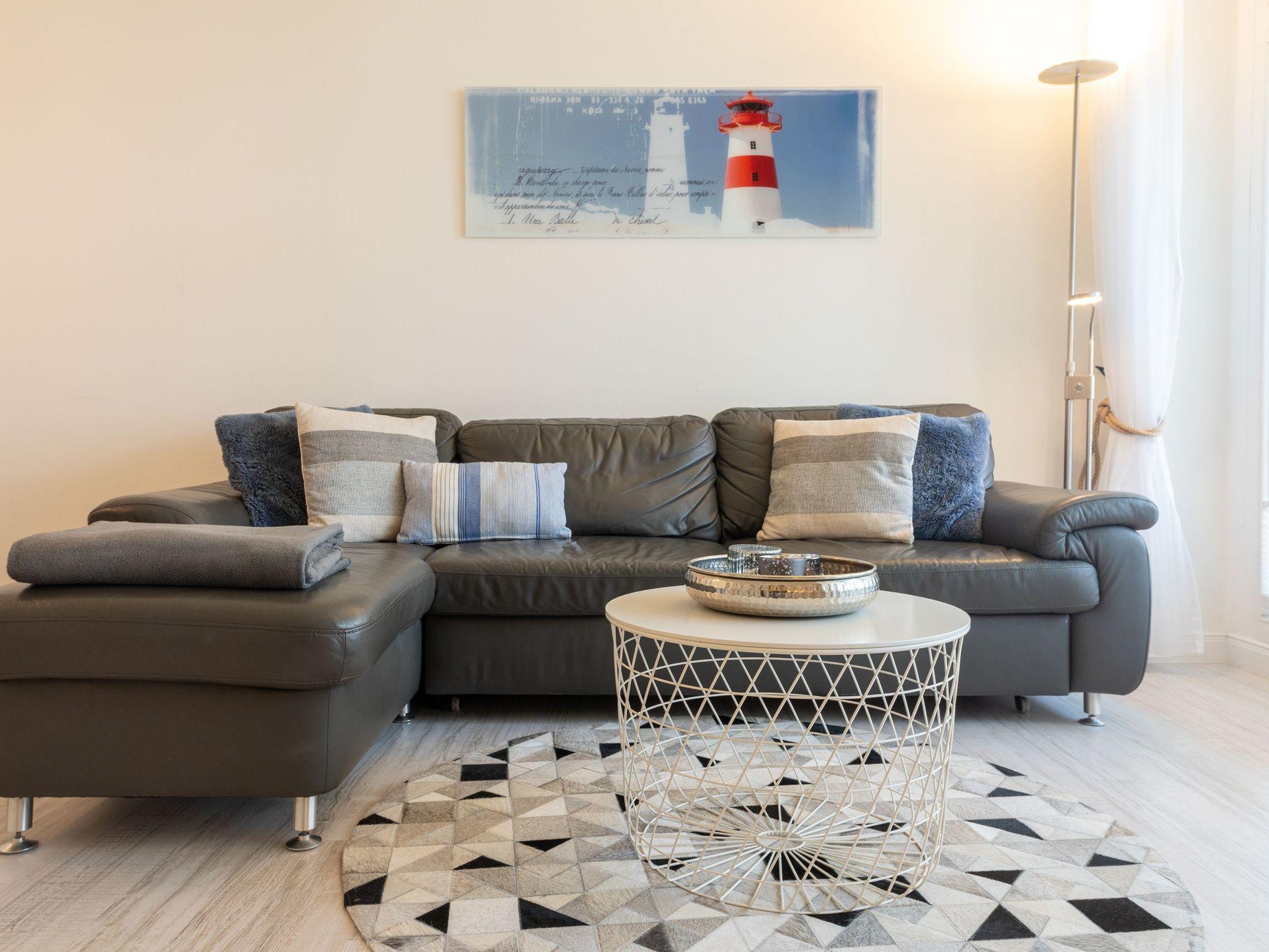 Durch den großzügigen Eingangsbereich gelangen Sie in den hellen, lichtdurchfluteten Wohnbereich mit großem Curved-TV, Blu-Ray-Player, Bose Soundbar und zur Schlafcouch umfunktionierbarer Leder-Sitzgruppe sowie Essbereich und Zugang zum möblierten Balkon mit traumhaften Ostseeblick.