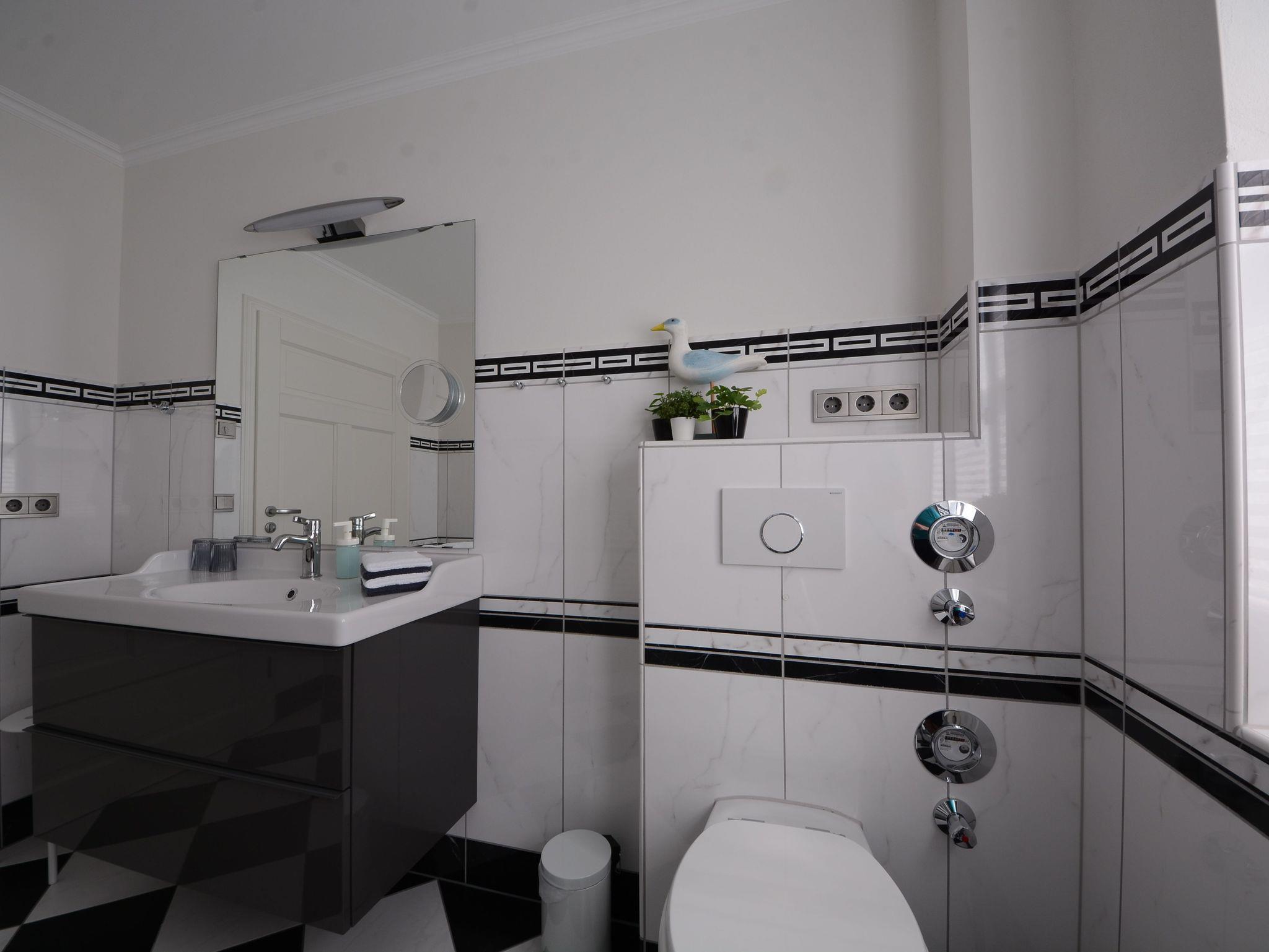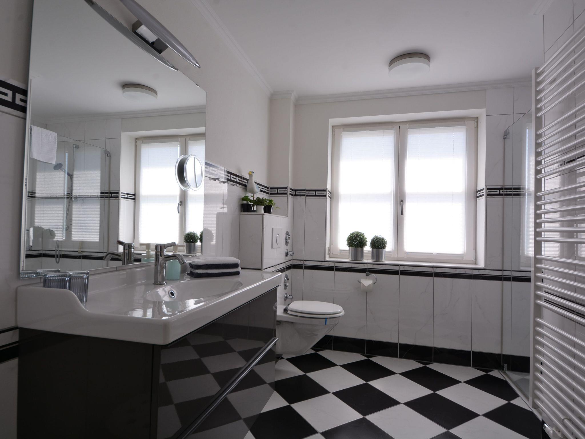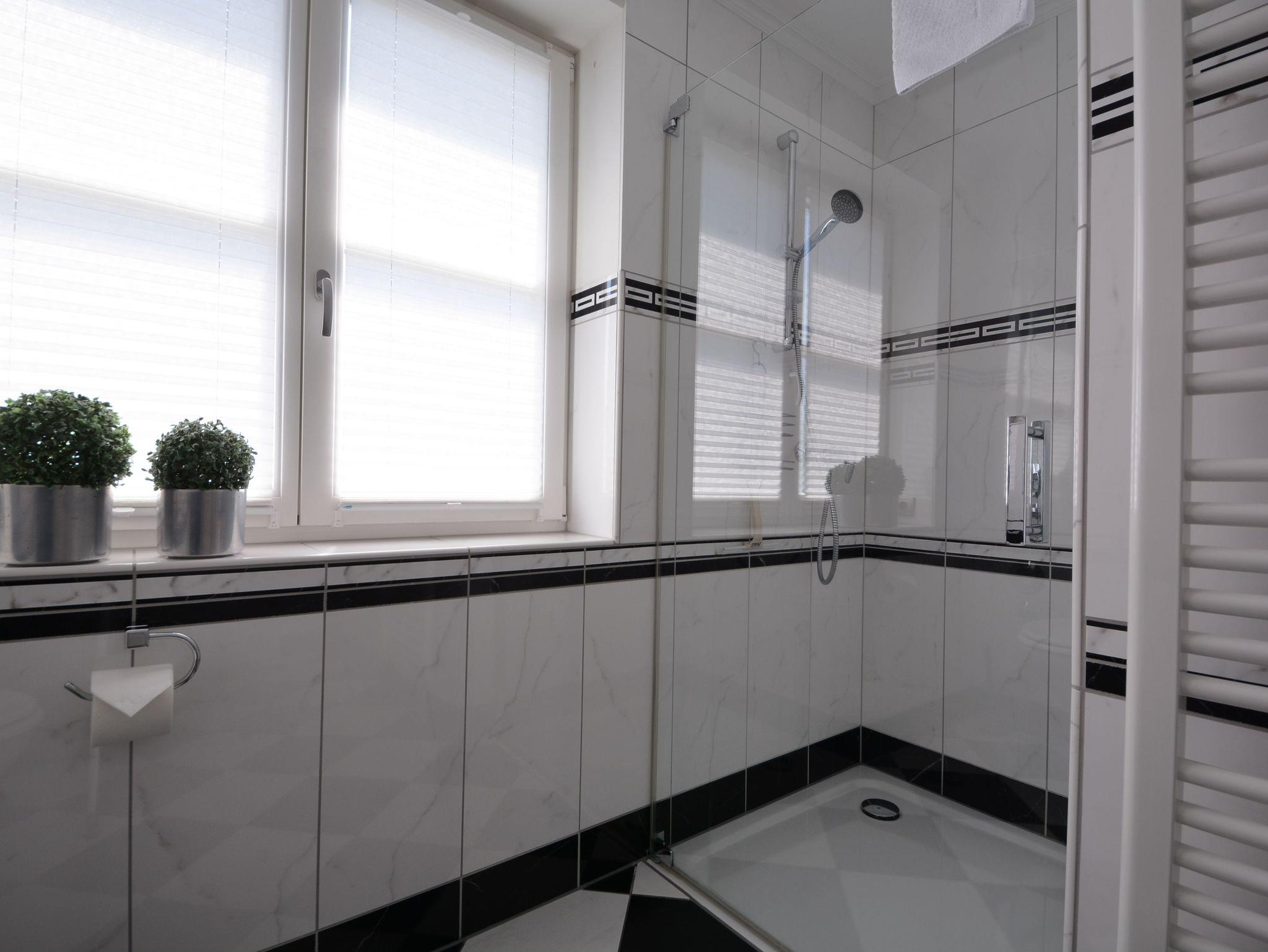 Das Tageslicht-Duschbad mit bodengleicher Duschwanne und großem Fenster ist geschmackvoll und hochwertig gefliest, mit einem Handtuchtrockner, Föhn und mit umfangreichen Unterbringungsmöglichkeiten für Ihre Utensilien ausgestattet.