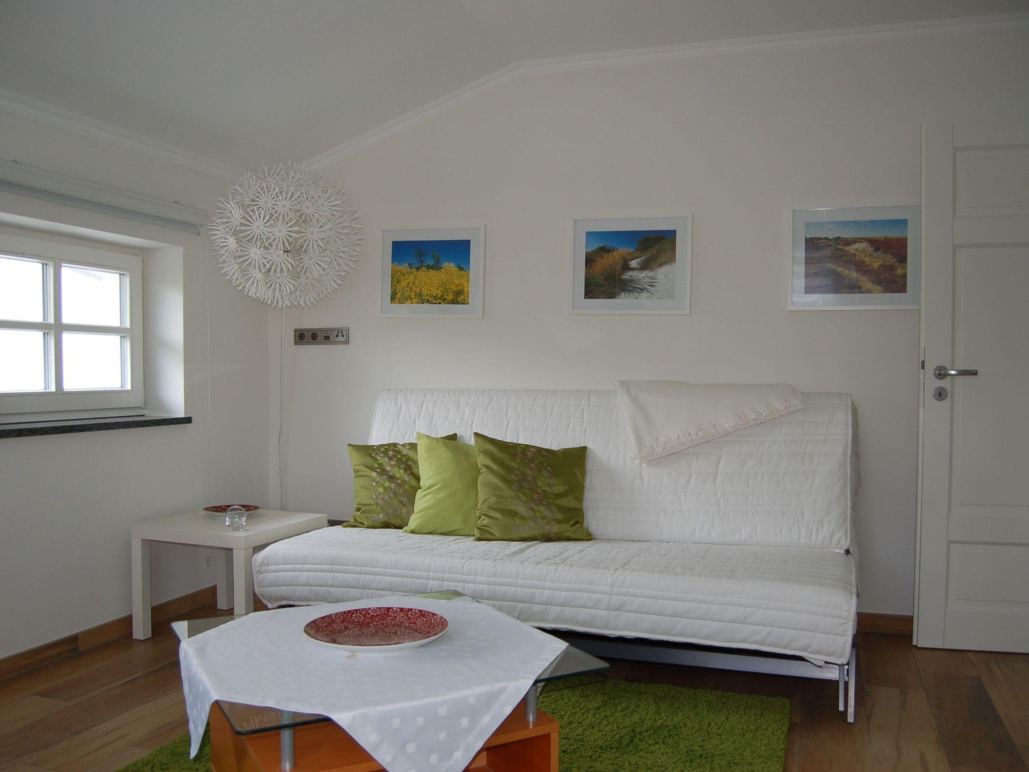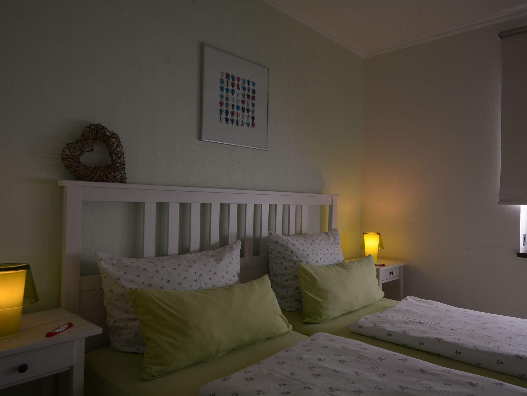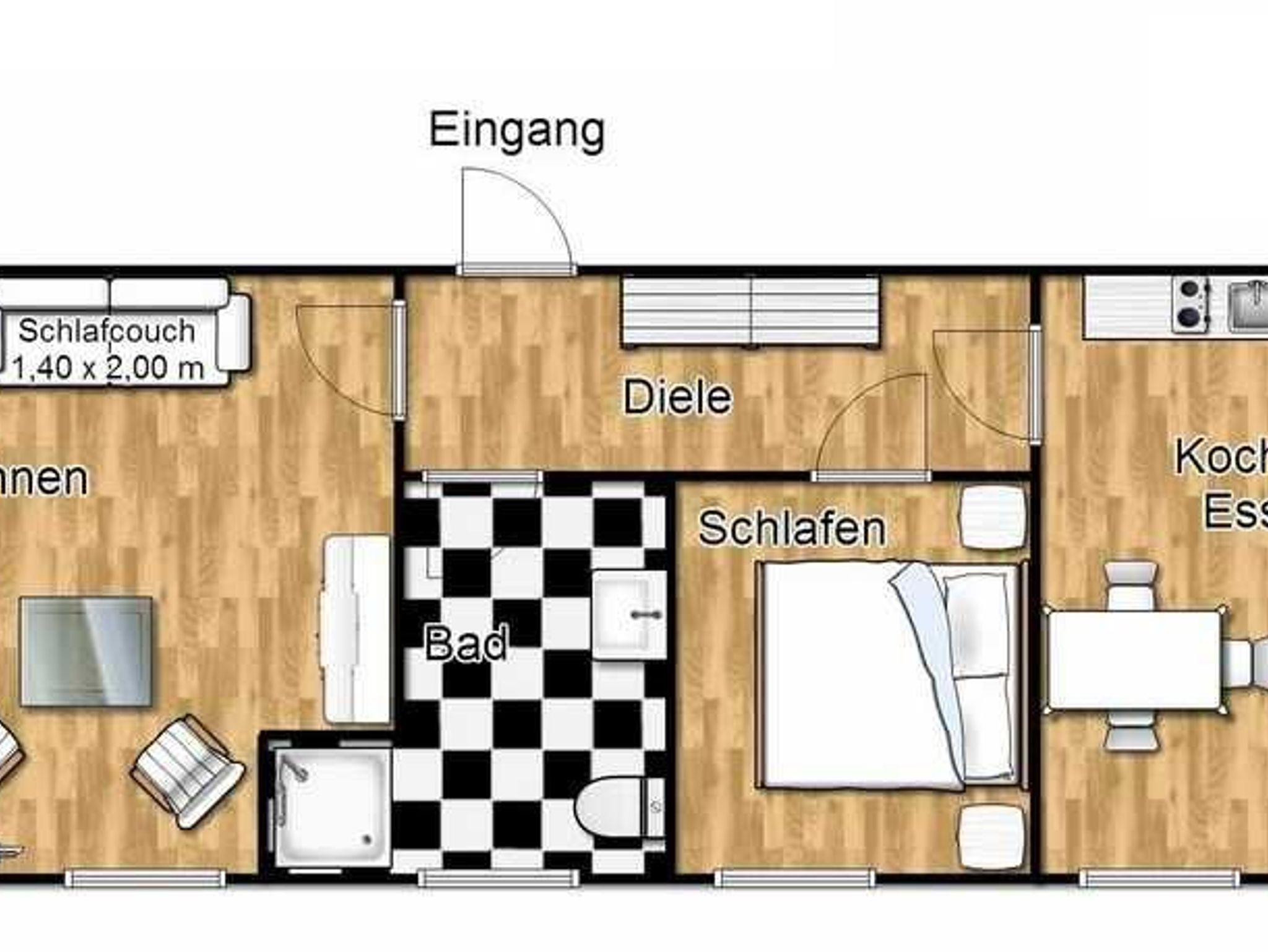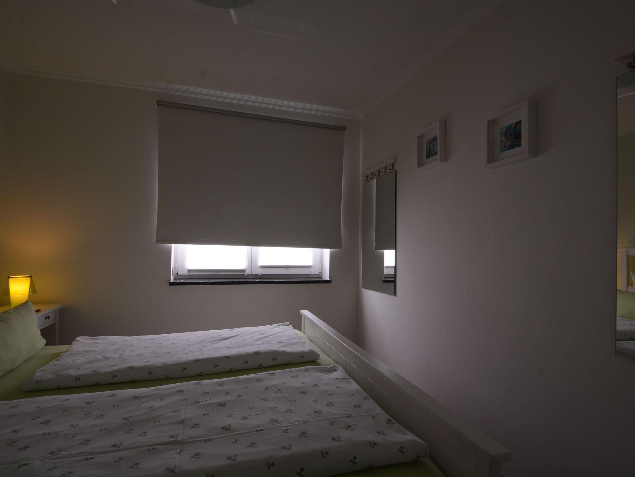 Das Schlafzimmer verfügt über ein Doppelbett 1,80m x 2,00m und ist mit einem speziellen Verdunkelung-Rollo ausgestattet. Im Wohnzimmer gibt es eine Couch mit 2 weiteren komfortablen Schlafmöglichkeiten im Gesamtformat von 1,40m x 2,00m.