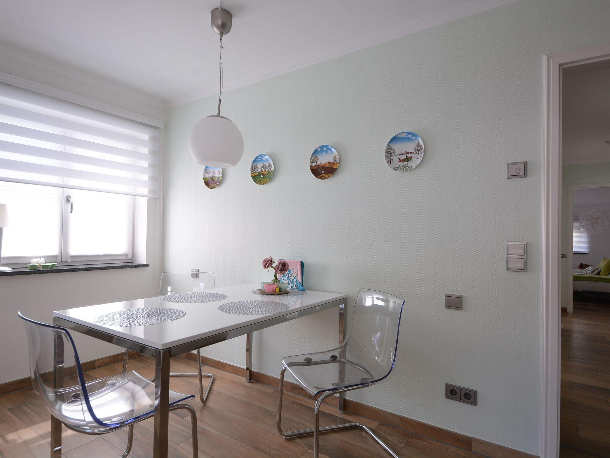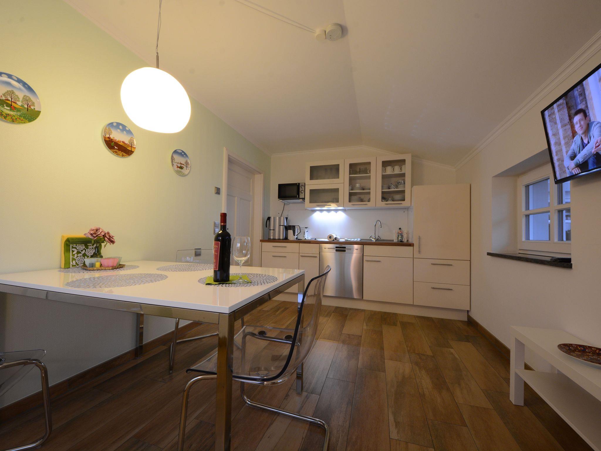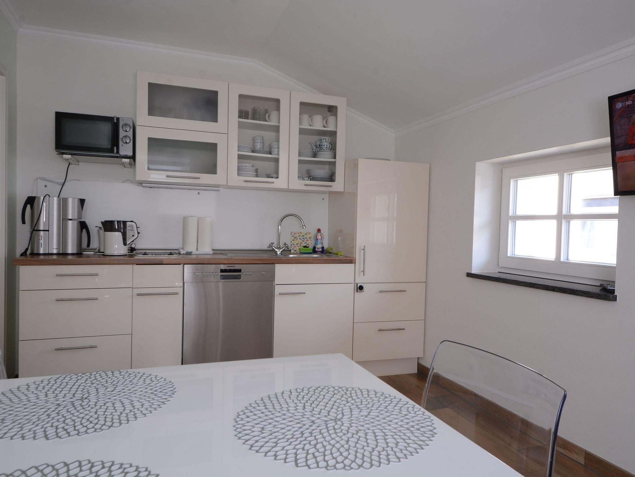 Die Kücheneinrichtung ist umfassend und befindet sich in einem separaten Raum. Hier werden Ihnen alle Annehmlichkeiten einer komfortablen Selbstversorgung geboten: Kühlschrank mit Gefrierfach, 2-fach Ceranfeld, Geschirrspüler, Mikrowelle, Ninja-Airfryer, klassische Filter-Kaffeemaschine, Toaster, Wasser- und Eierkocher. Geschirr, Gläser, Bestecke und „Küchenwerkzeuge“ sind reichlich vorhanden. Der große Küchentisch mit 4 Stühlen bietet auch für Besucher noch reichlich Platz. Im Übrigen befindet sich auch in der Küche ein HD-Smart-TV-Fersenseher!