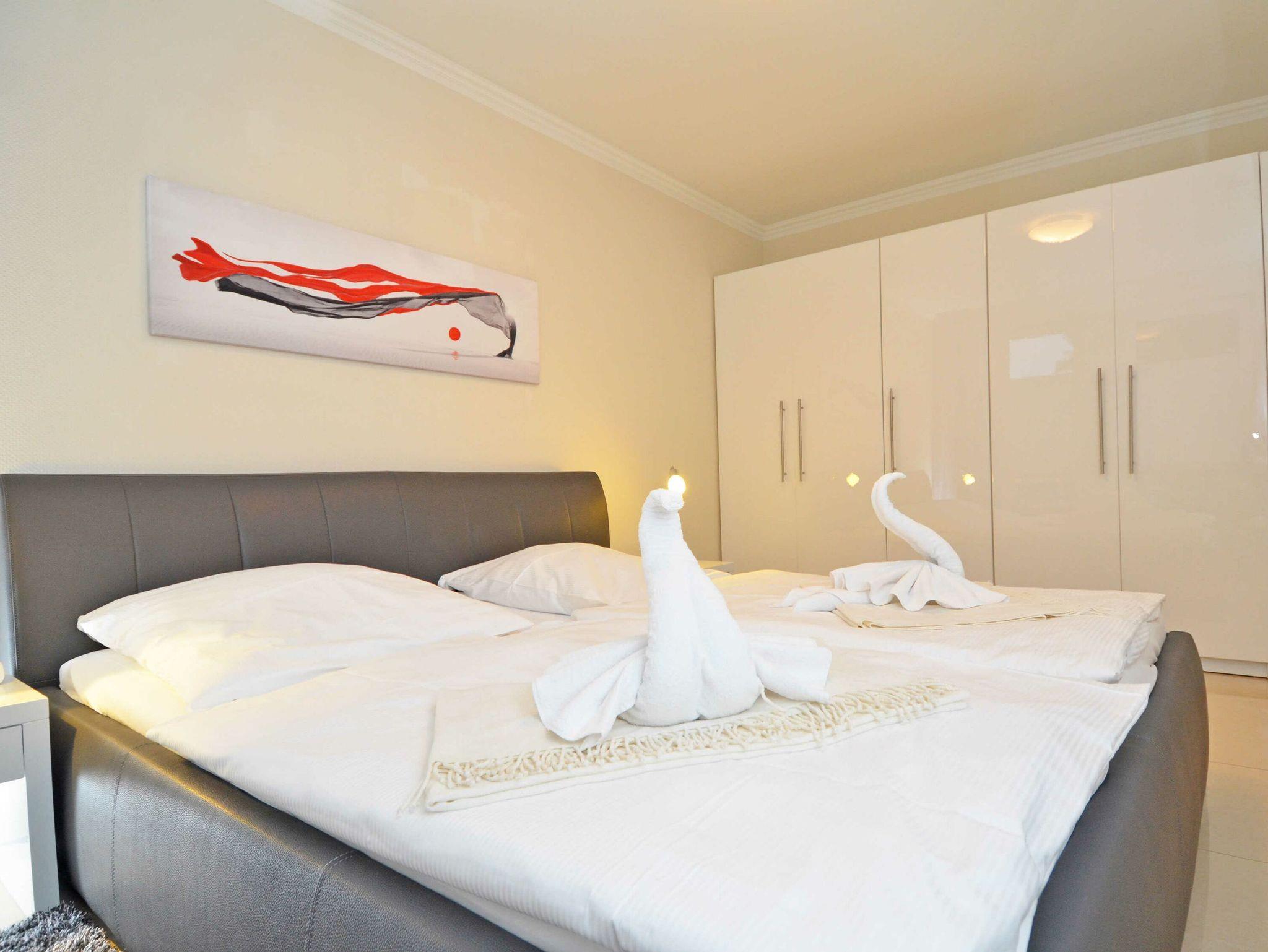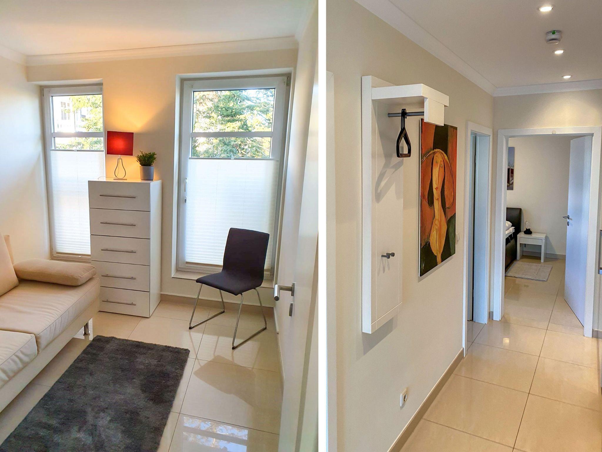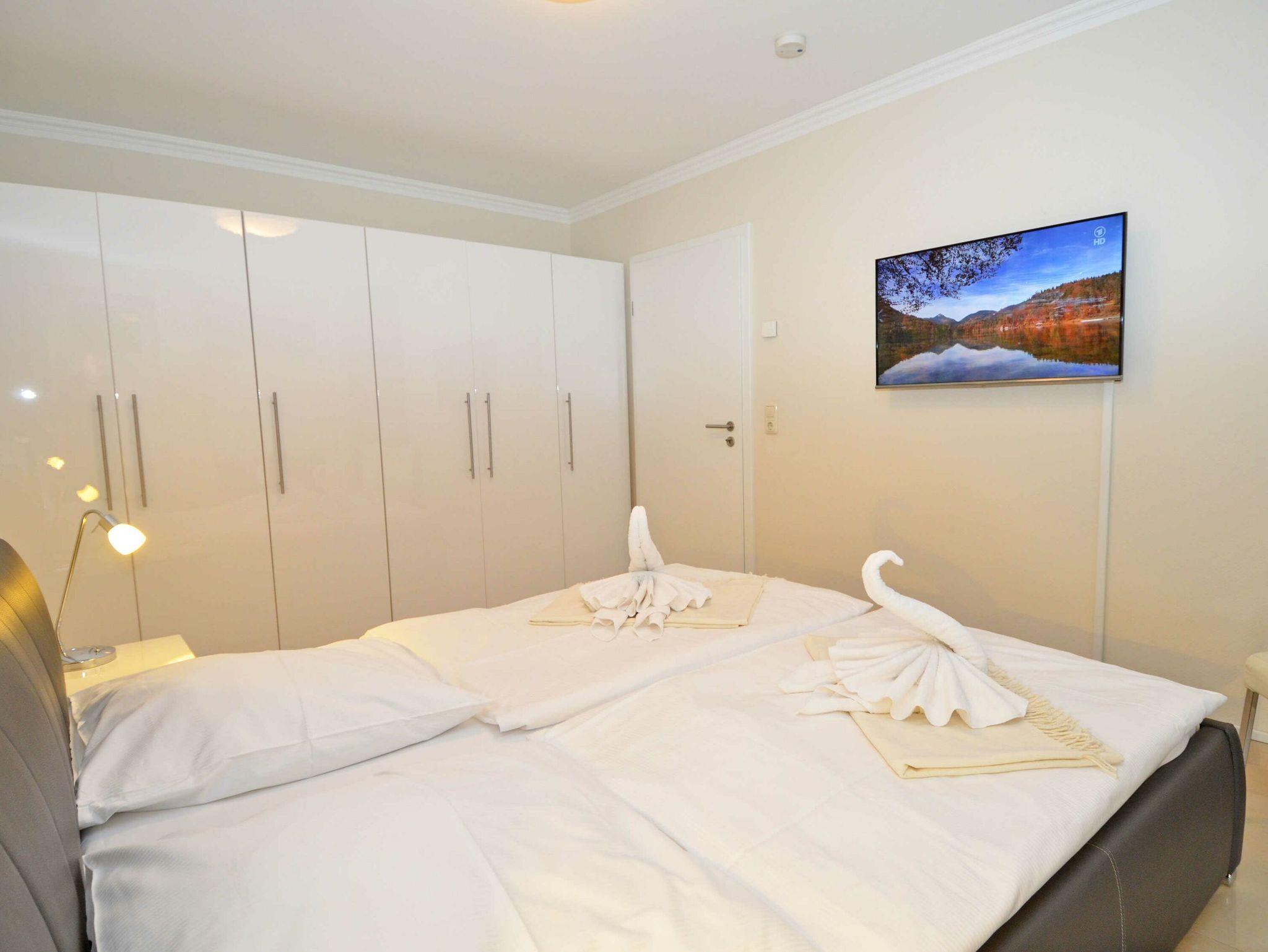 Eines der beiden Schlafzimmer verfügt über ein breites komfortables Doppelbett und einen zusätzlichen Fernseher, das andere über eine hochwertige Schlafcouch (Liegefläche 1,60 x 2,00m). Das exklusive Tageslichtbad Ihrer Fewo ist neben Dusche/WC u.a. mit einem Handtuchwärmer ausgestattet.