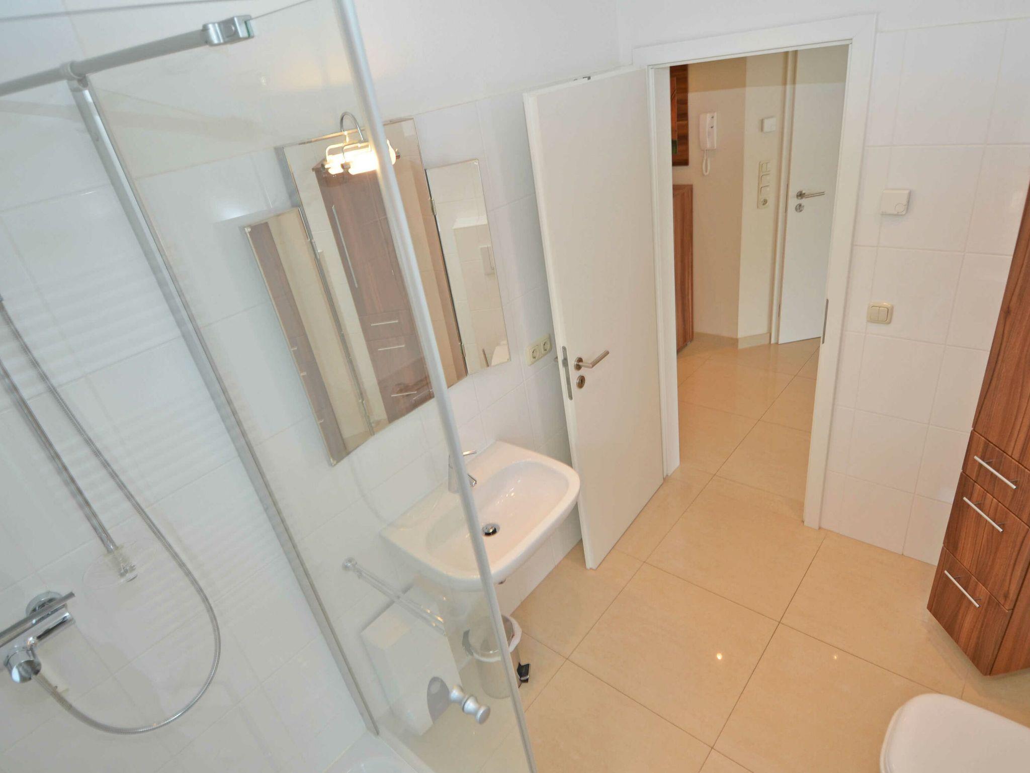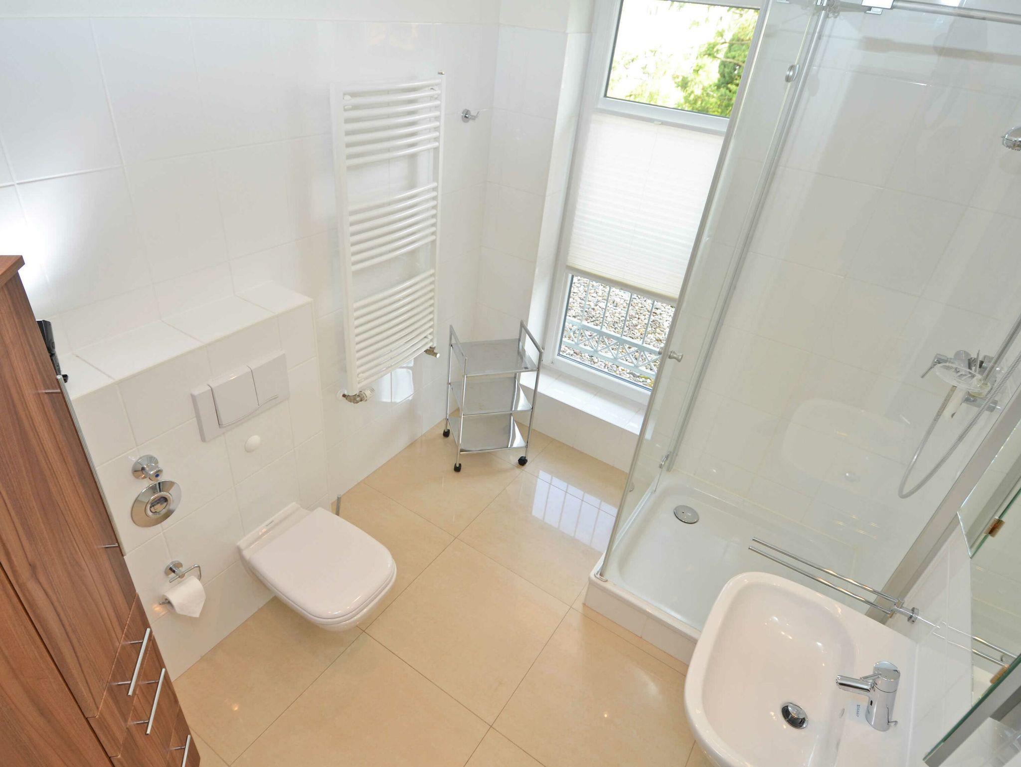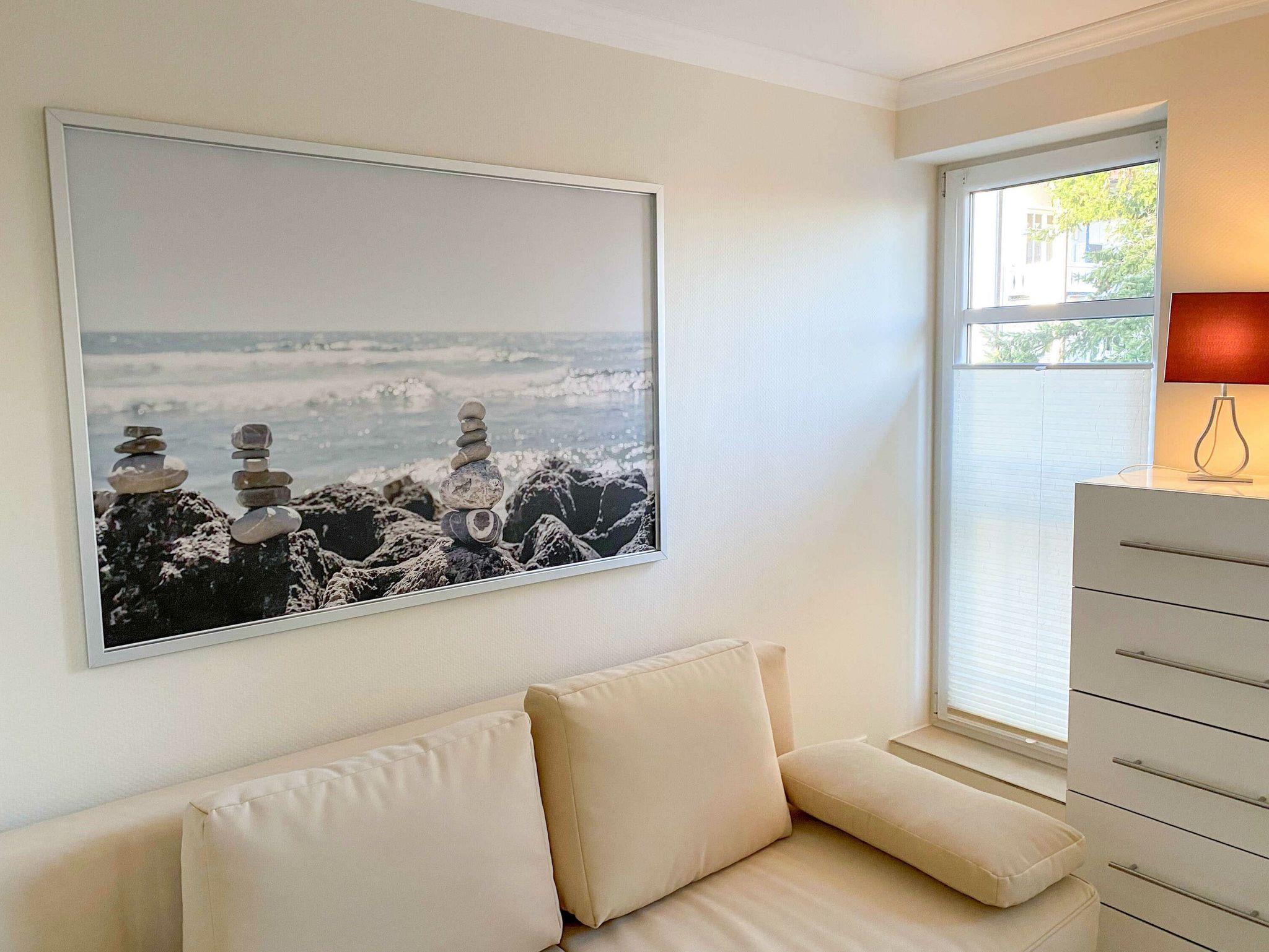 Eines der beiden Schlafzimmer verfügt über ein breites komfortables Doppelbett und einen zusätzlichen Fernseher, das andere über eine hochwertige Schlafcouch (Liegefläche 1,60 x 2,00m). Das exklusive Tageslichtbad Ihrer Fewo ist neben Dusche/WC u.a. mit einem Handtuchwärmer ausgestattet.