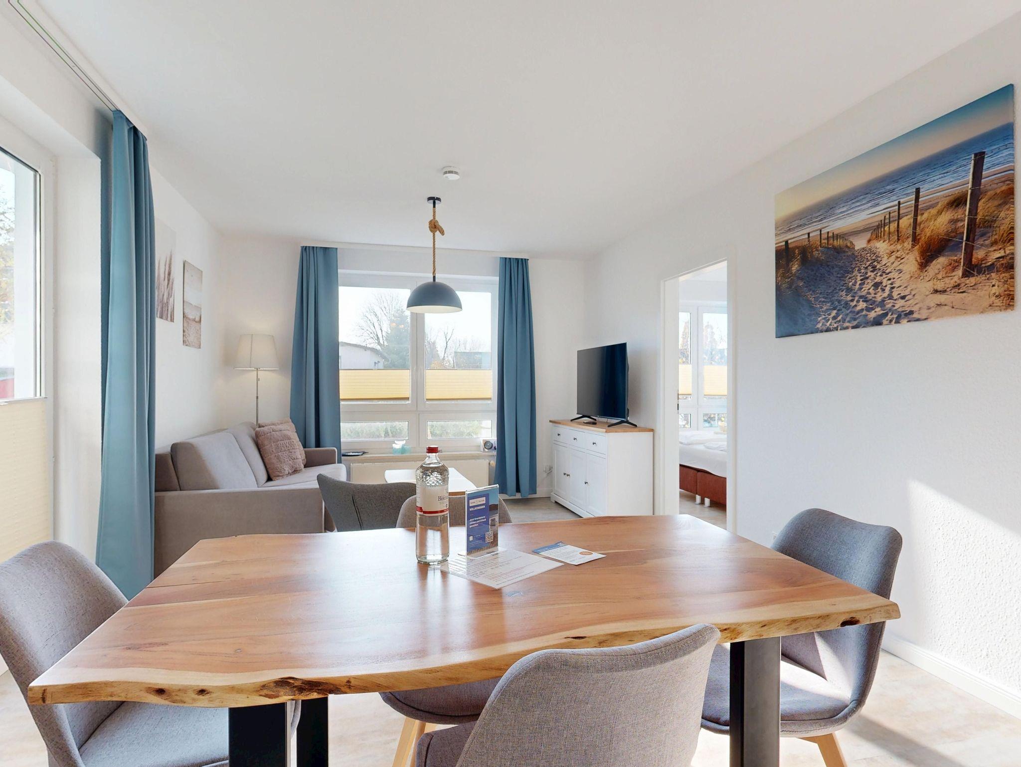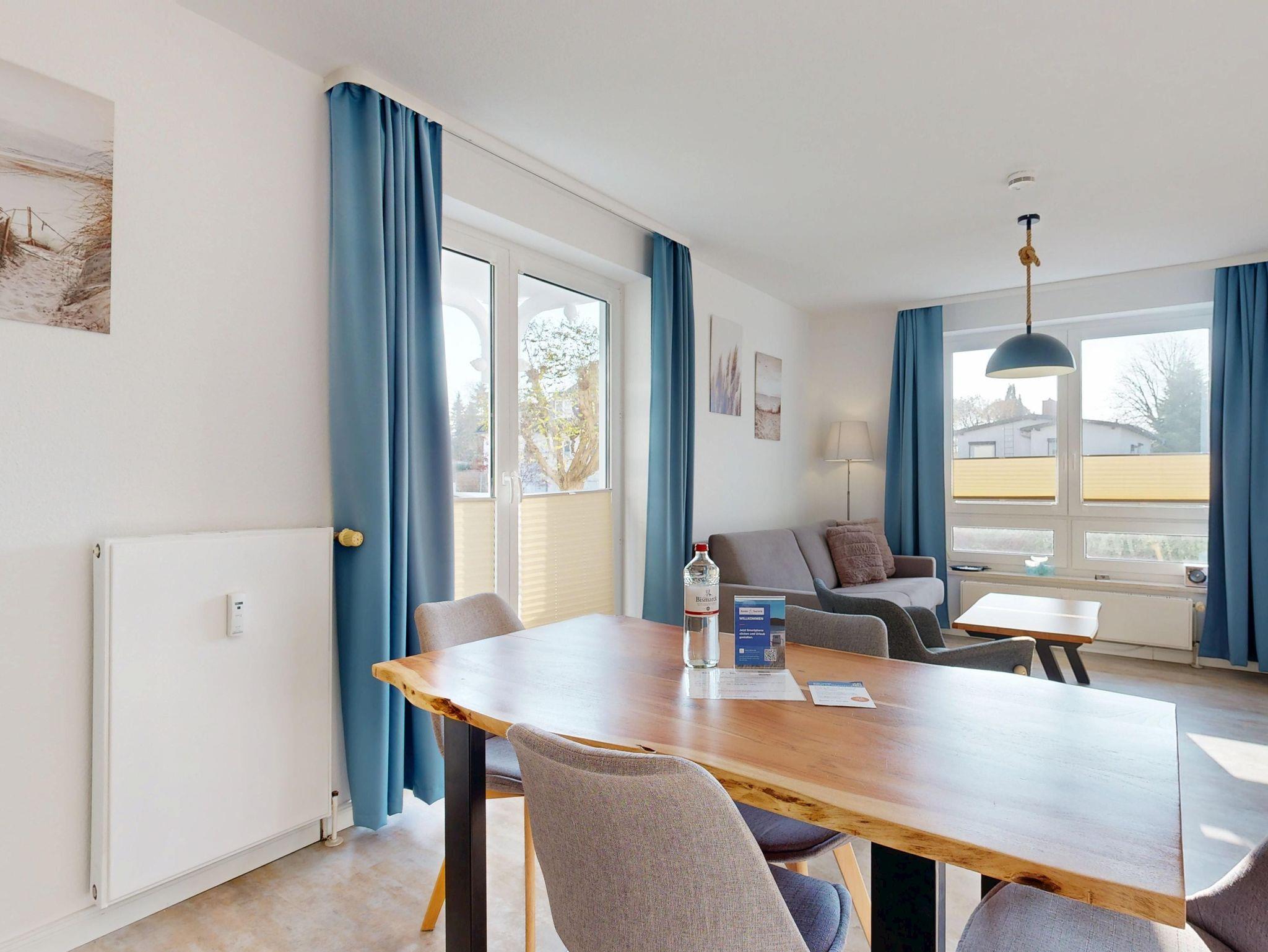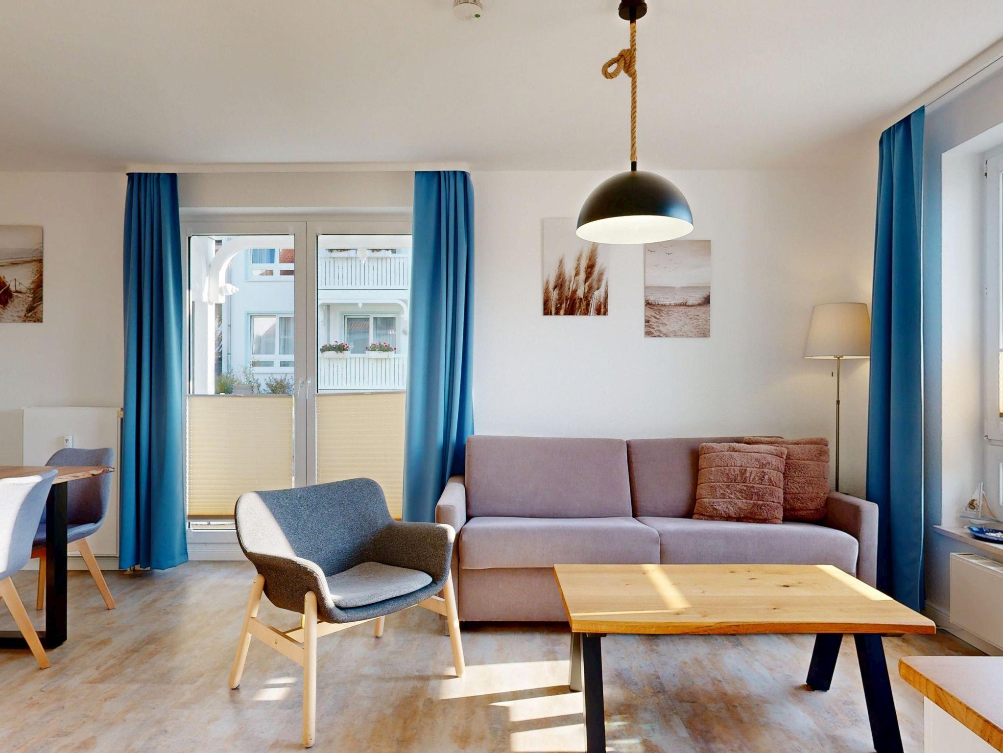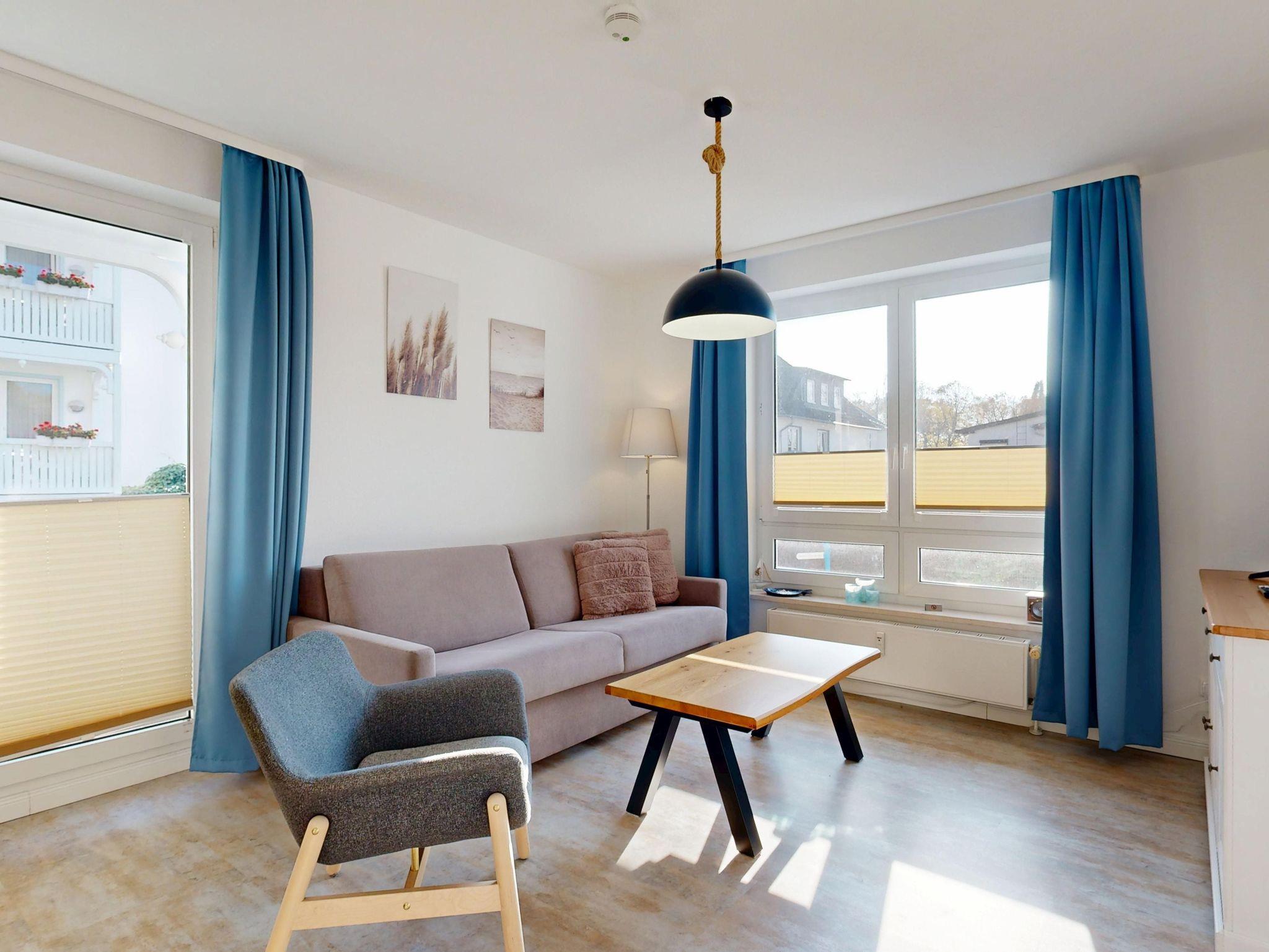Ferienwohnung Binzer Sterne 23 für bis zu 4 Personen im Erdgeschoss (2 Zimmer / 45 m²) des Appartementhauses Binzer Sterne, 1 Schlafzimmer, Parkplatz (gegen Gebühr) und freies WLAN.