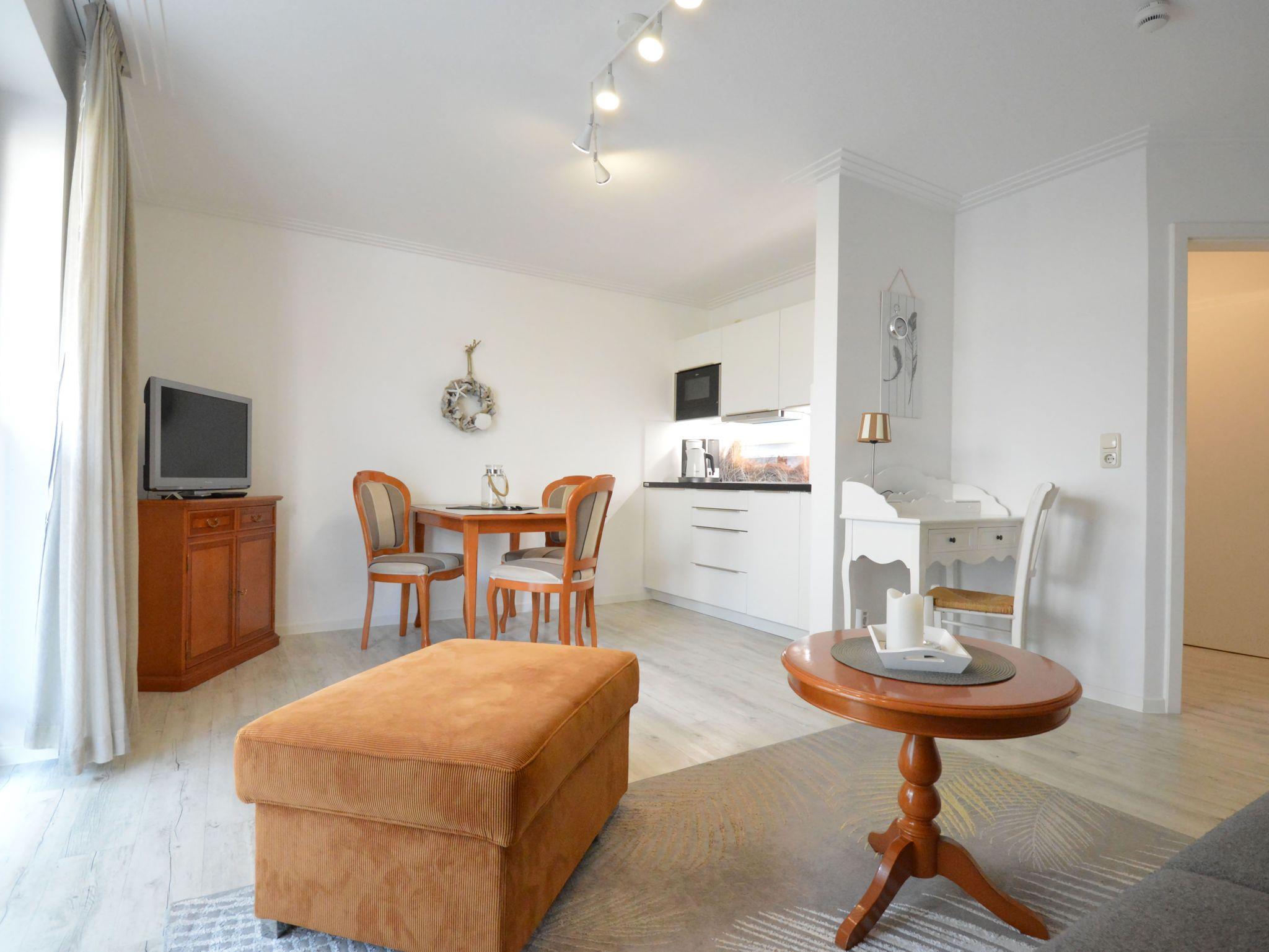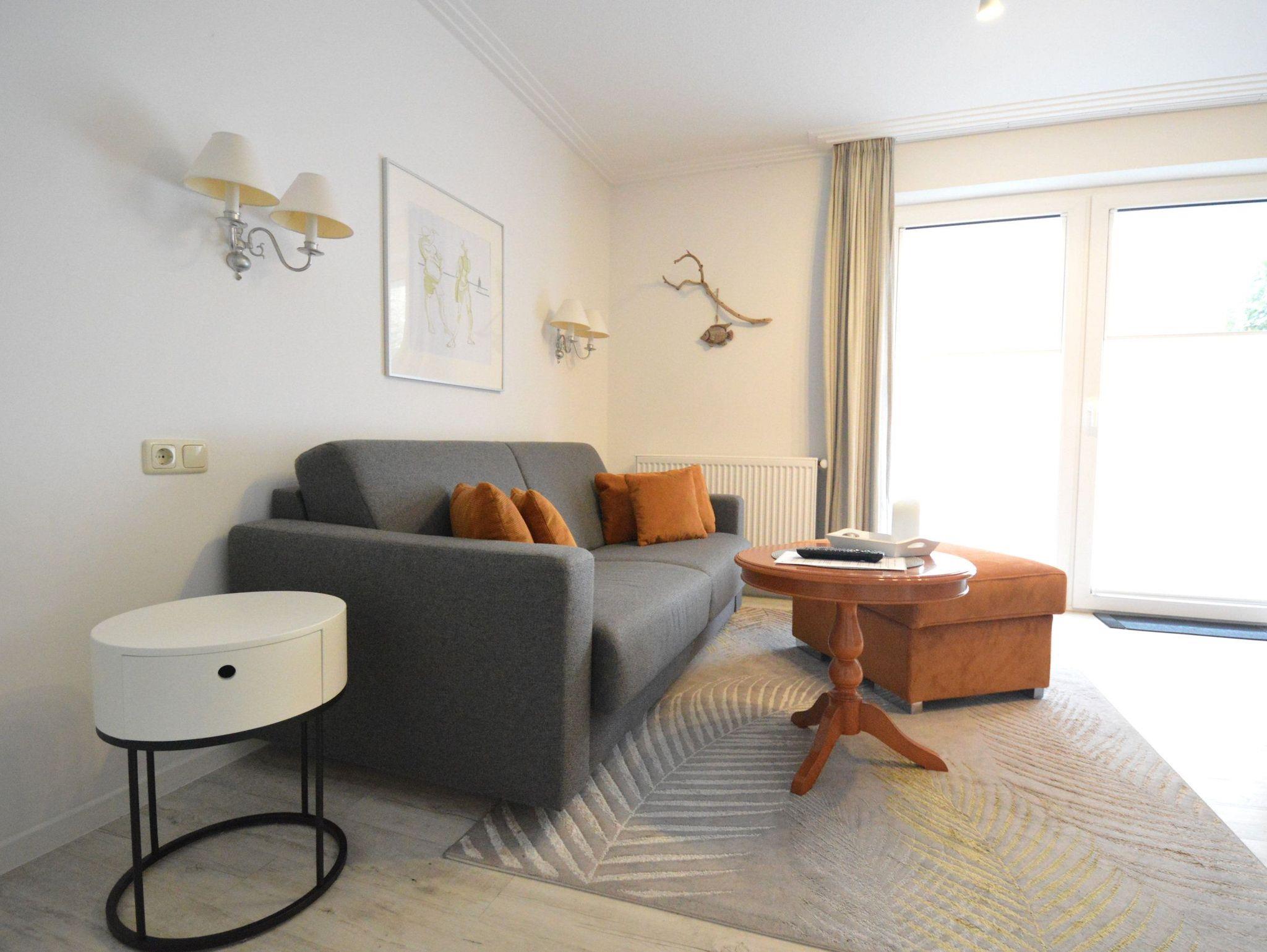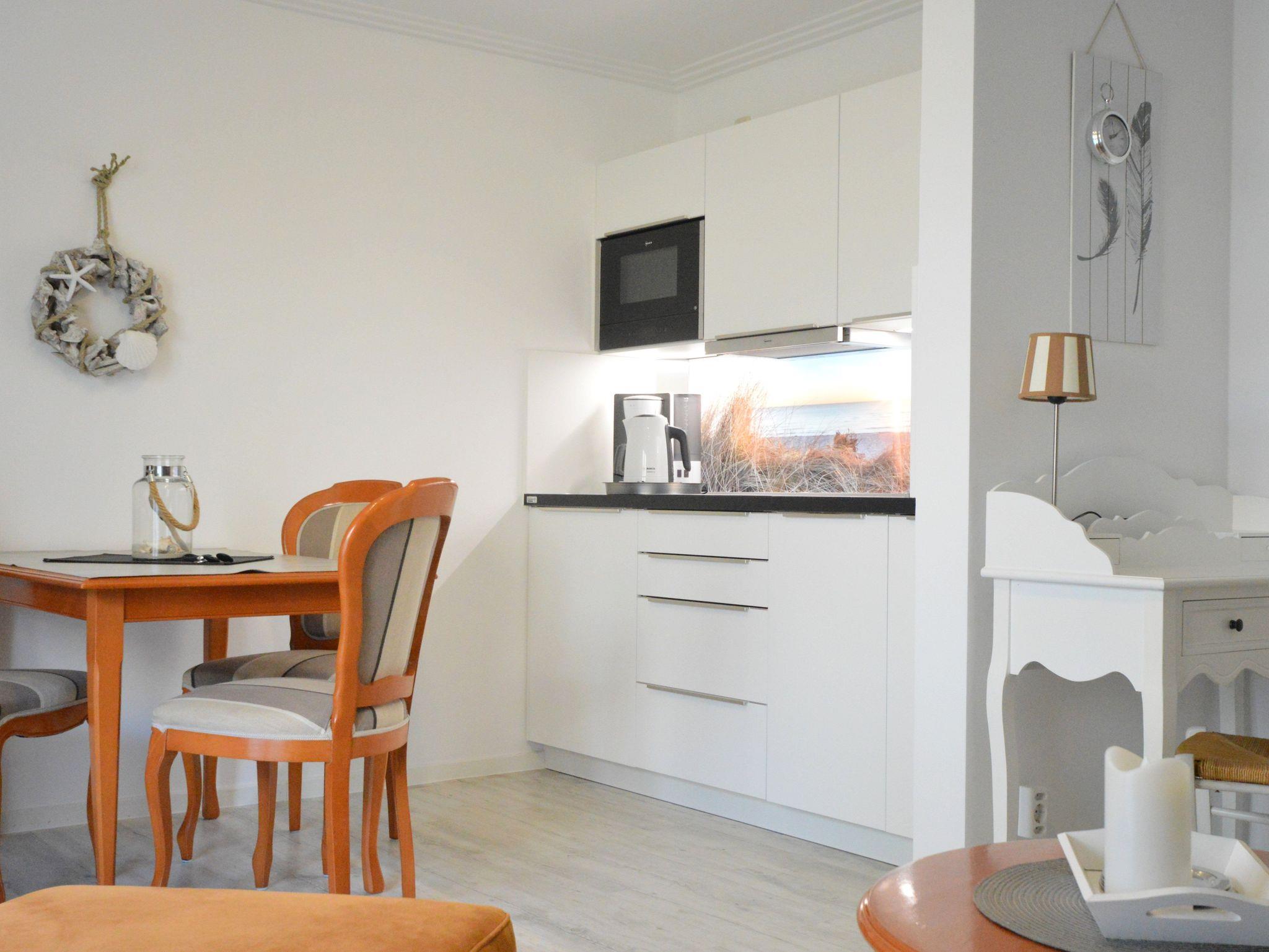 Das Apartment im Gartengeschoss mit 45m² befindet sich in der Apartment-Villa Steinfurth, welche direkt am Meer liegt und bietet Platz für 2 Personen. Das Apartment liegt im Gartengeschoss, vom Wohnraum aus erreicht man eine großzügige Terrasse mit Gartenmöbeln. Der helle, große Wohnbereich mit Küchenzeile, Essplatz und TV ist gemütlich und modern möbliert. Die Küchenzeile ist ausgestattet mit 4-Platten-Cerankochfeld, Mikrowelle, Geschirrspüler, Kühlschrank, Kaffeemaschine, Wasserkocher und Toaster. Das Schlafzimmer verfügt über ein Doppellbett mit einer Liegefläche von 180 x 200 cm. Ein Duschbad mit WC und Haartrockner ist ebenfalls vorhanden. Ein Parkplatz befindet sich direkt am Haus. Fahrradabstellplätze stehen gesichert nur begrenzt zur Verfügung. Bitte stellen Sie sich darauf ein, dass ihr Fahrrad u.U. nur im Freien abgestellt werden kann.