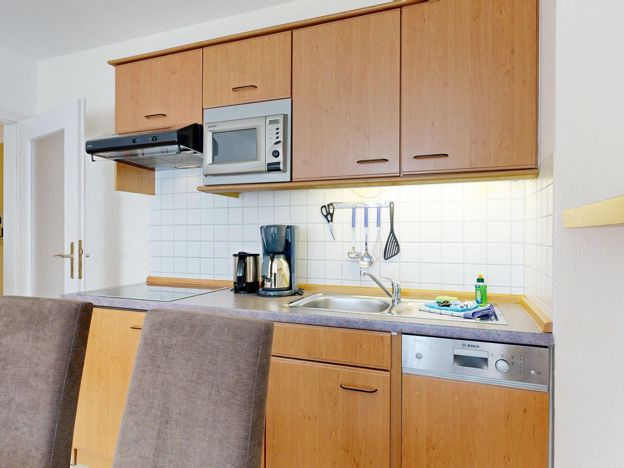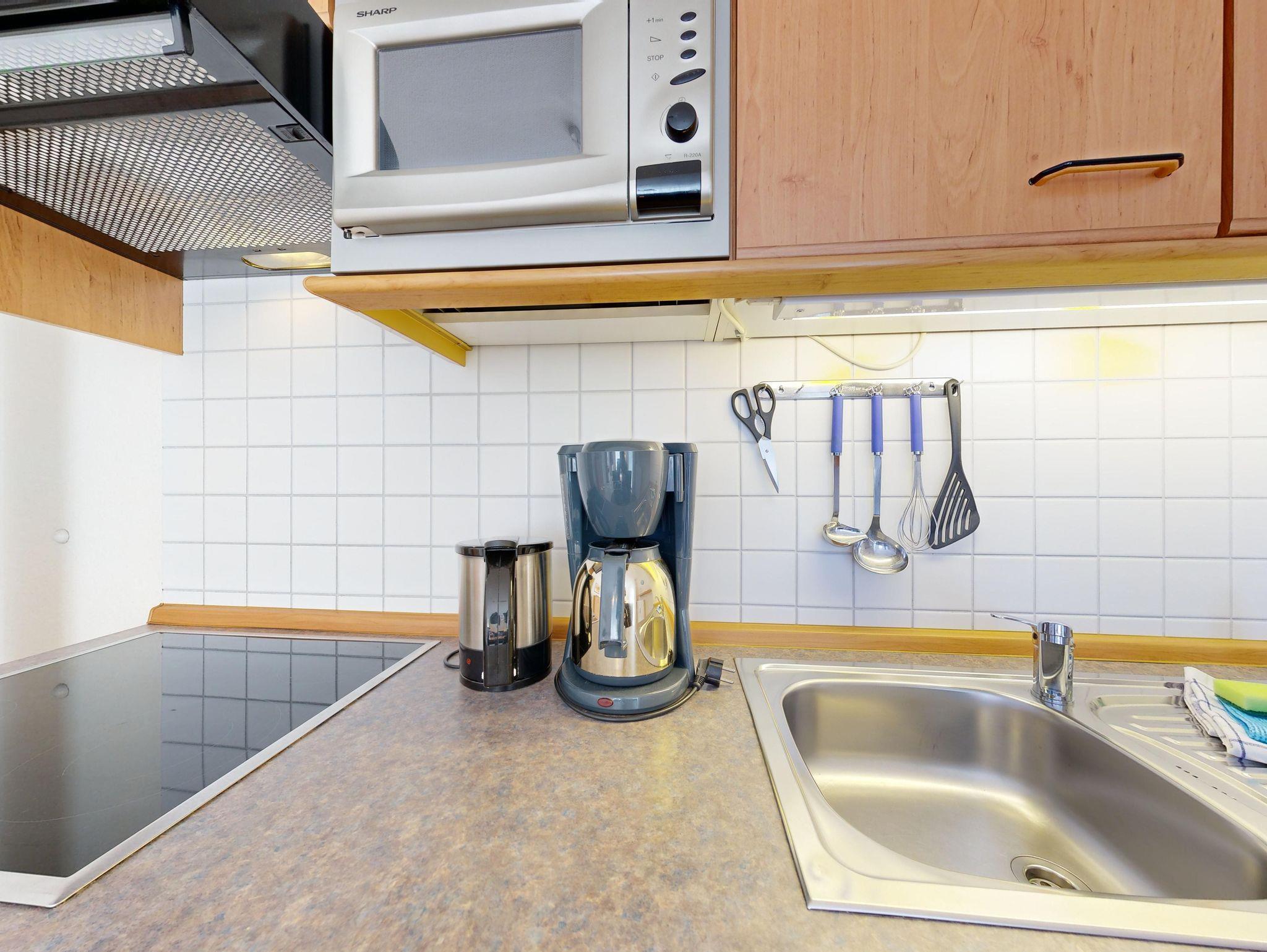 Küchenzeile mit Spülmaschine, Ceranfeld, Mikrowelle, Kaffeemaschine, Toaster und Kühlschrank mit Gefrierfach