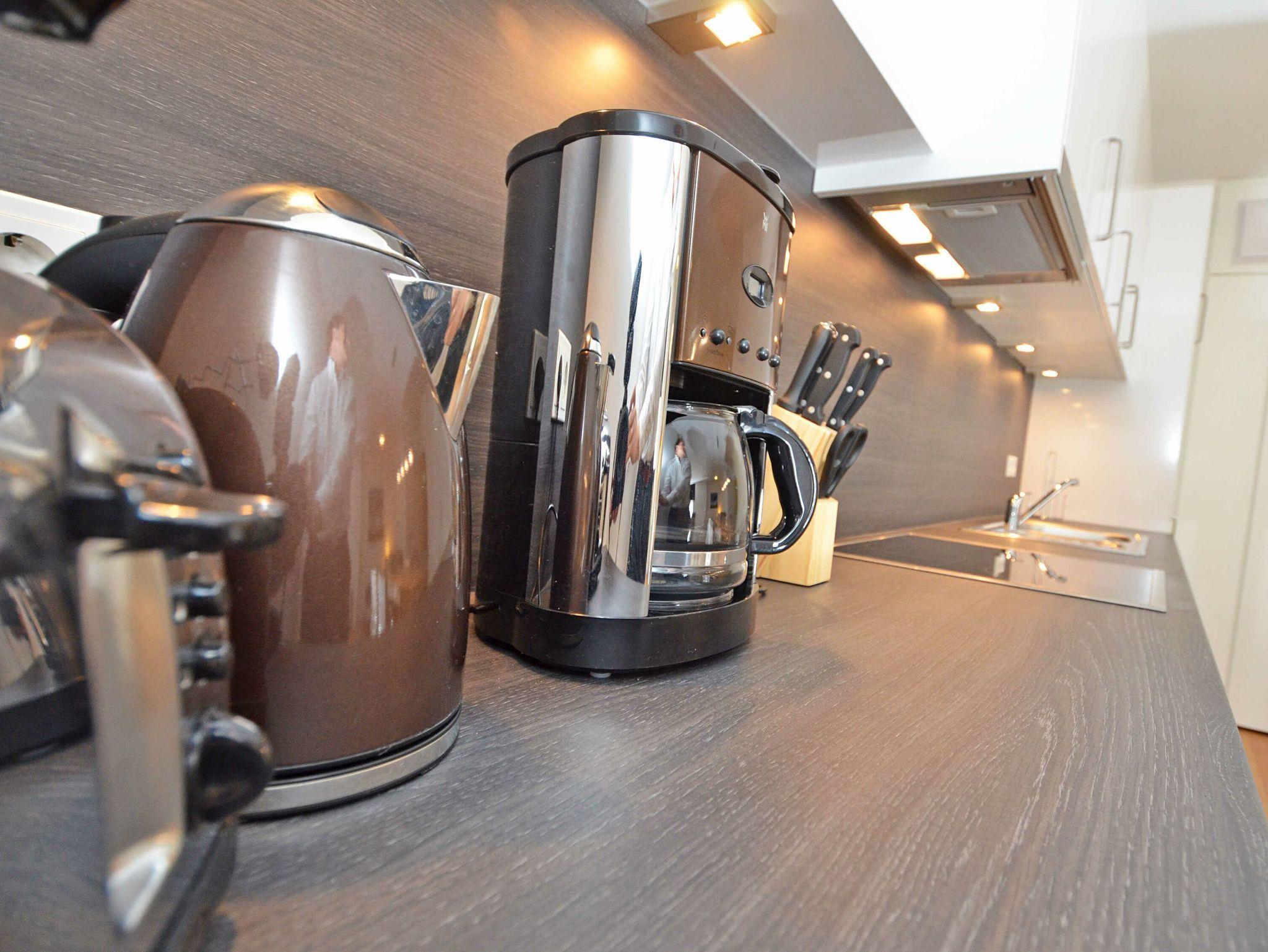 In der integrierten Küchenzeile finden Sie einen Kühlschrank mit Gefrierfach, einen Backofen, ein 4-Platten-Ceranfeld, eine Spülmaschine und diverses Kleininventar, so dass Sie nach Herzenslust selbst kochen können. Und wenn Sie mögen, speisen Sie auf dem Balkon (ca. 8 qm), von dem Sie sogar einen seitlichen Meerblick genießen können.