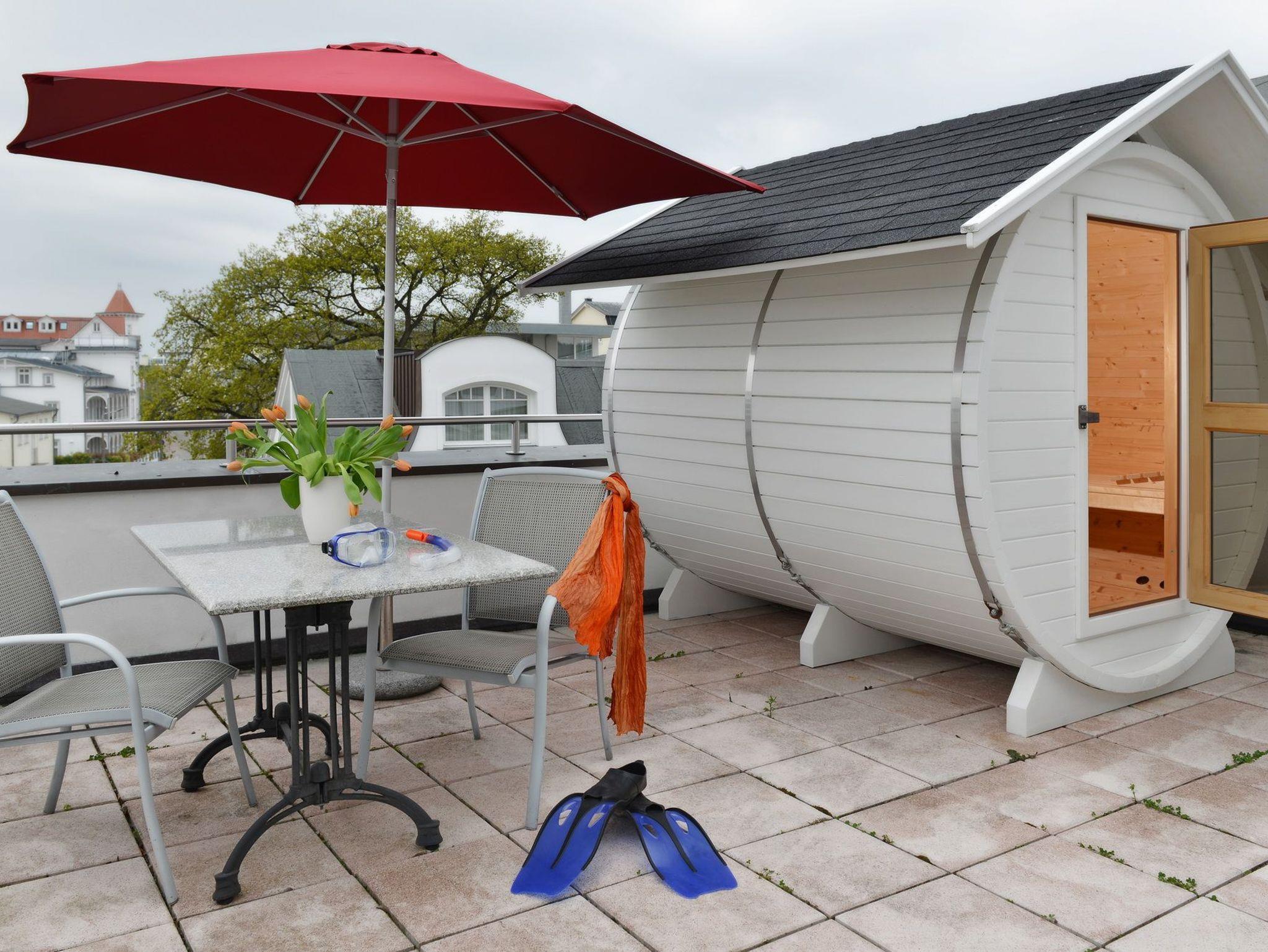 Luxuriöses Penthouse direkt an der Binzer Strandpromenade mit Meerblick, Sauna und zwei Dachterrassen.