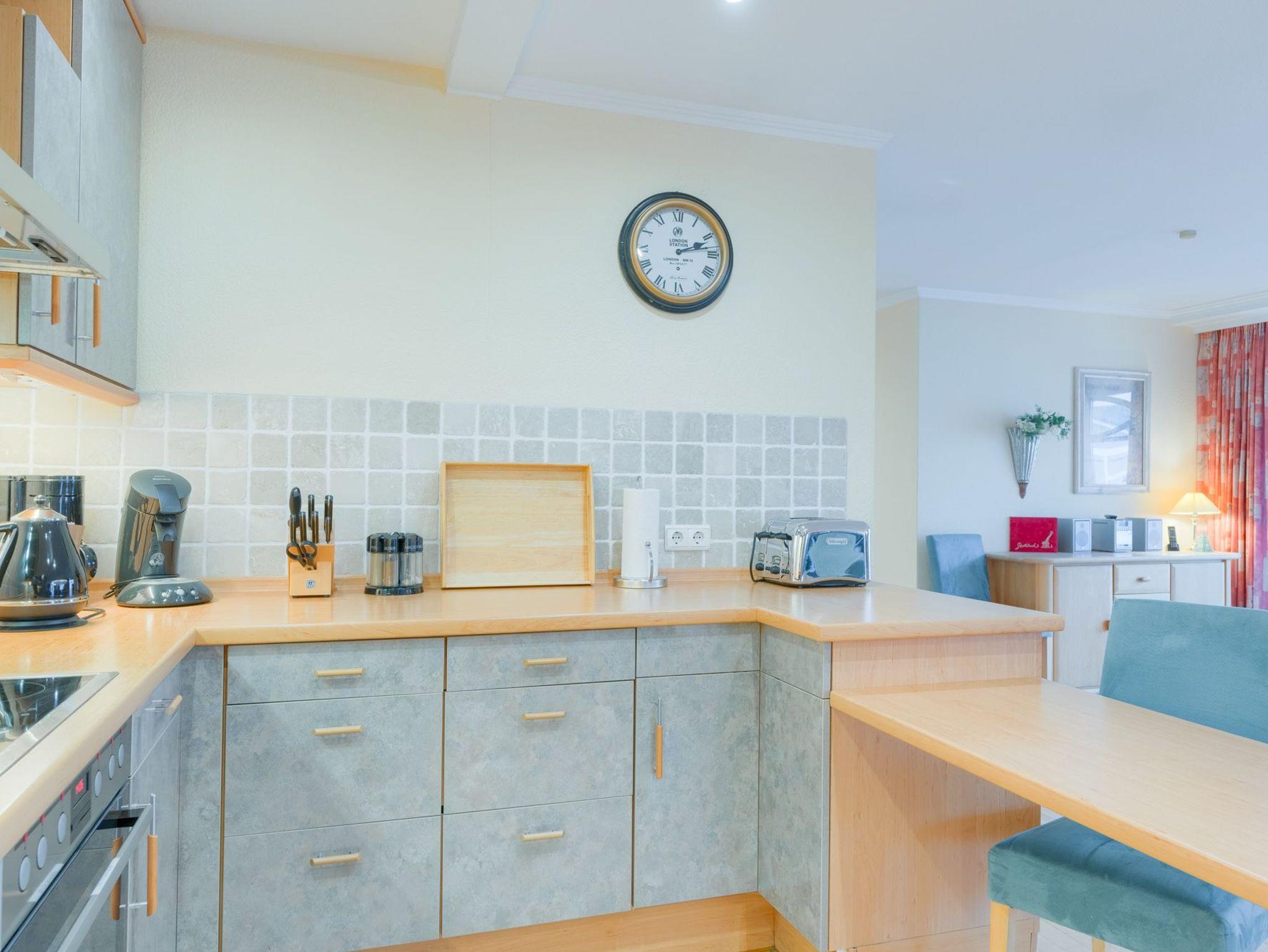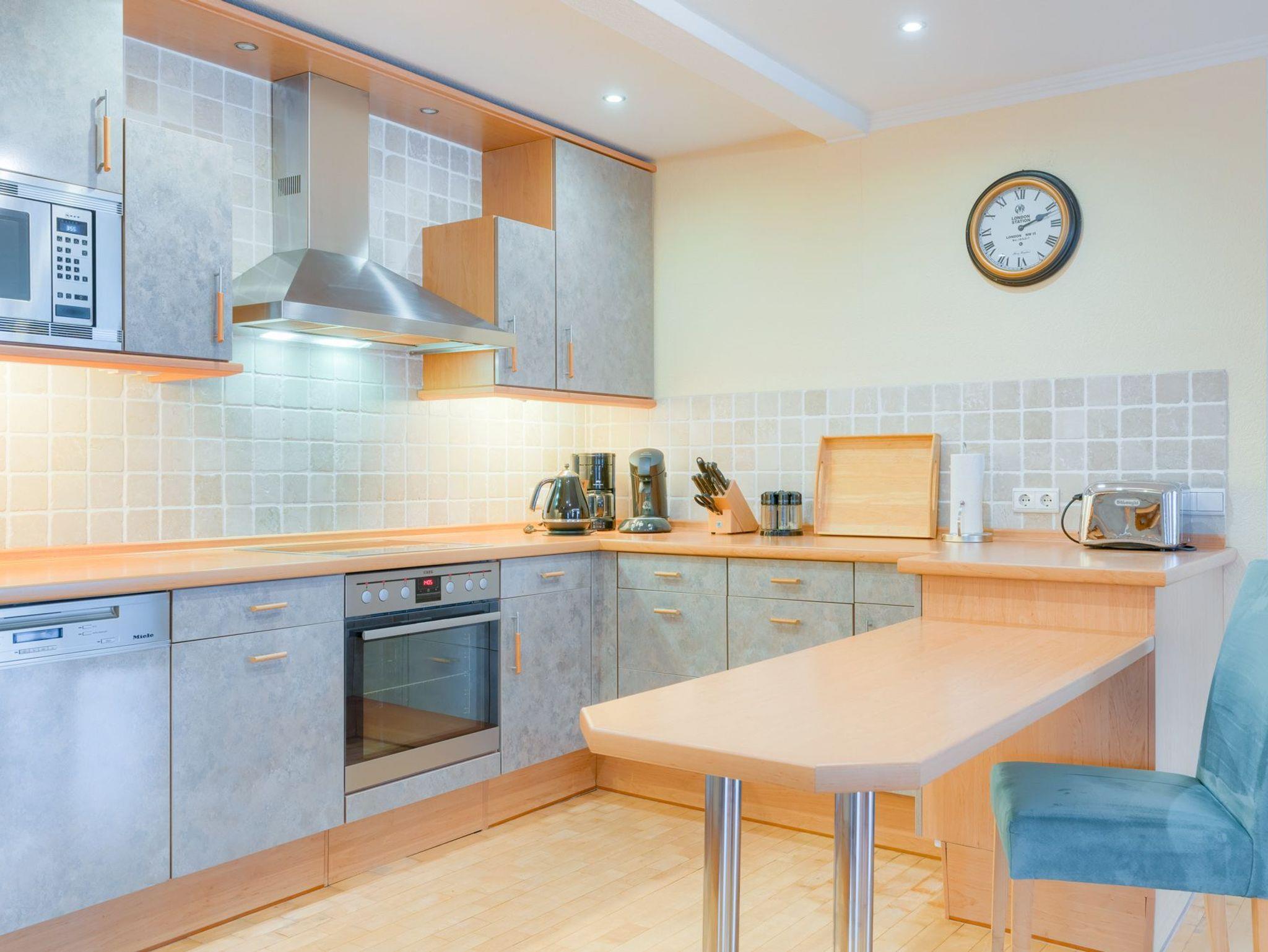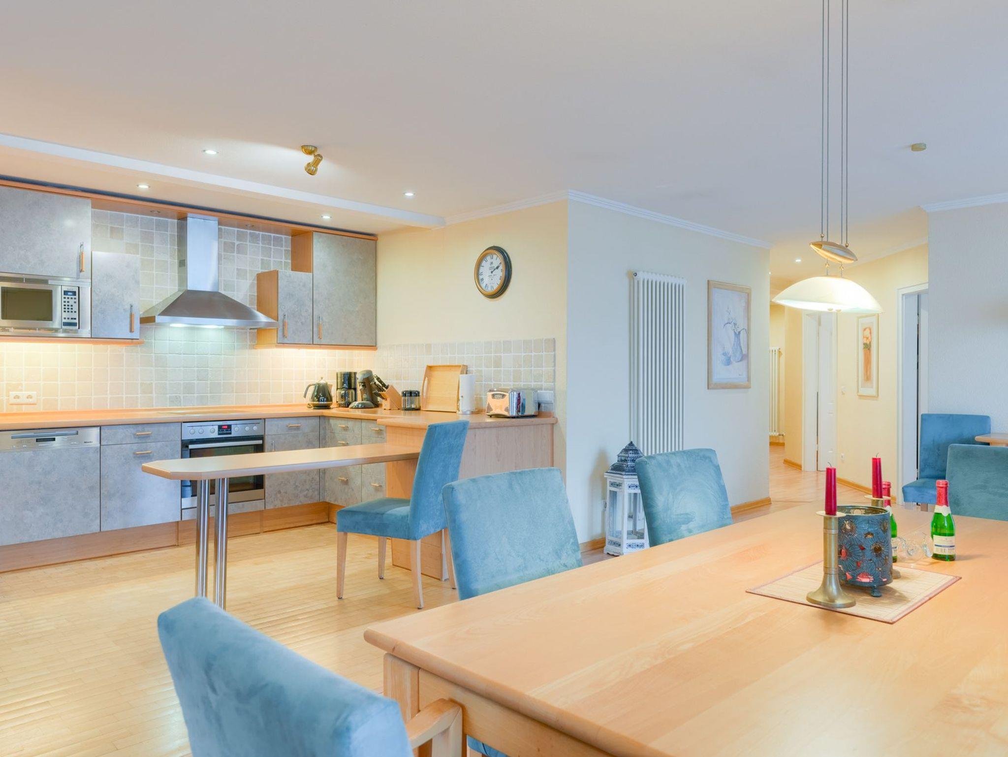 Die hier angrenzende Küchenzeile ist mit einem Kühlschrank mit Gefrierfach, einem Geschirrspüler, einem Backofen mit Cerankochfeld und einer Mikrowelle ausgestattet. Eine Kaffeemaschine, ein Toaster, ein Eierkocher und ein Wasserkocher stehen Ihnen hier selbstverständlich zur Verfügung.