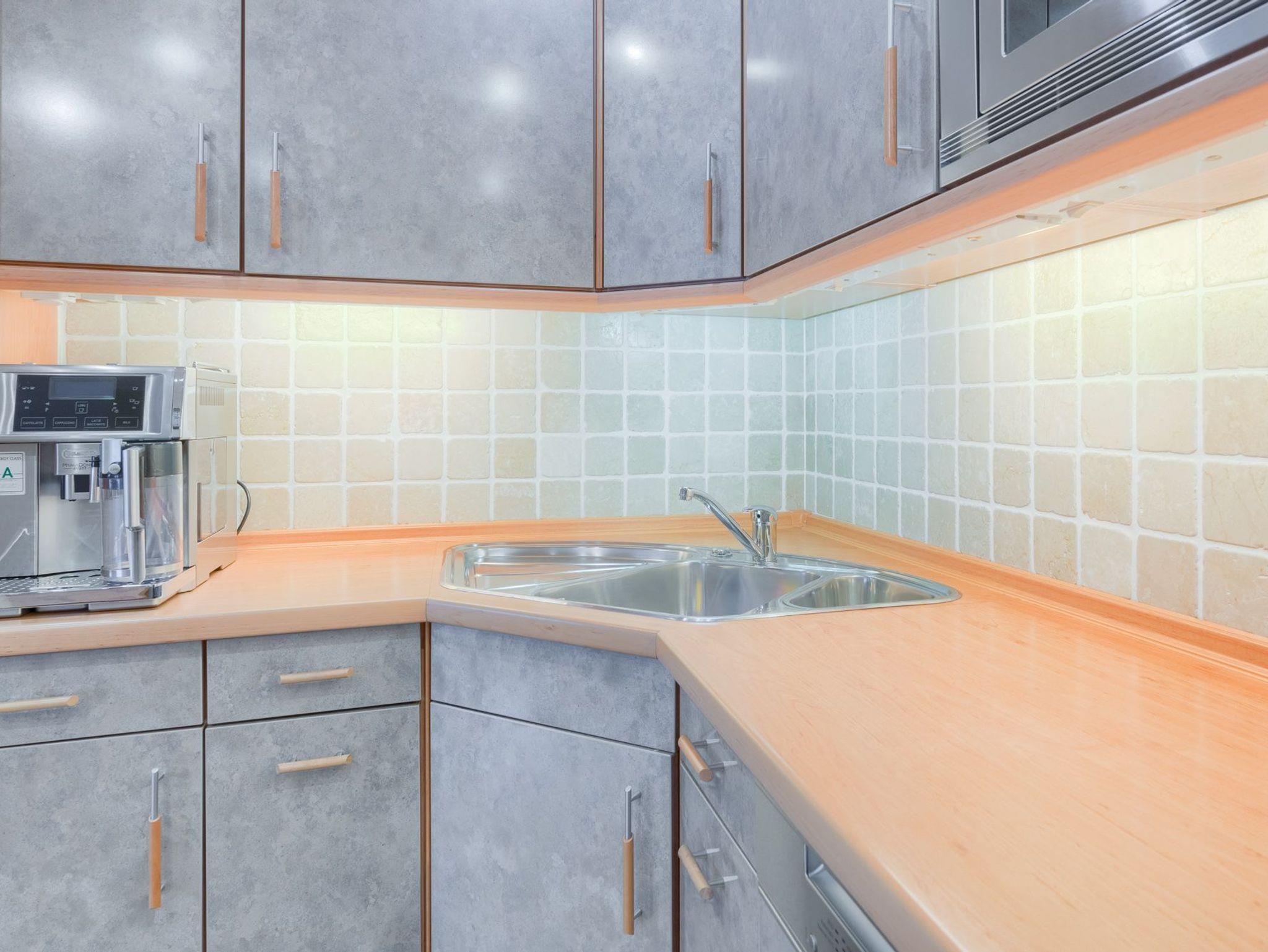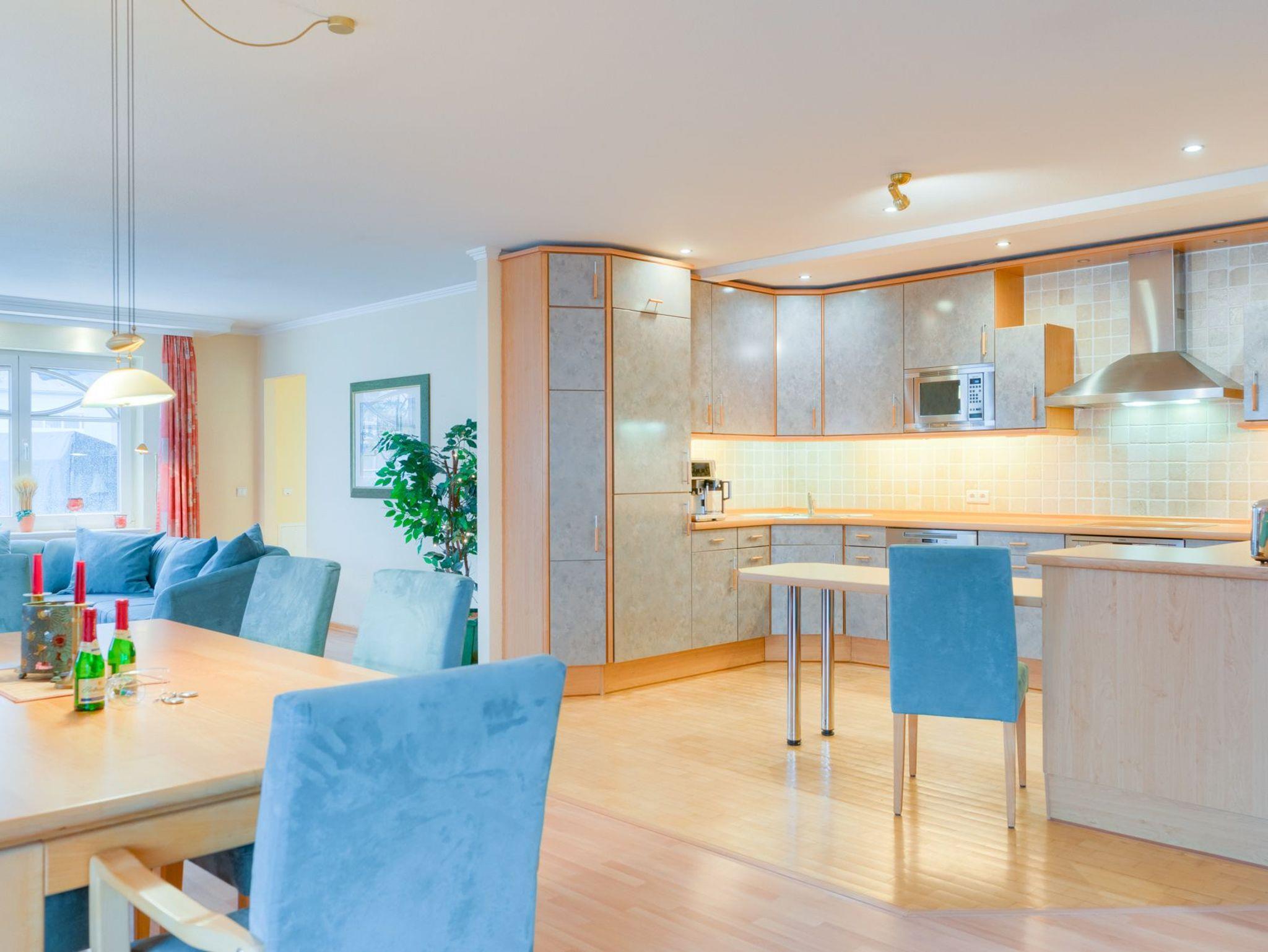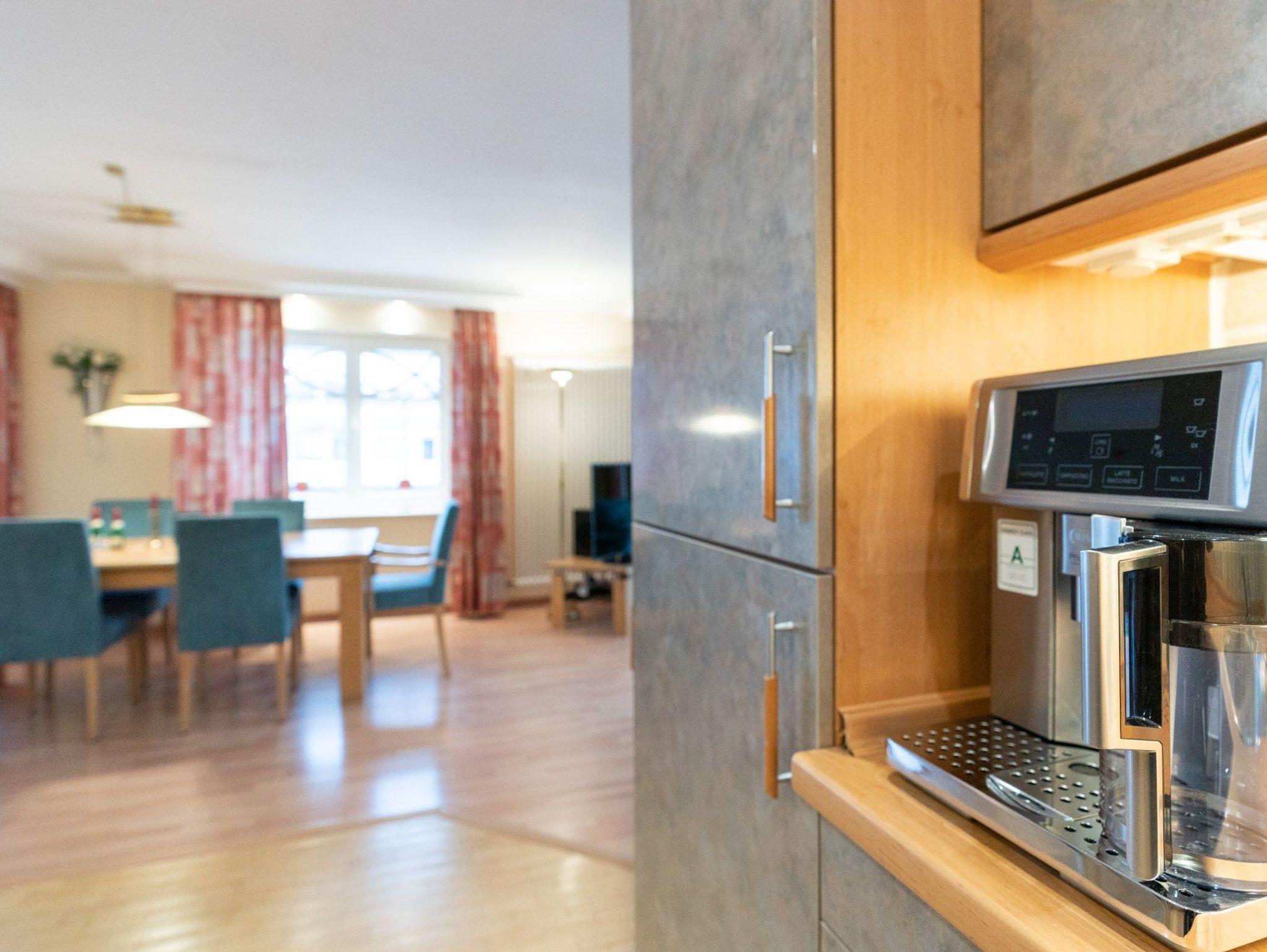 Die hier angrenzende Küchenzeile ist mit einem Kühlschrank mit Gefrierfach, einem Geschirrspüler, einem Backofen mit Cerankochfeld und einer Mikrowelle ausgestattet. Eine Kaffeemaschine, ein Toaster, ein Eierkocher und ein Wasserkocher stehen Ihnen hier selbstverständlich zur Verfügung.