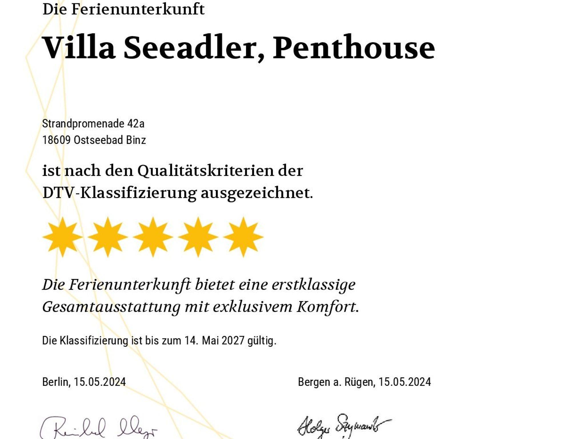 Das 130 m ² große und mit 5 DTV Sternen klassifizierte Penthouse befindet sich im Obergeschoss in der Villa Seeadler. Es bietet mit 4 Zimmern und außergewöhnlicher Großzügigkeit einen Wohnkomfort für bis zu 6 Personen auf höchstem Niveau.