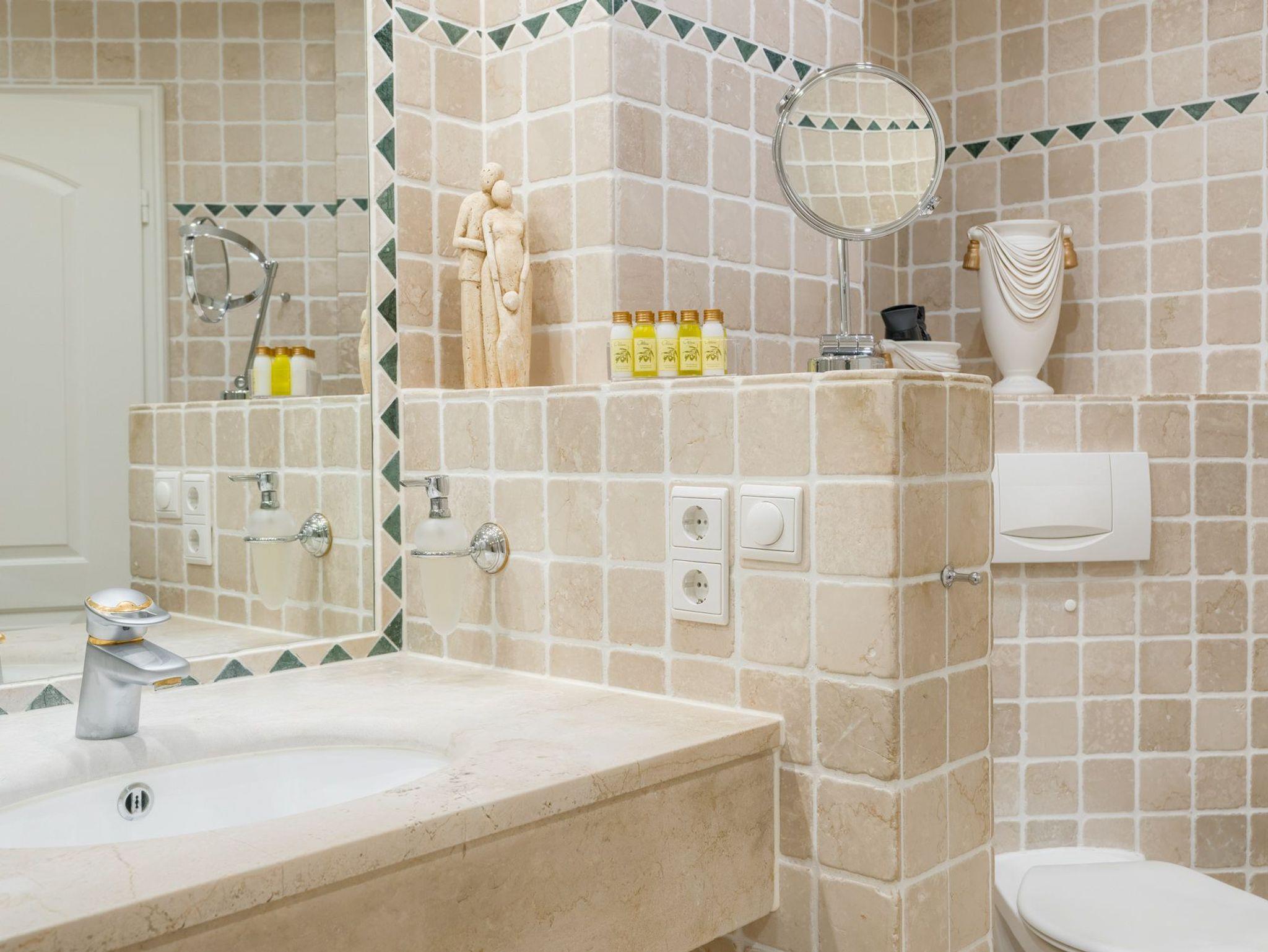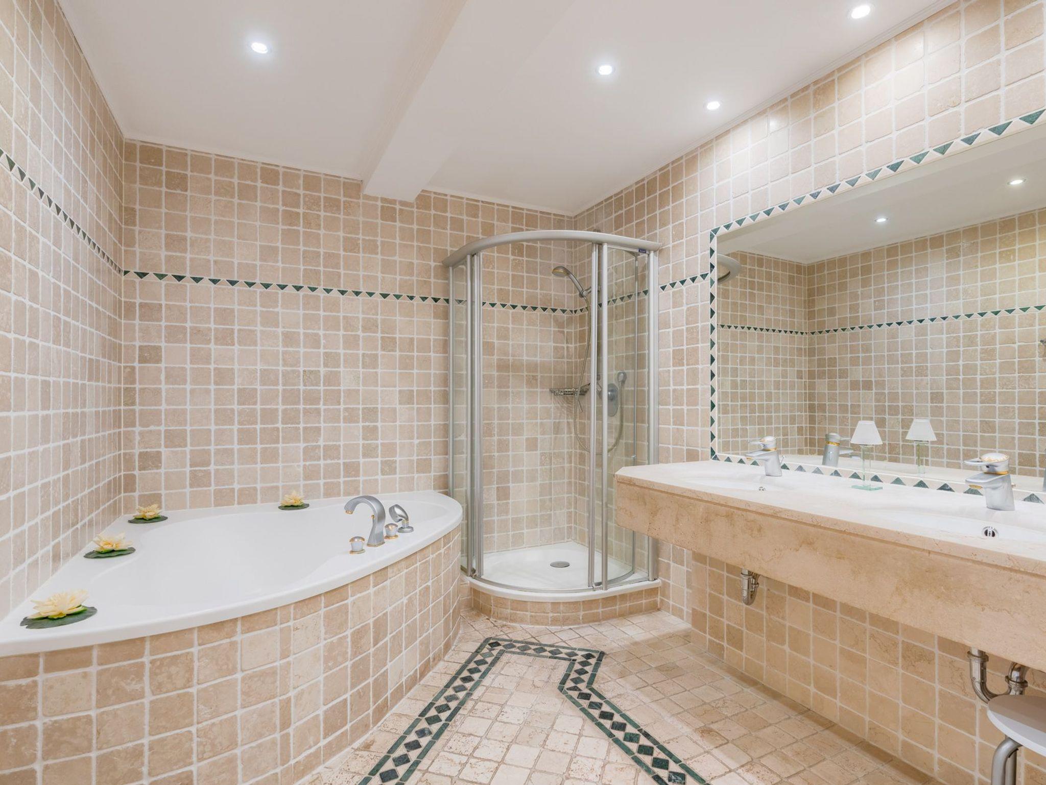 Eines der beiden Bäder ist mit italienischen Fliesen, einer großen Eckbadewanne, WC, sowie einer Dusche und einem Doppelwaschbecken ausgestattet.