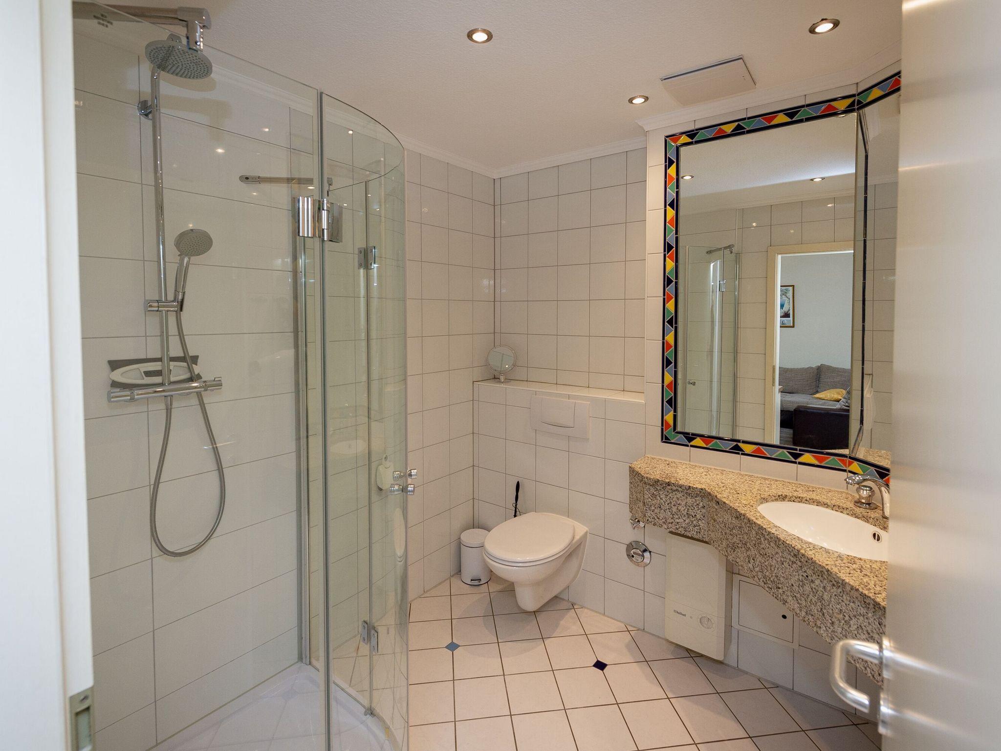 Das separate Schlafzimmer ist mit einem bequemen Boxspringbett und einem Kleiderschrank ausgestattet. Darüber hinaus steht Ihnen ein modernes Badezimmer mit Dusche/WC, Waschbecken, Fön, Kosmetikspiegel und Handtuchheizung zur Verfügung.