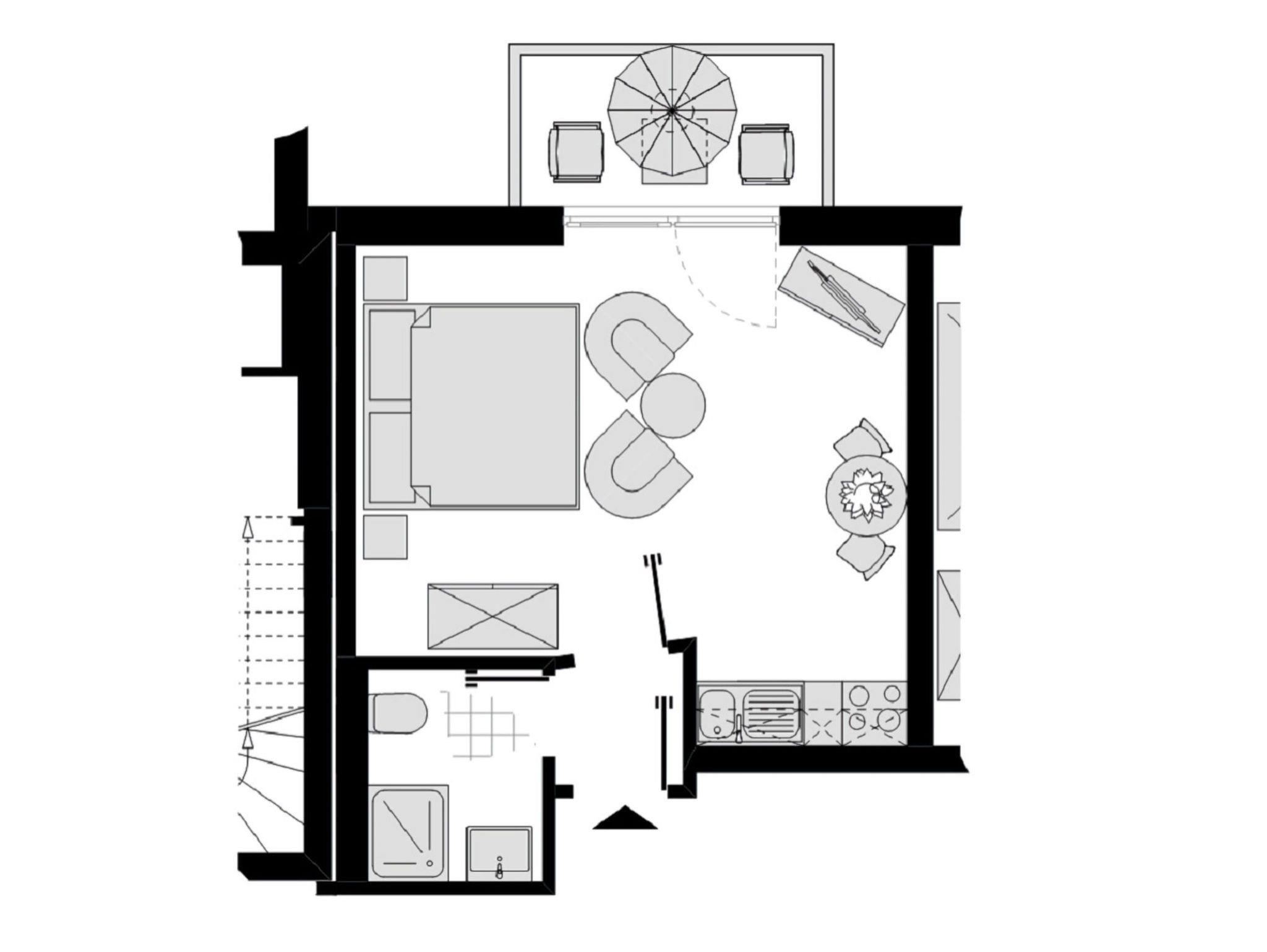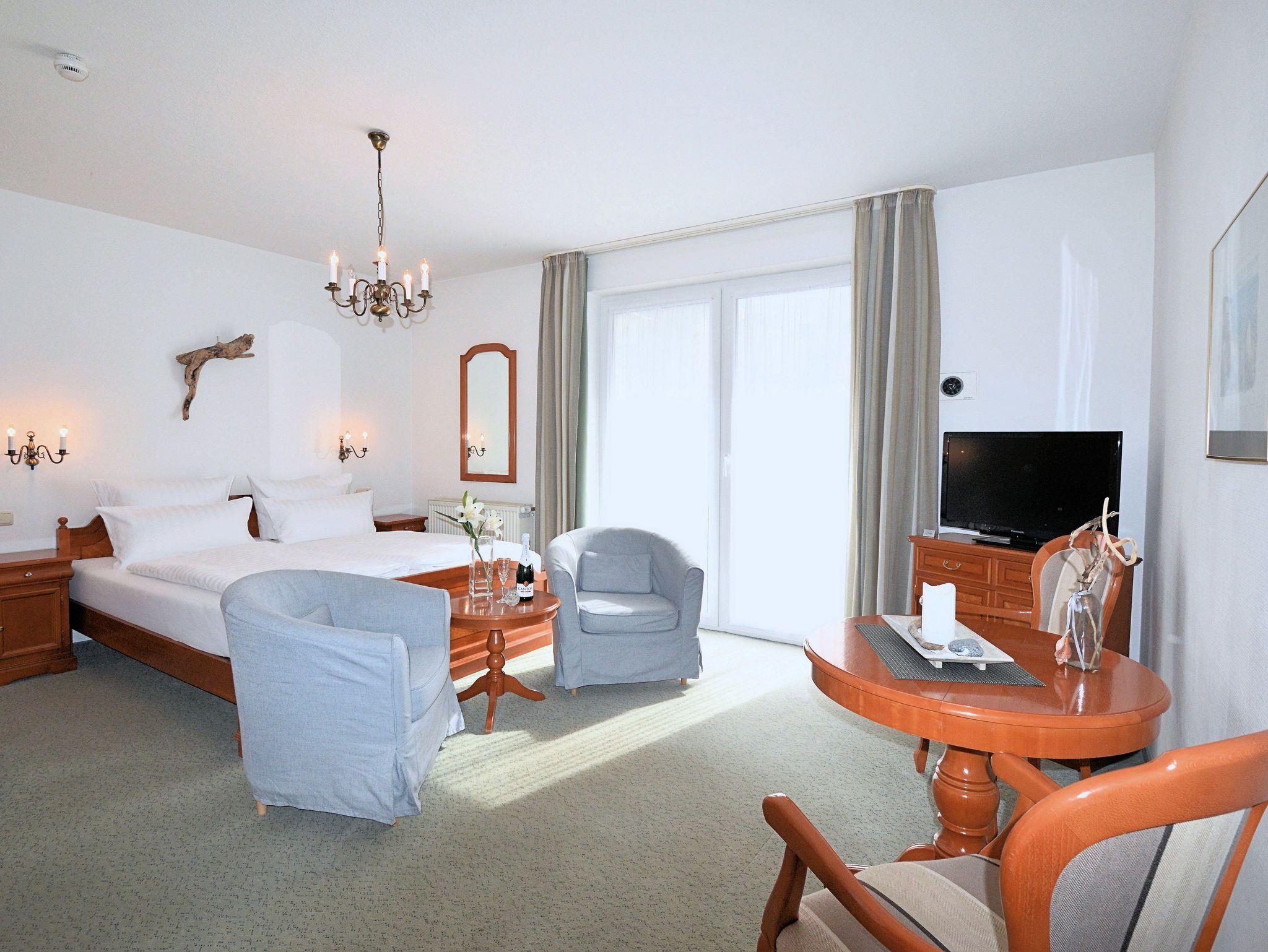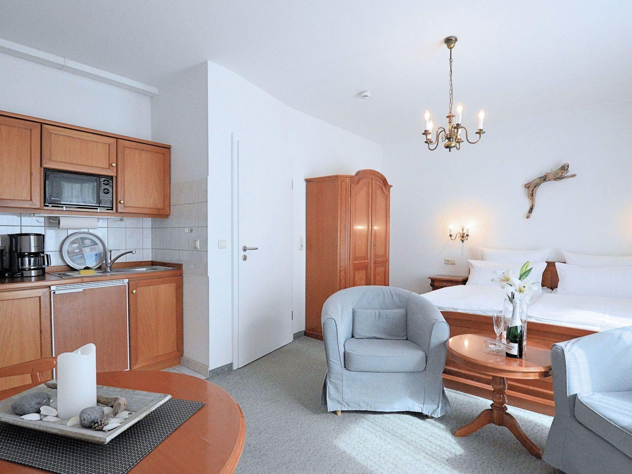 Das Appartement in Hochparterre mit 28m² befindet sich in der Appartement-Villa Steinfurth, welche direkt am Meer liegt. Dem Wohn-/ Schlafraum ist ein Balkon in Südostausrichtung vorgelagert. Der helle, große Wohnraum mit Schlafbereich, Küchenzeile, Essplatz und TV ist gemütlich und klassisch möbliert. Die Küchenzeile ist ausgestattet mit 4-Platten-Cerankochfeld, Mikrowelle, Kühlschrank, Kaffeemaschine, Wasserkocher und Toaster. Das Doppellbett mit einer Liegefläche von 180 x 200 cm schläft sich herrlich komfortabel. Ein Duschbad mit WC und Haartrockner ist ebenfalls vorhanden.