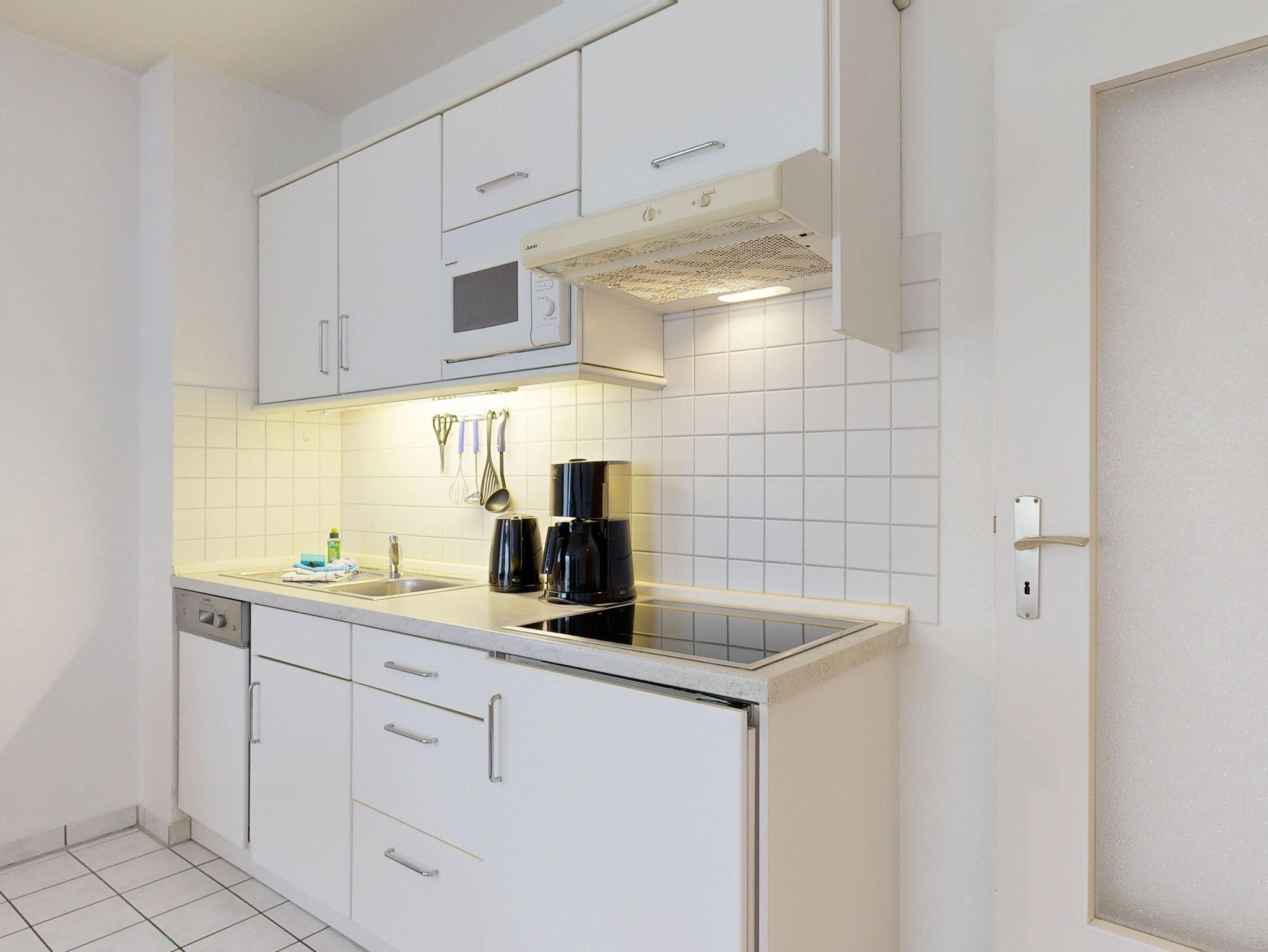 Küchenzeile mit Spülmaschine, Ceranfeld, Mikrowelle, Kaffeemaschine, Toaster und Kühlschrank mit Gefrierfach