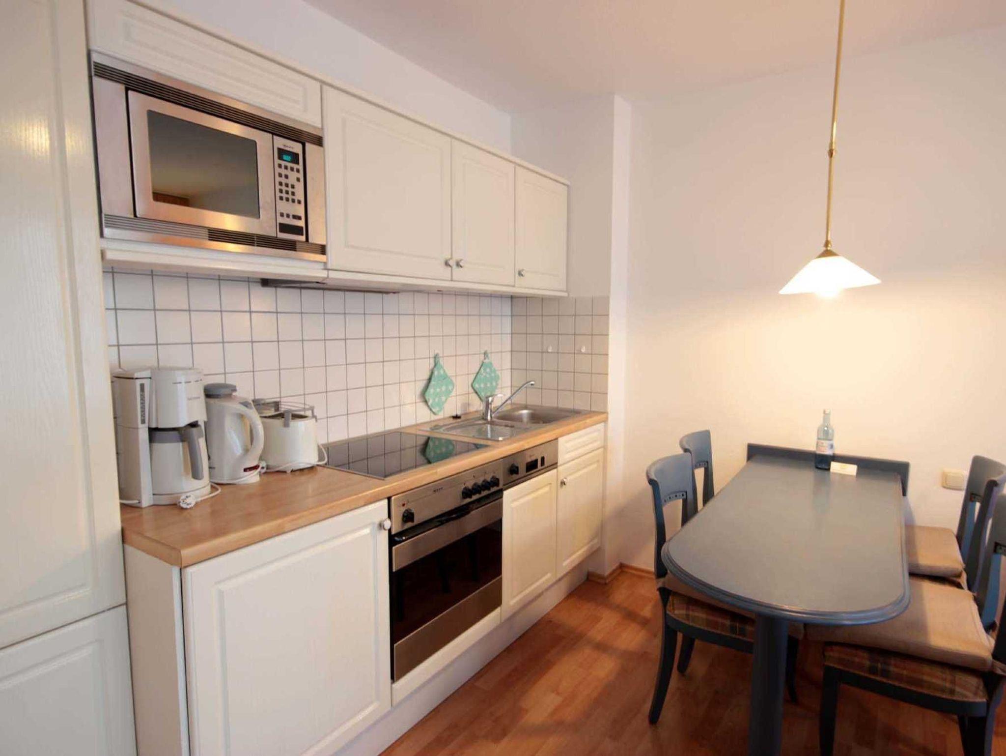 Dem hellen Wohnraum schließt sich die weiße Wohnküche und der Balkon an. Im separaten Schlafraum finden Sie ein Doppelbett und einen Kleiderschrank. Vom vorgelagerten Flur aus erreichen Sie das geräumige Duschbad. Im Wohnraum gibt es einen Essbereich und eine gemütliche Sitzecke mit Schlaffunktion sowie einen Fernseher, eine Stereo-Anlage sowie einen kostenfreien W-Lan-Zugang. Die Küche verfügt über einen Backofen, eine Mikrowelle, Kühlschrank, Geschirrspüler, Kaffeemaschine, Toaster und Wasserkocher. Ein PKW-Stellplatz steht Ihnen in dem ca. 300 m entfernten Parkhaus zur Verfügung.