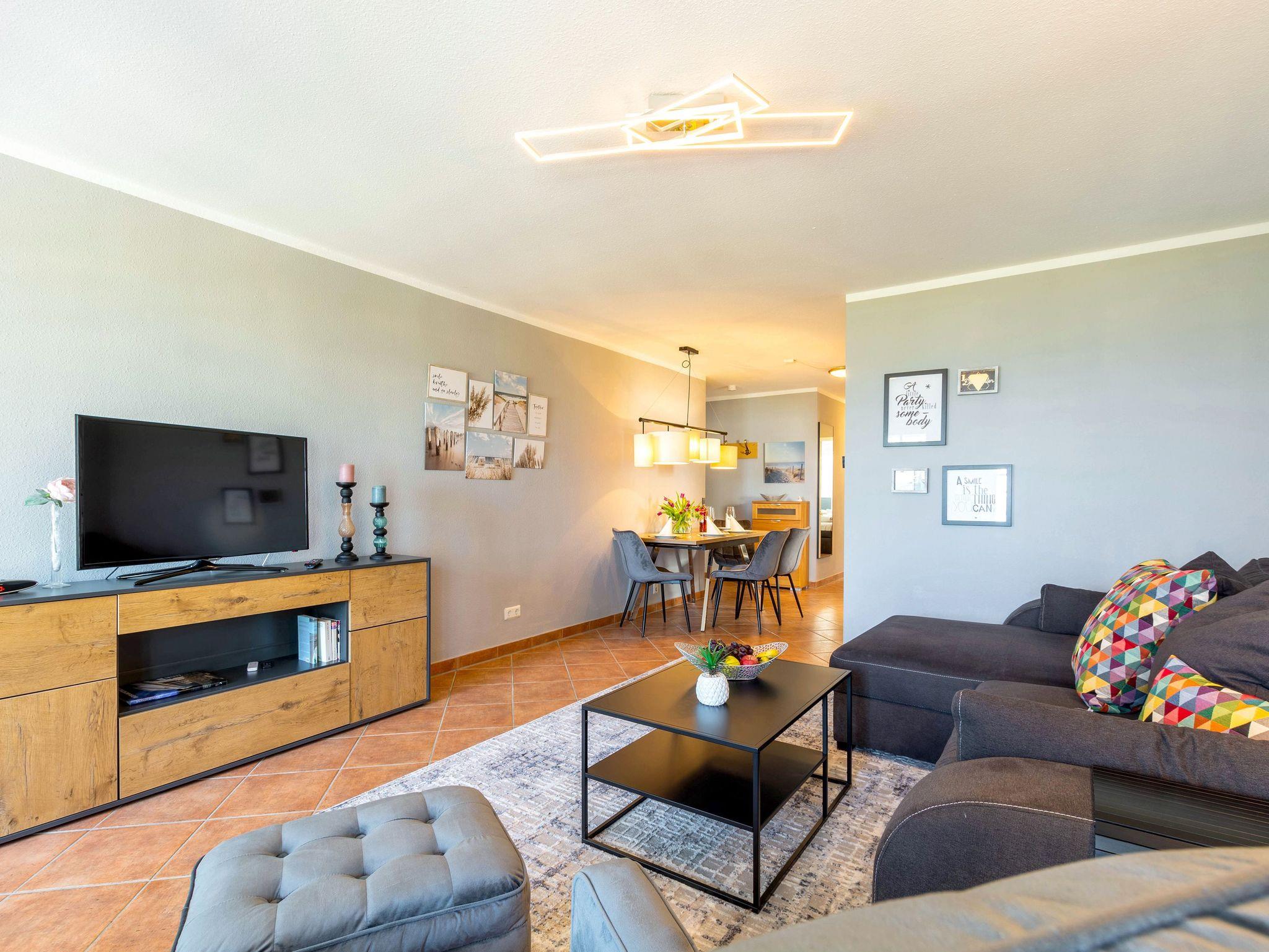 Der großzügig geschnittene Wohnraum mit Essecke verfügt über ein bequemes Schlafsofa und lädt zu gemütlichen Abenden ein. Für eine angenehme Unterhaltung sorgen der Flachbildfernseher und der kostenlose WLAN-Zugang. Vom Wohnzimmer erhält man Zugang zu dem großzügigen Balkon mit frontalem Meerblick.