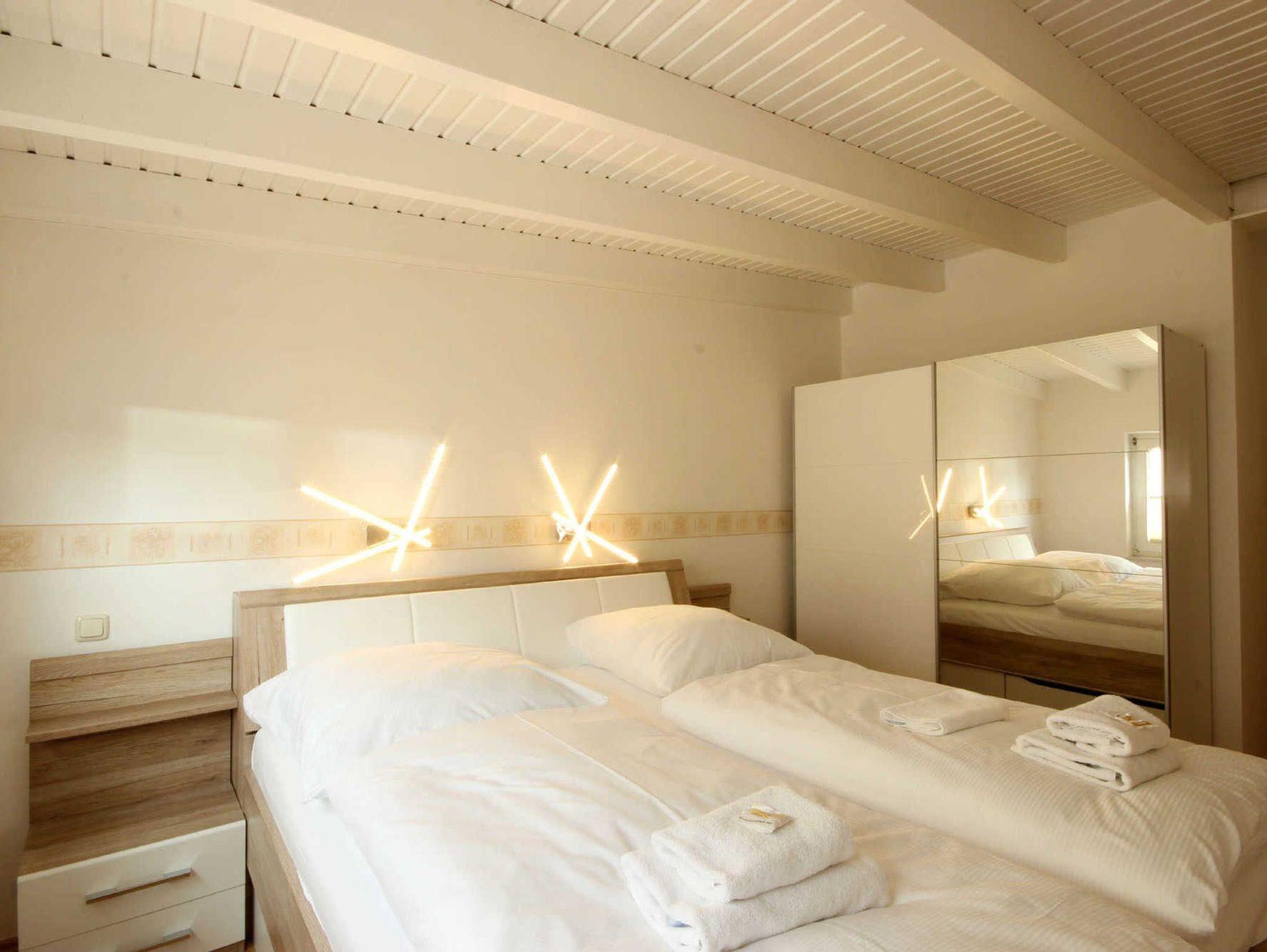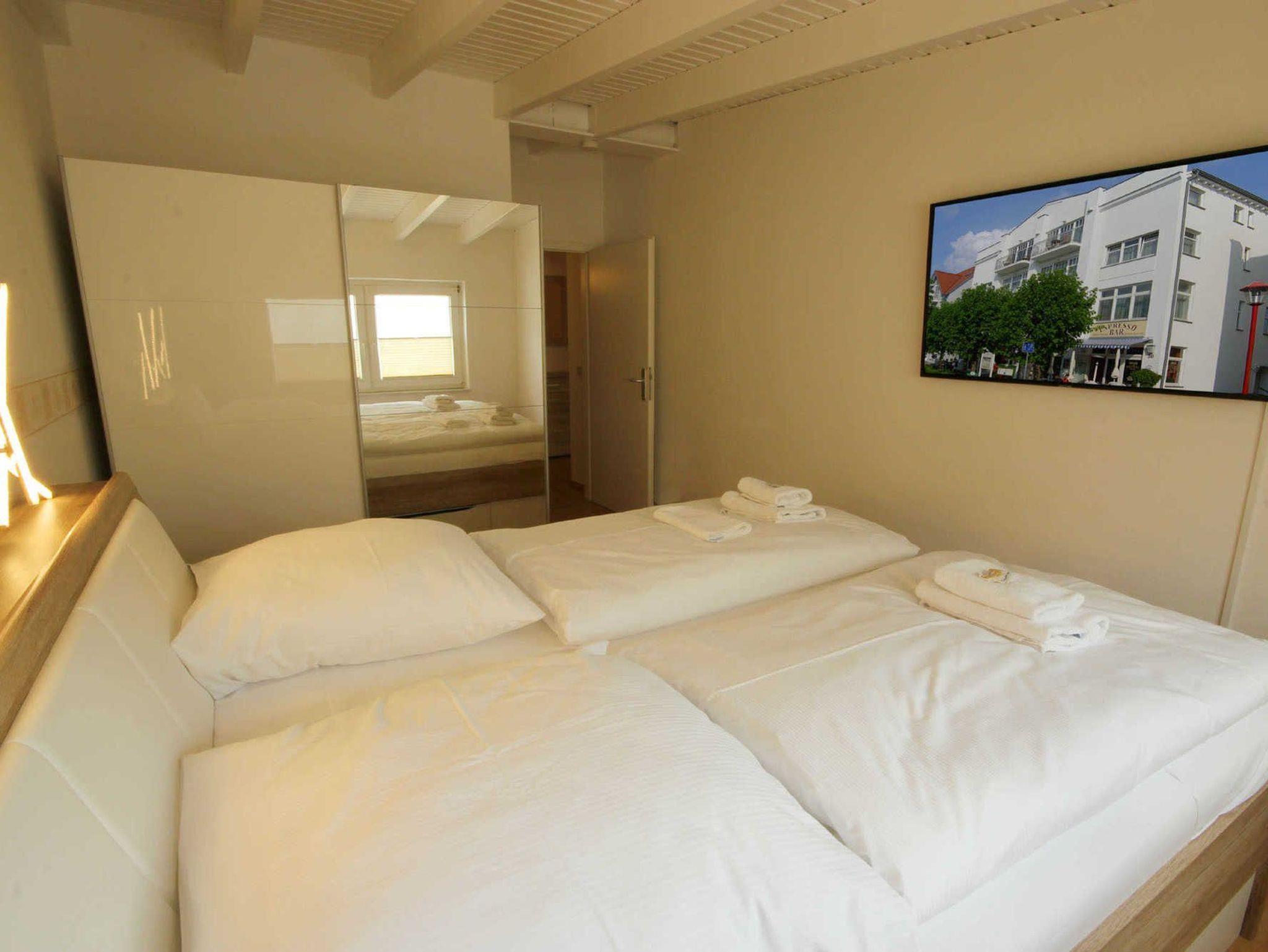 Ihre attraktive und großzügige 2-Zimmerwohnung 23RB38 mit wohnungseigenen Strandkorb (Mai-Sept. 2025) hat eine Größe von ca. 50 qm und ist für 4 Personen eingerichtet. Die Nichtraucherwohnung befindet sich im 3. Obergeschoss des Hauses. Dem hellen Wohnraum schließt sich die weiße Wohnküche und der Essbereich an. Im separaten und geräumigen Schlafraum finden Sie ein modernes Doppelbett, einen Kleiderschrank sowie einen großen Flachbild-TV. Vom vorgelagerten Flur aus erreichen Sie das Badezimmer mit Waschtisch, Dusche, Wanne, WC und Fön. Im Wohnraum gibt es eine gemütliche Sitzecke mit Schlaffunktion, WLAN sowie einen weiteren Flachbildfernseher. Die Küche verfügt über einen Backofen, eine Mikrowelle, Kühlschrank, Geschirrspüler, Kaffeemaschine, Toaster und Wasserkocher. Haustiere sind herzlich willkommen! Ein PKW-Stellplatz steht Ihnen auf dem Parkplatz Zentrum (ca. 8 Gehminuten) zur Verfügung.