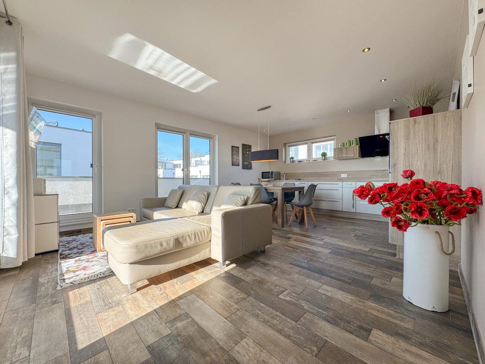 Das Apartment Horizont-Loft in Binz bietet stilvollen Komfort mit großer Dachterrasse und exklusiver Ausstattung.