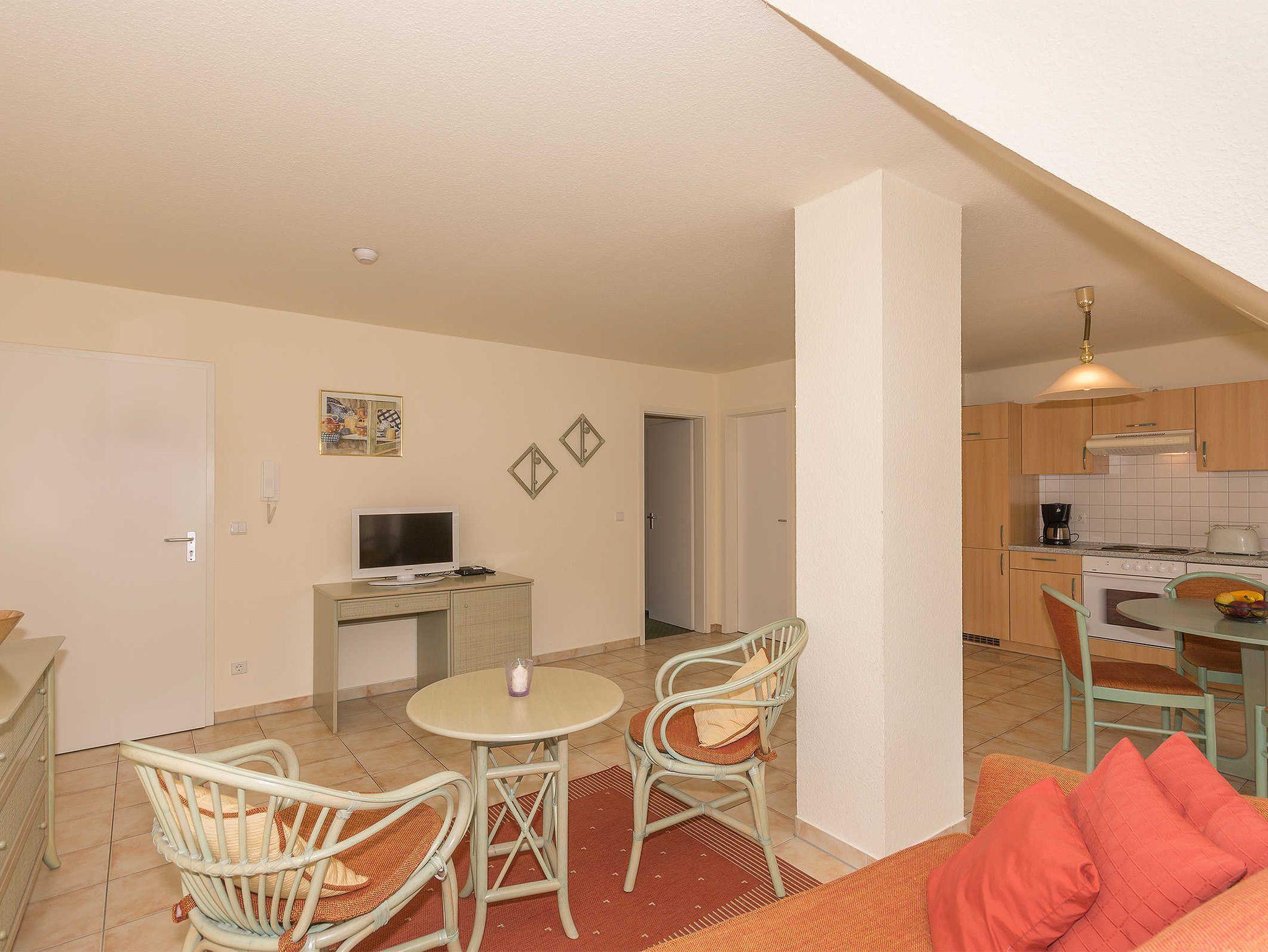 Die Zweiraumwohnungen verfügen über ein Wohn-/ Essbereich, einem Schlafzimmer mit Doppelbett und einem Duschbad.
