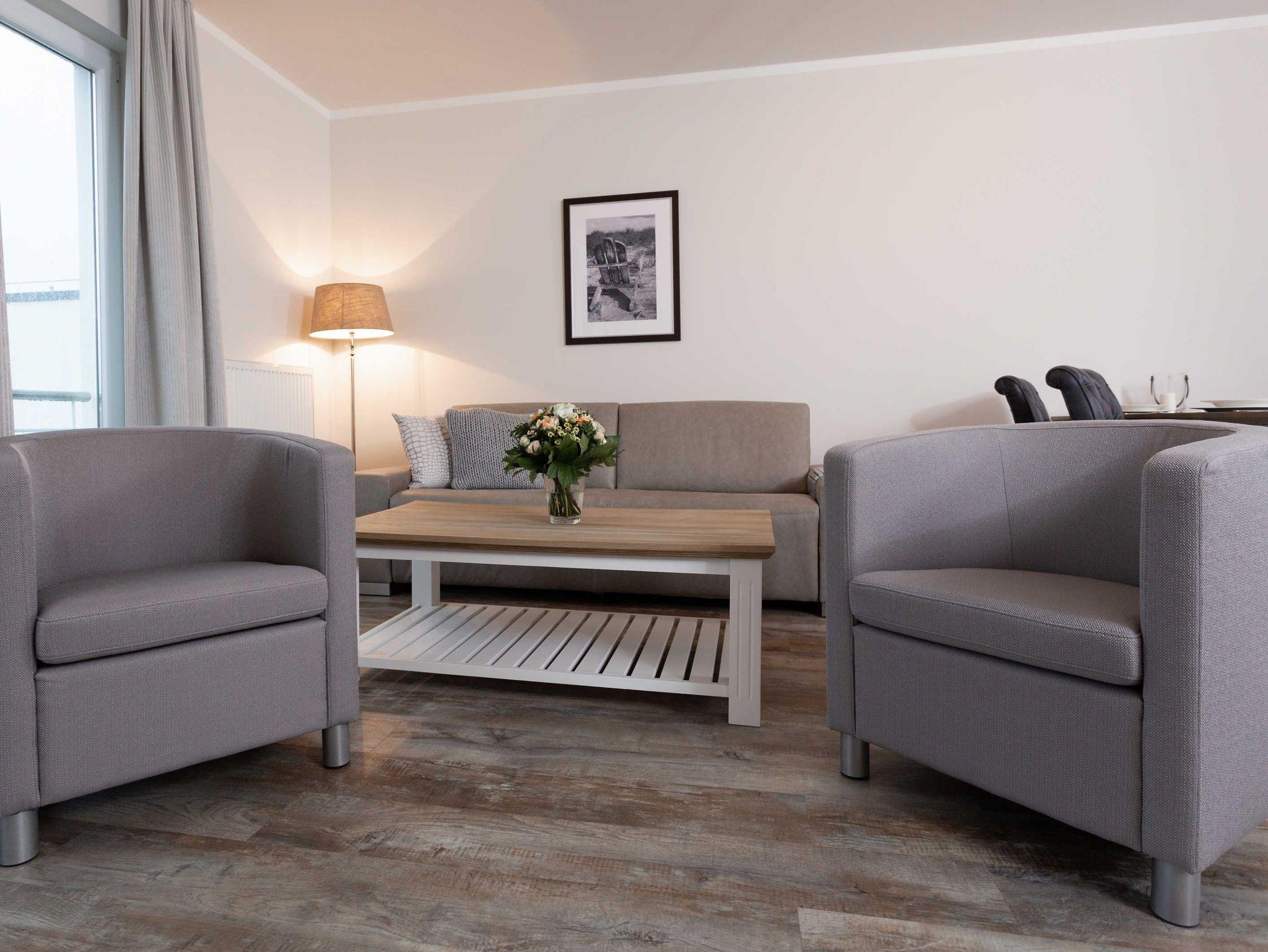 Wohnzimmer mit Couchgarnitur (Schlafcouch für 2 Personen), Sessel, Flachbild-TV, Radio, Internetzugang (WLAN inkl.), Esstisch