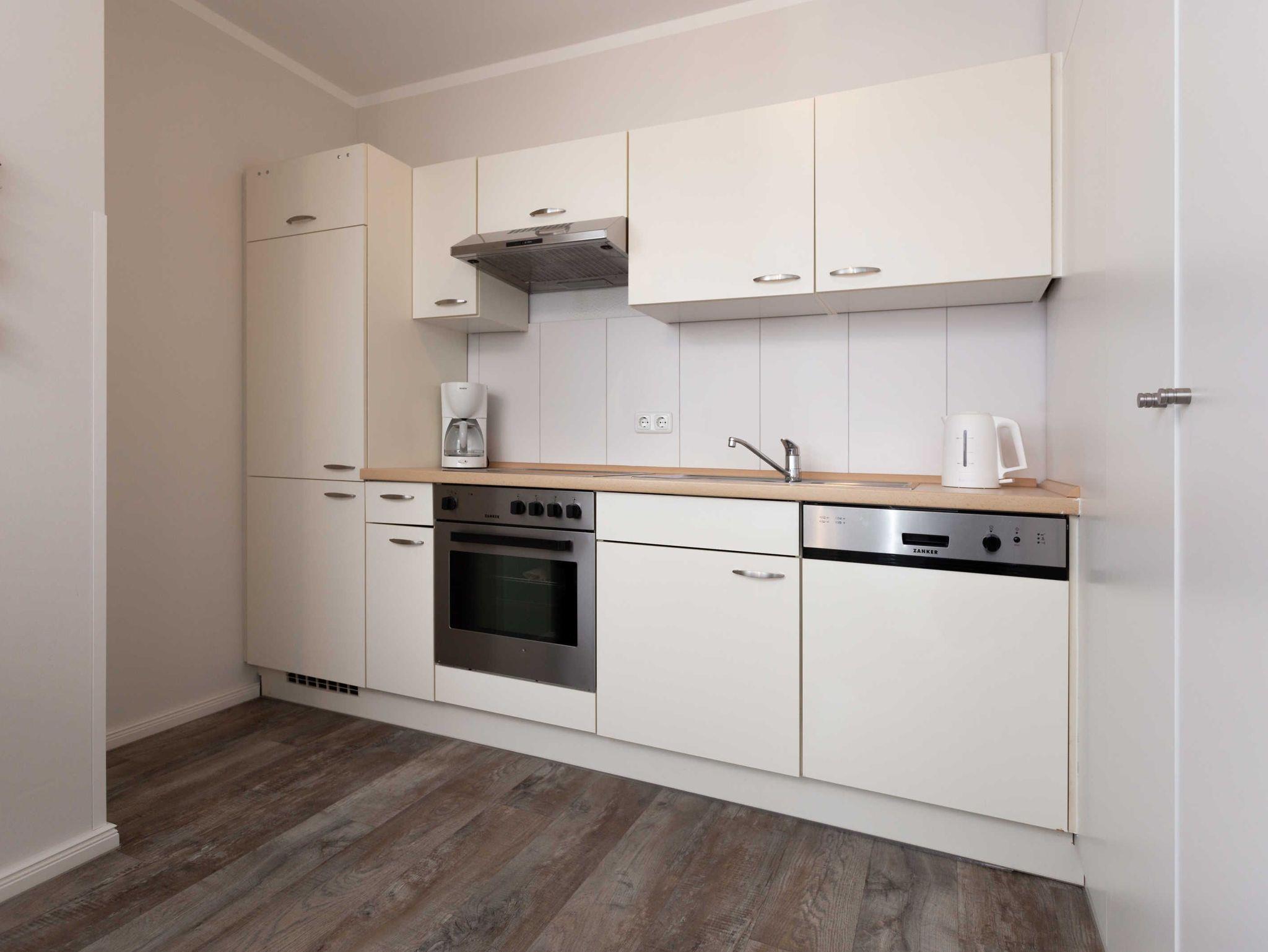 Küche mit Ceranfeld, Kühlschrank mit Gefrierfach, Backofen, Spülmaschine, Toaster, Wasserkocher, Kaffeemaschine