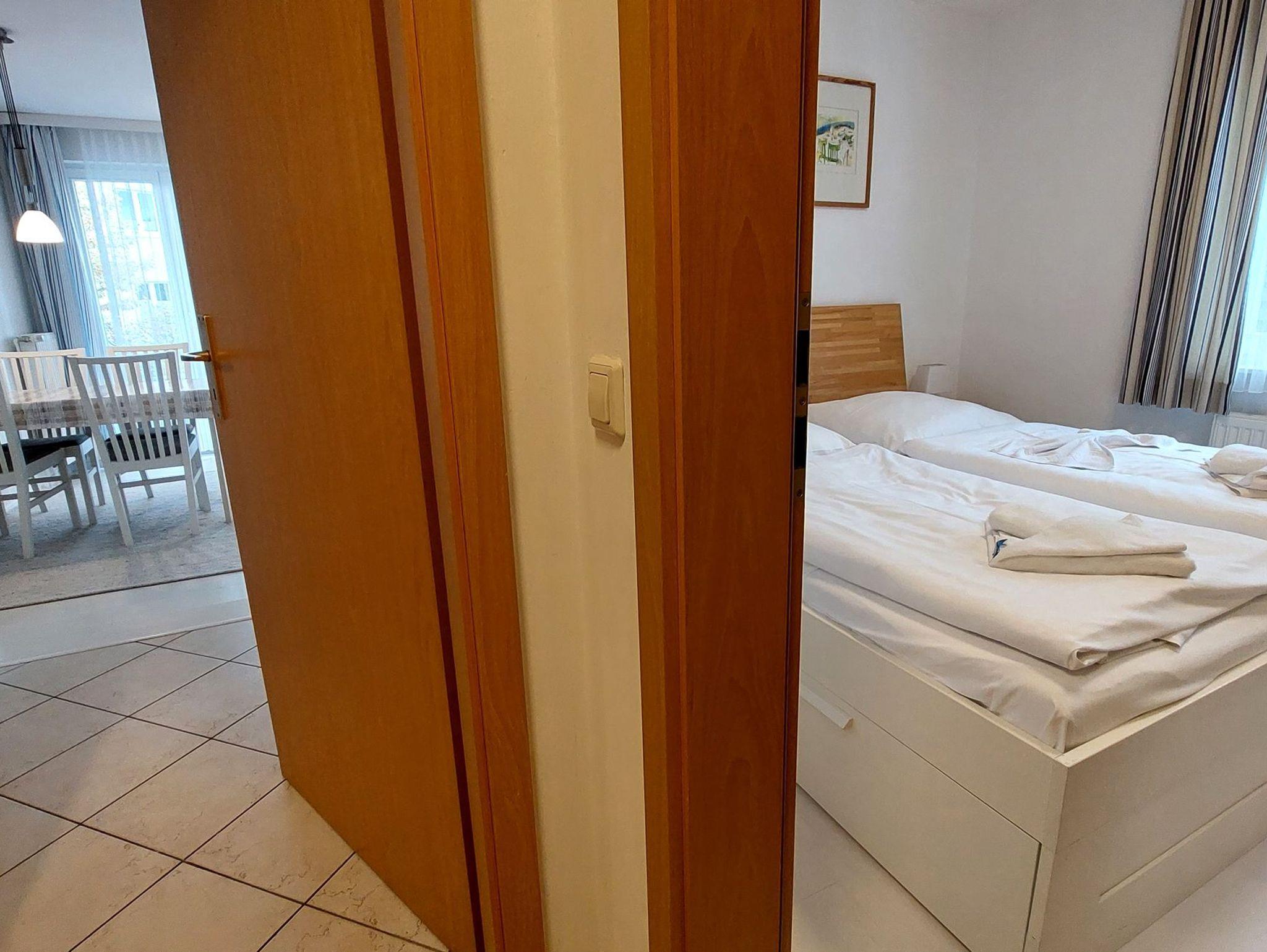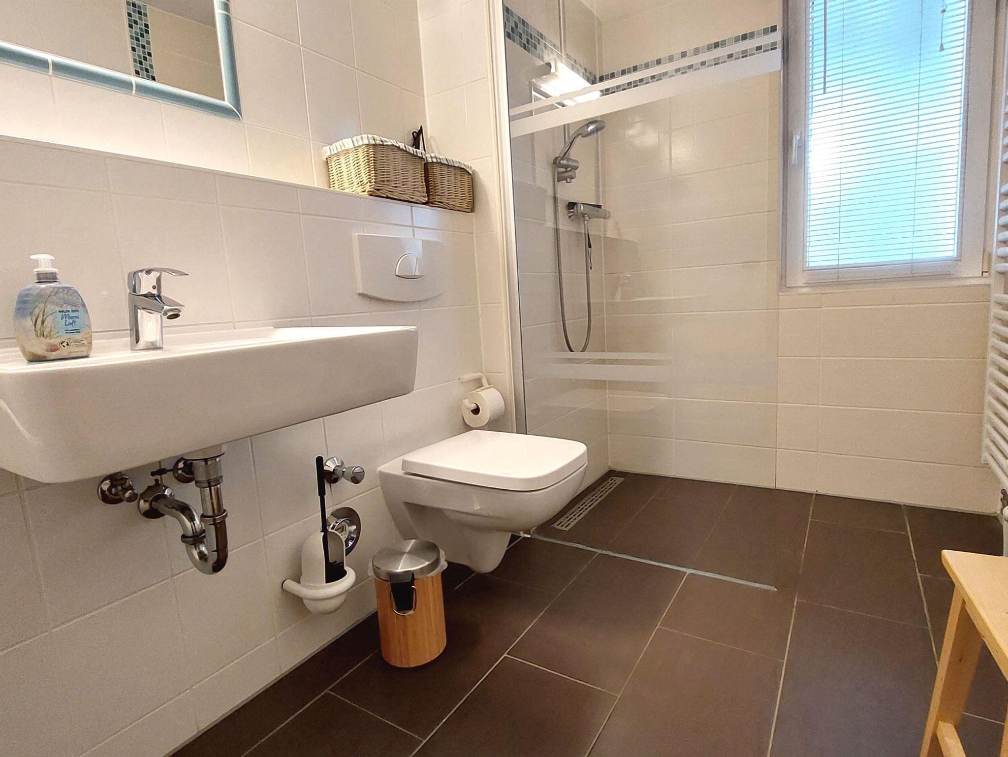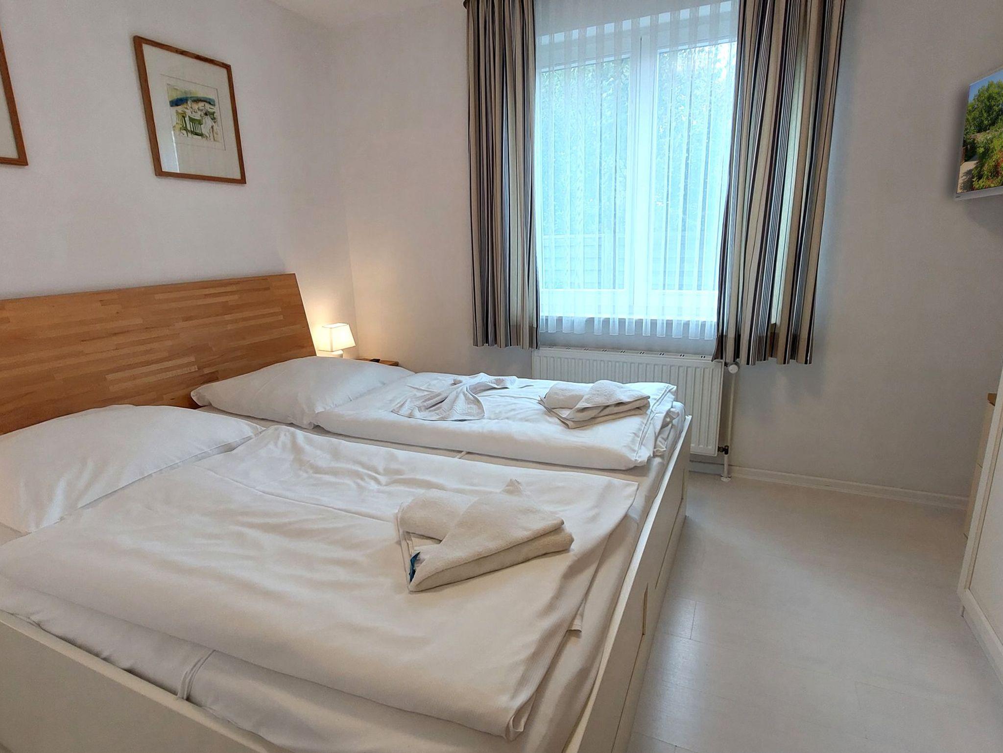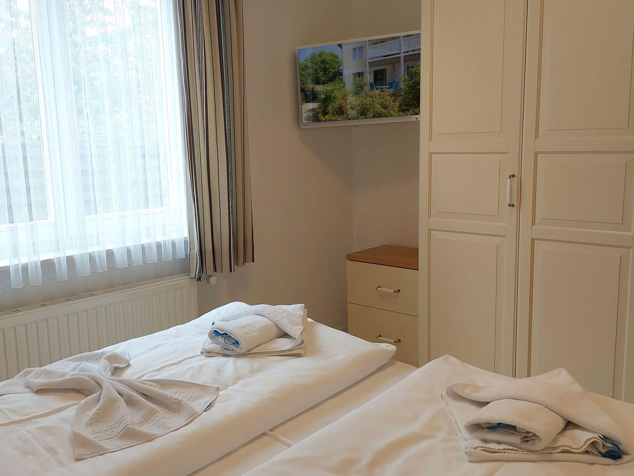 Der Schlafraum ist mit einem Doppelbett, Kleiderschrank sowie einem zusätzlichen TV ausgestattet. Im Badezimmer erwartet Sie eine ebenerdige Dusche, Haartrockner, eine Handtuchheizung und WC. Für Ihren PKW steht ein Stellplatz auf dem Grundstück zur Verfügung. Ein abschließbarer Fahrradkeller befindet sich direkt im Haus.