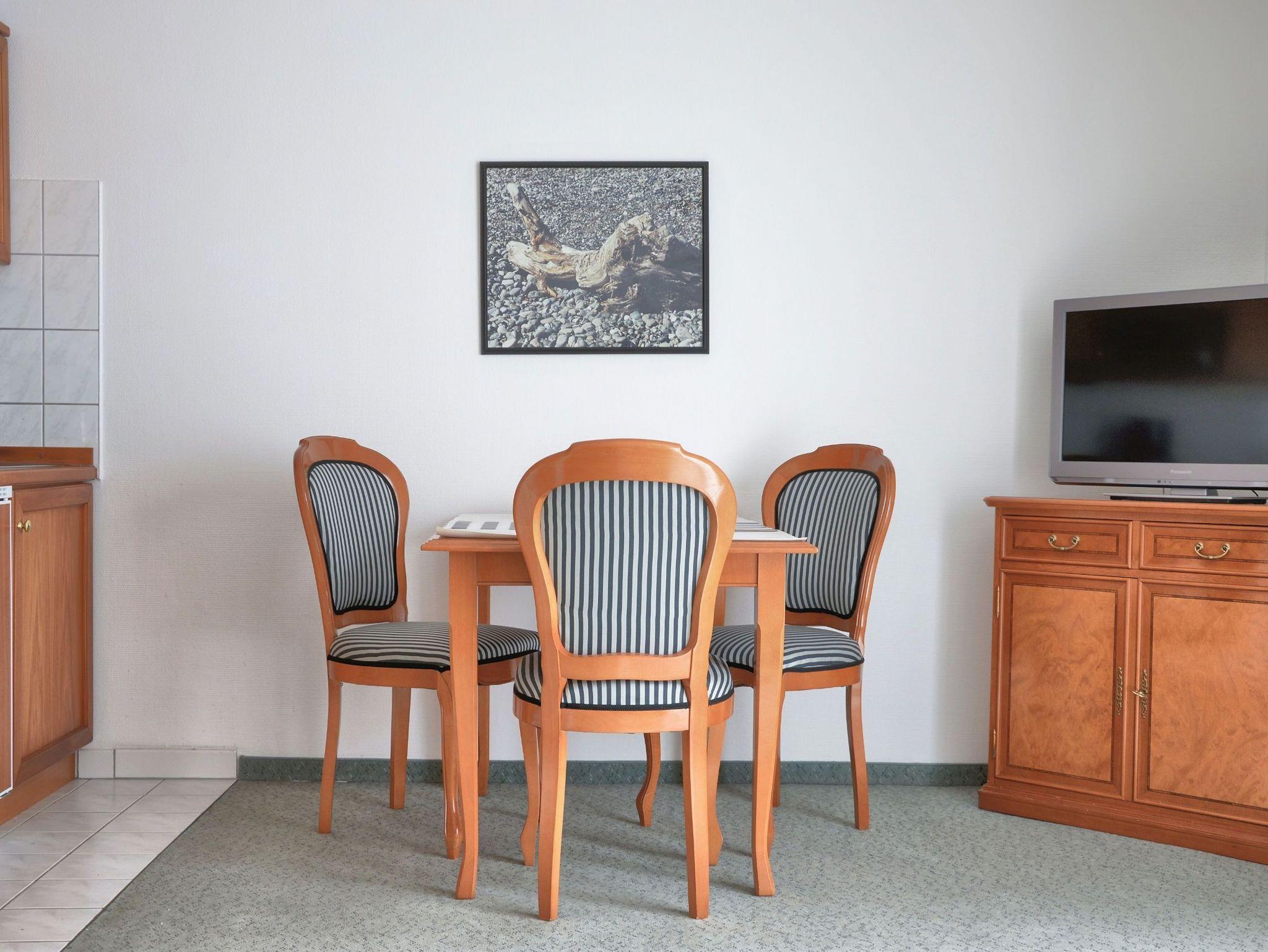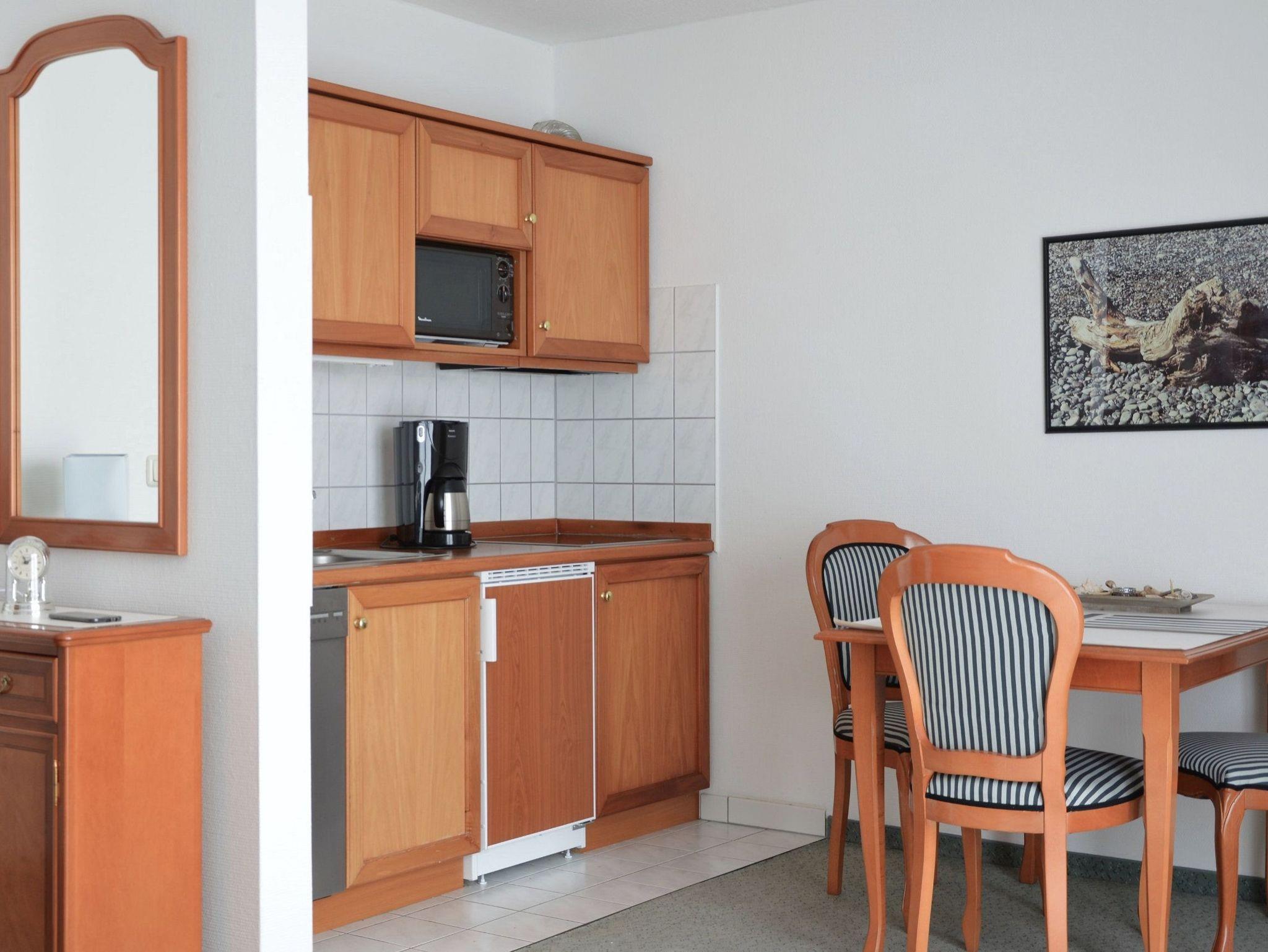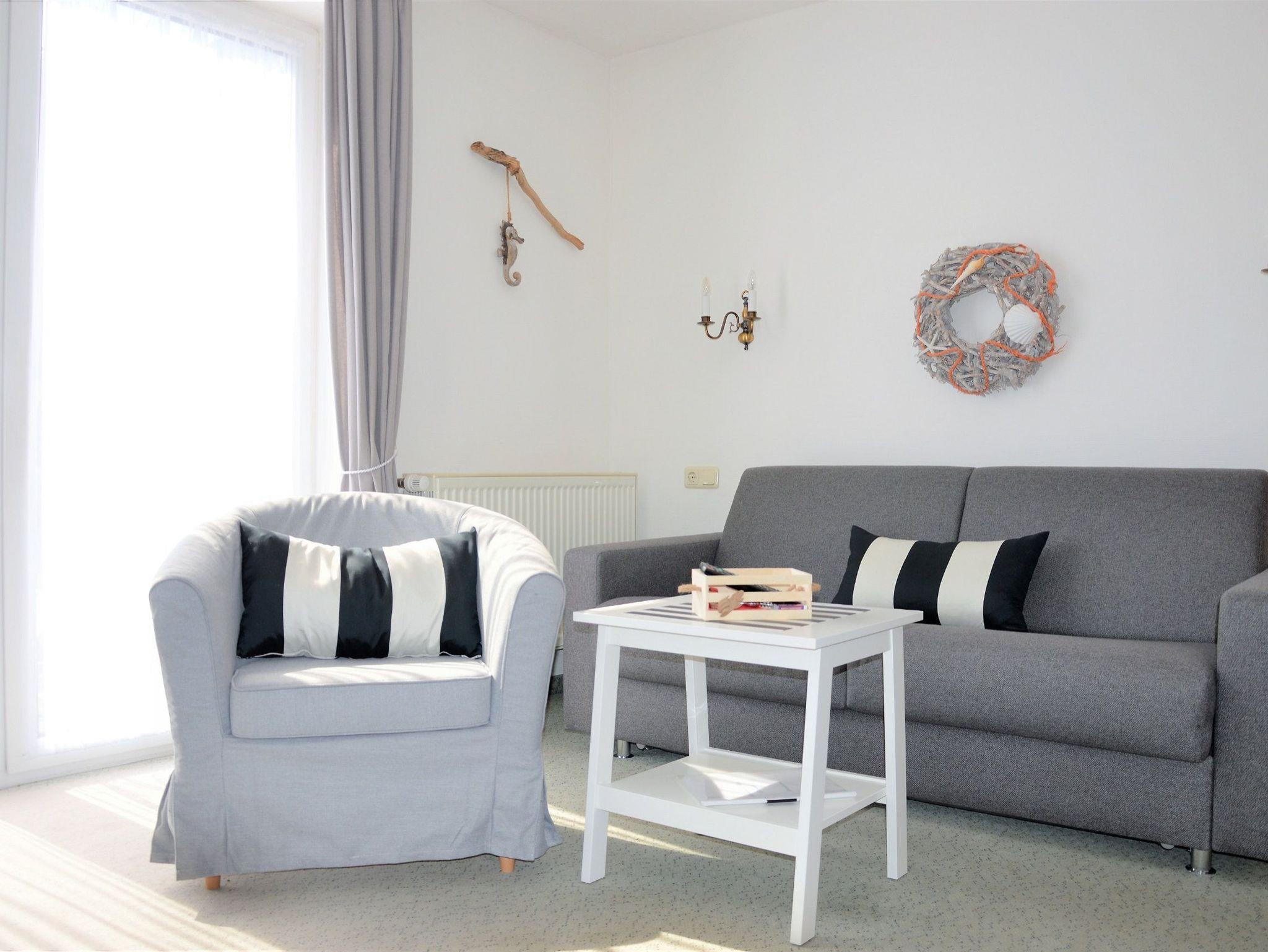 Das Apartment im 2. Obergeschoss mit 45m² befindet sich in der Apartment-Villa Steinfurth, welche direkt am Meer liegt und bietet Platz für 2 Personen. Vom Wohnraum aus erreicht man einen möblierten Balkon in Südostausrichtung mit seitl. Blick auf das Meer. Der helle, große Wohnbereich mit Küchenzeile, Eßplatz und TV ist gemütlich und modern möbliert. Die Küchenzeile ist ausgestattet mit 4-Platten-Cerankochfeld, Mikrowelle, Geschirrspüler, Kühlschrank, Kaffeemaschine, Wasserkocher und Toaster. Das Schlafzimmer verfügt über ein Doppellbett mit einer Liegefläche von 180 x 200 cm. Ein Duschbad mit WC und Haartrockner ist ebenfalls vorhanden.