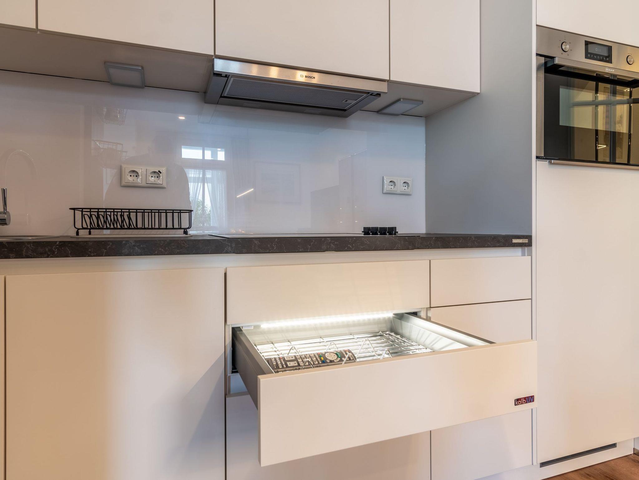 Im Wohn/Essbereich ist eine umfangreich ausgestattete Küchenzeile integriert. Ein Highlight davon ist die Desinfizierungsstation für alltägliche Gebrauchsgegenstände, z.B. Handys, Fernbedienungen, Kinderspielzeug etc.