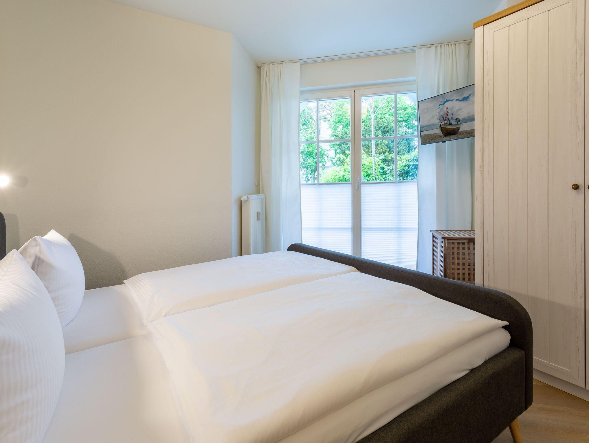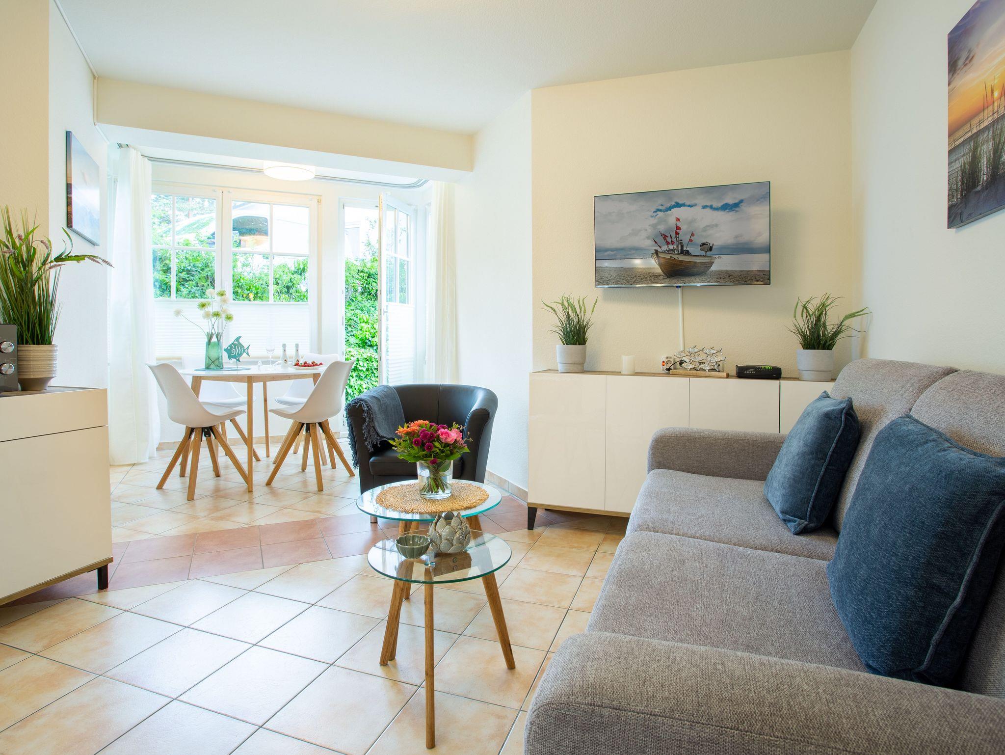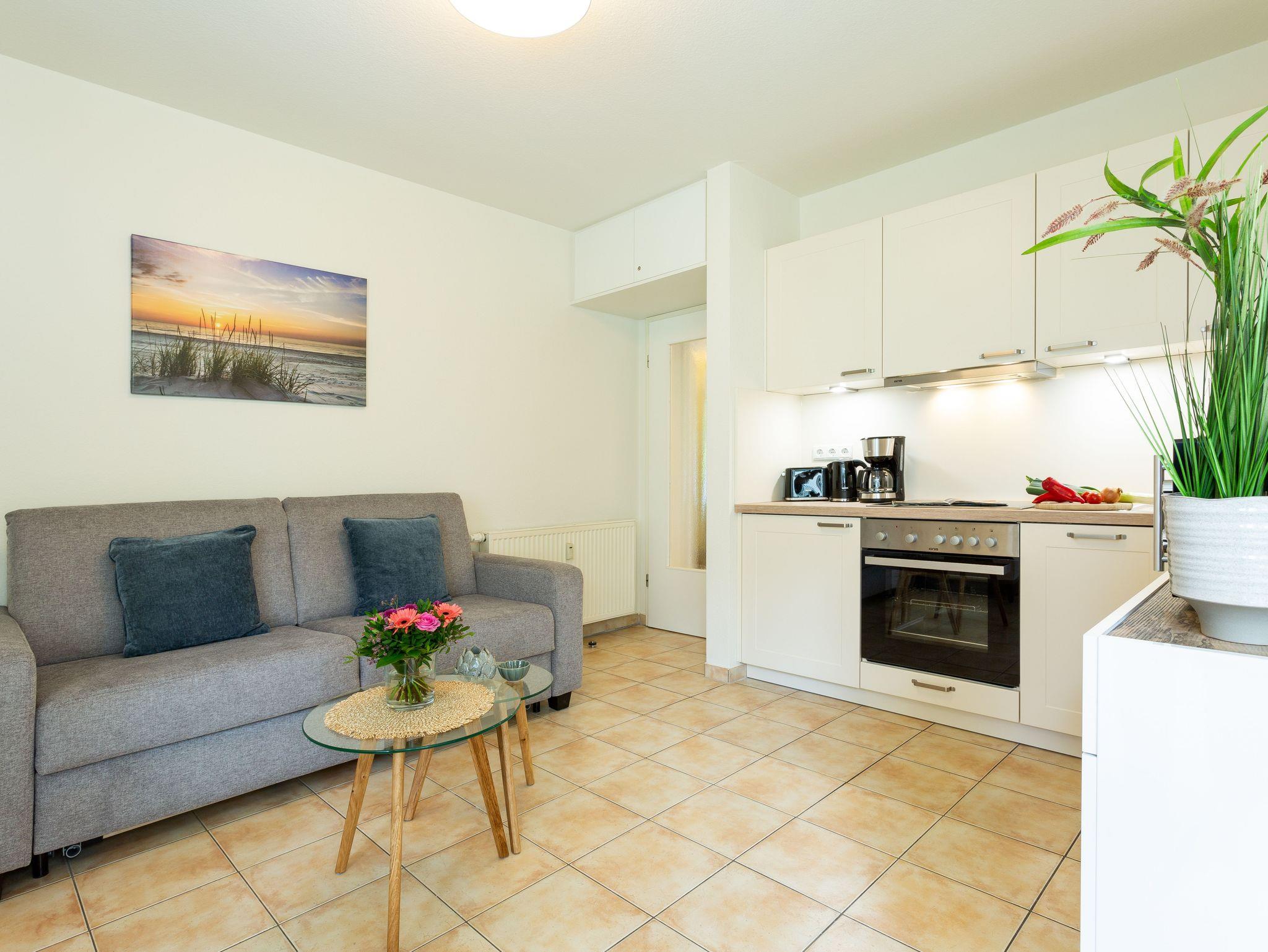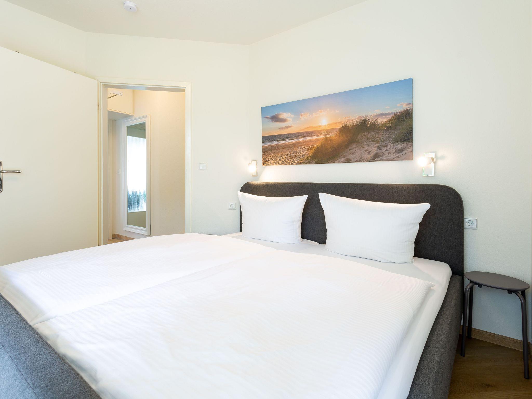 Insgesamt sind es nur 200 Meter bis zum Strand. Sie hat eine Größe von ca. 45 m² und verfügt über einen Balkon nach Osten und eine Terrasse nach Süden. Die Wohnung hat neben dem Wohnraum mit integrierter Kochzeile und einem Schlafsofa mit bequemer Kaltschaumatratze, einen separaten Schlafraum mit Doppelbett mit einer hochwertigen Taschenfedernkernmatrazte, einen Flur und ein Badezimmer mit Waschtisch, Badewanne , Fön und WC.