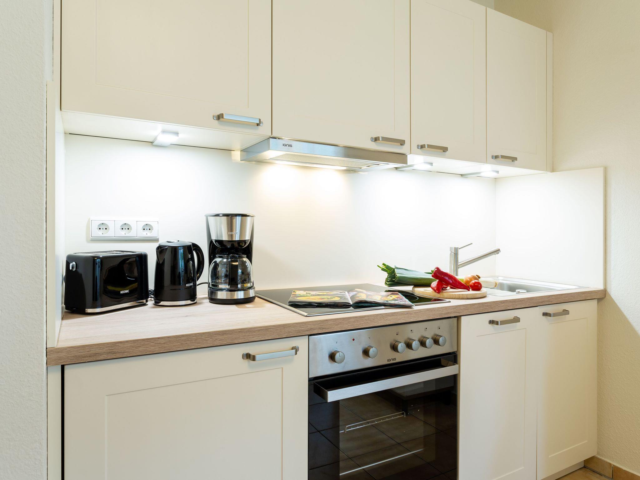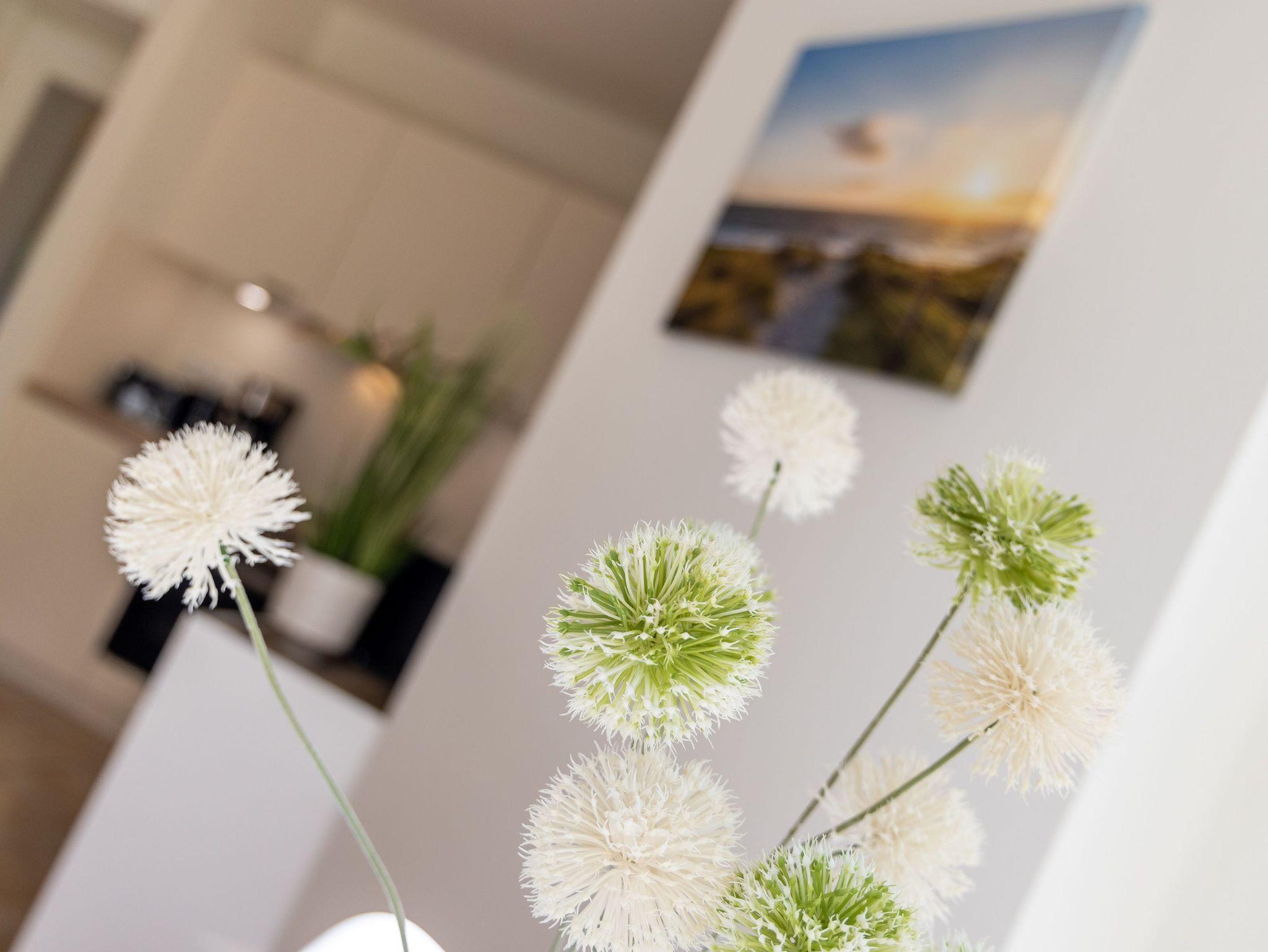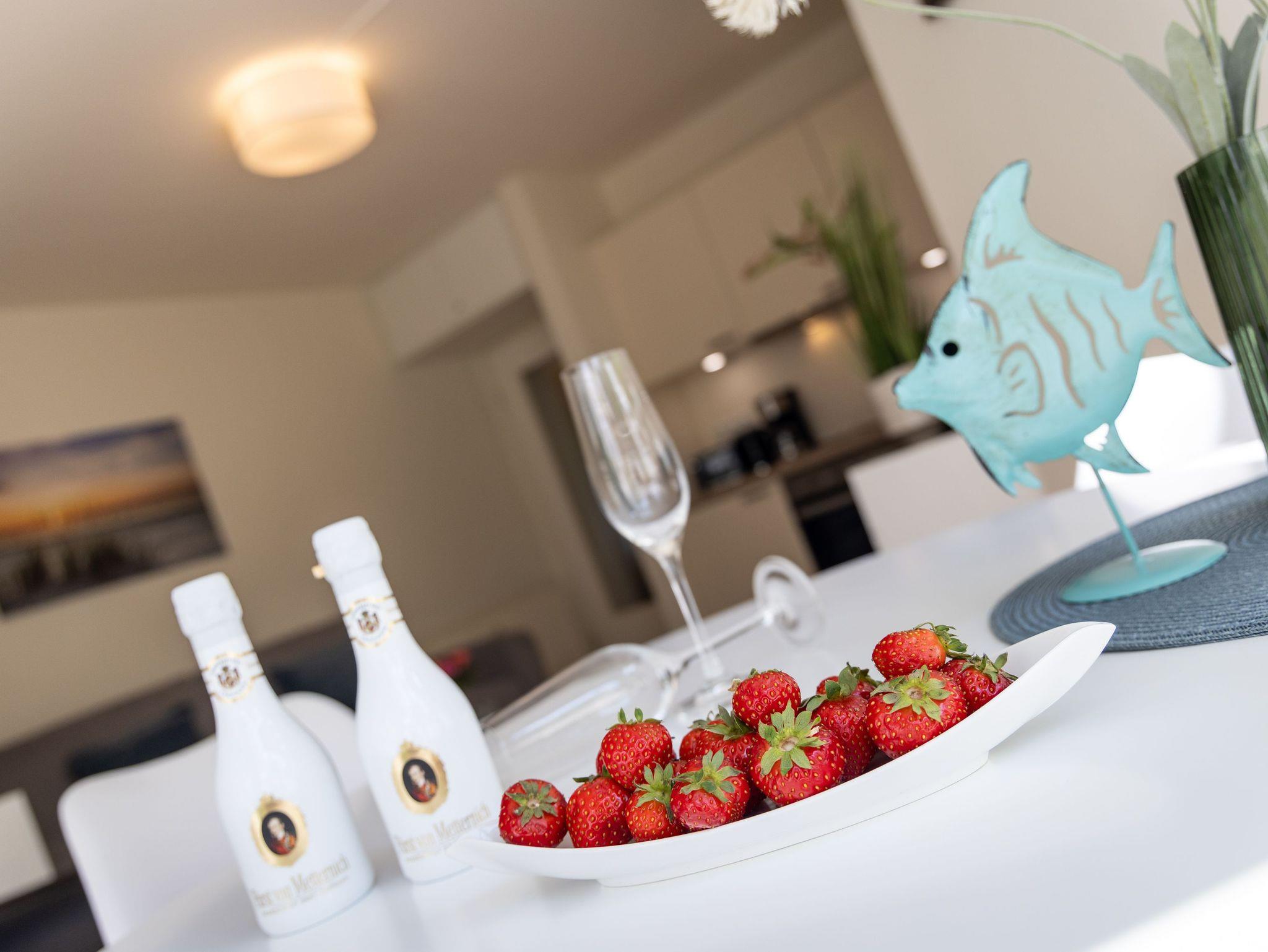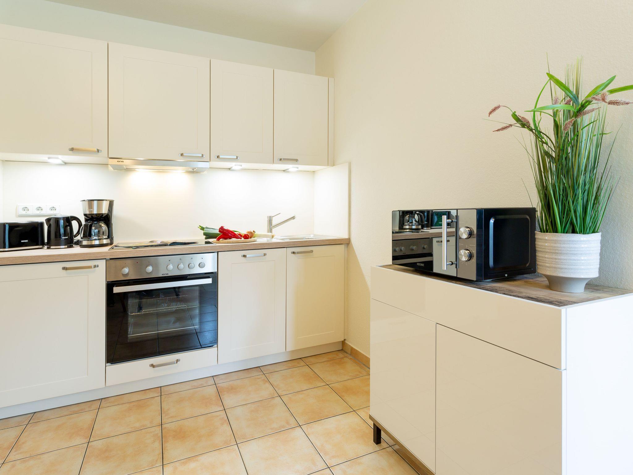 Insgesamt sind es nur 200 Meter bis zum Strand. Sie hat eine Größe von ca. 45 m² und verfügt über einen Balkon nach Osten und eine Terrasse nach Süden. Die Wohnung hat neben dem Wohnraum mit integrierter Kochzeile und einem Schlafsofa mit bequemer Kaltschaumatratze, einen separaten Schlafraum mit Doppelbett mit einer hochwertigen Taschenfedernkernmatrazte, einen Flur und ein Badezimmer mit Waschtisch, Badewanne , Fön und WC.