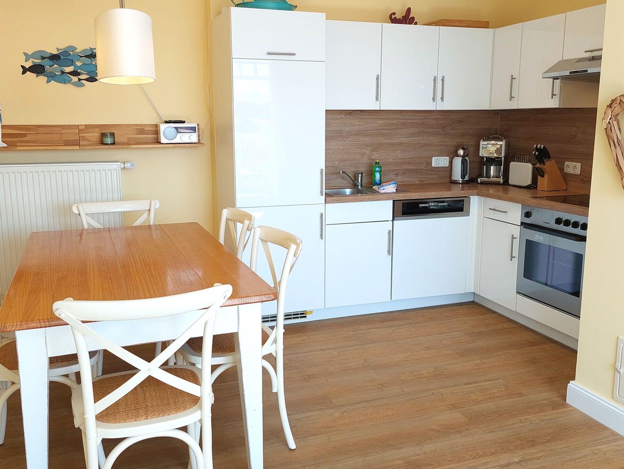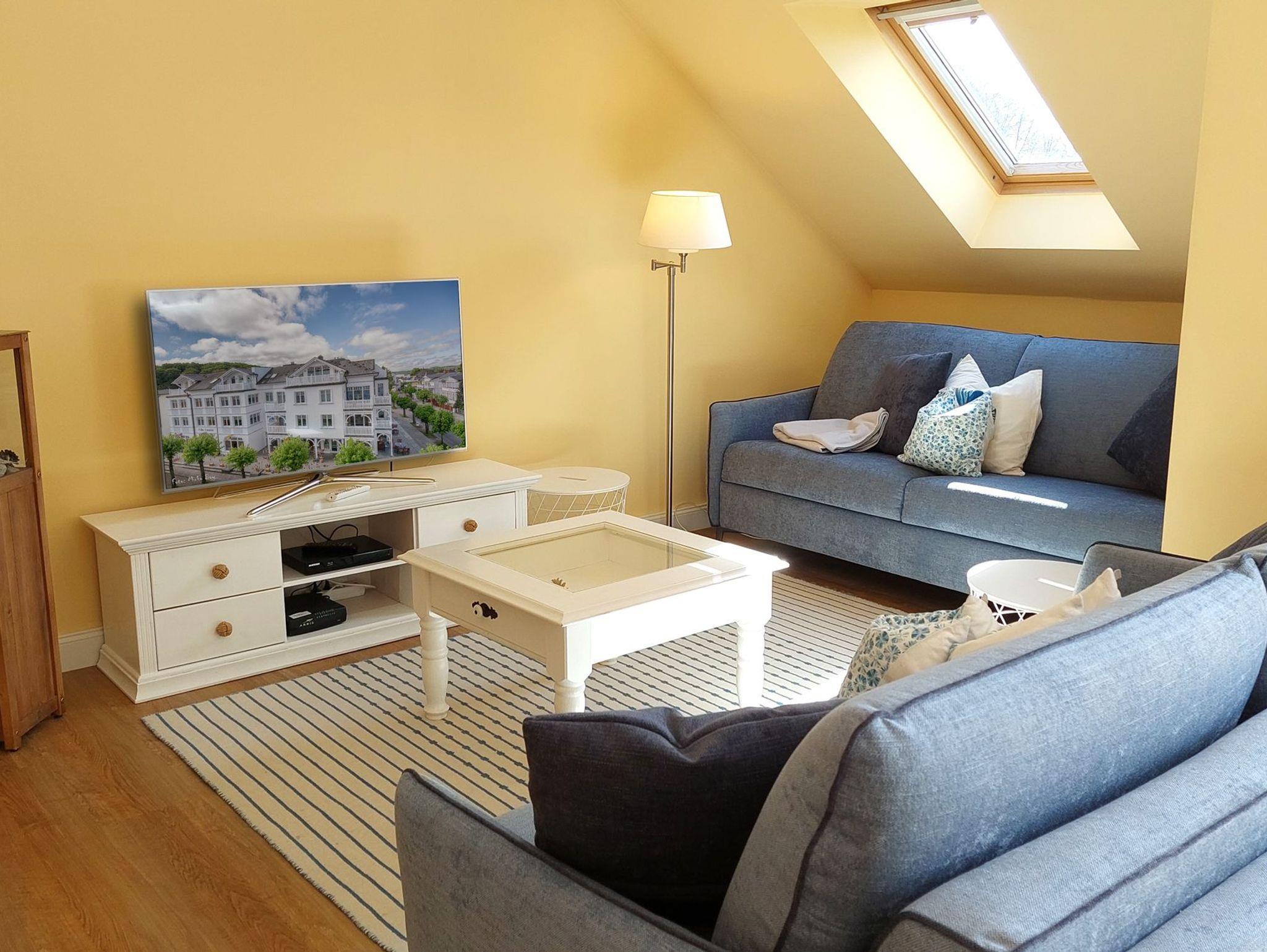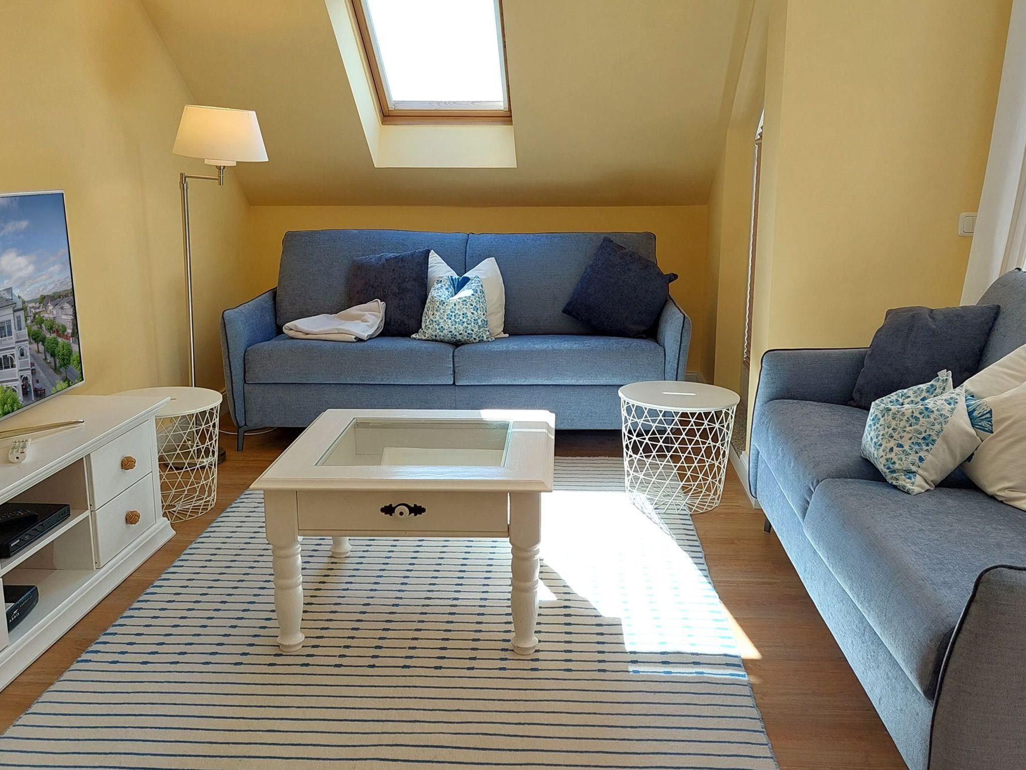Im Wohnraum können auf dem großen Schlafsofa zwei weitere Personen schlafen. Die gesamte Wohnung ist mit hochwertigen Möbeln aus weiß gebürsteter Pinie im Villagestil eingerichtet. Im Wohnraum befindet sich ein Smart-TV und Radio/CD-Spieler, Sitz- und Essplatz sowie die halboffene Küche mit Geschirrspülmaschine, Backofen, Herd, Kühlschrank und diversen Kleingeräten.